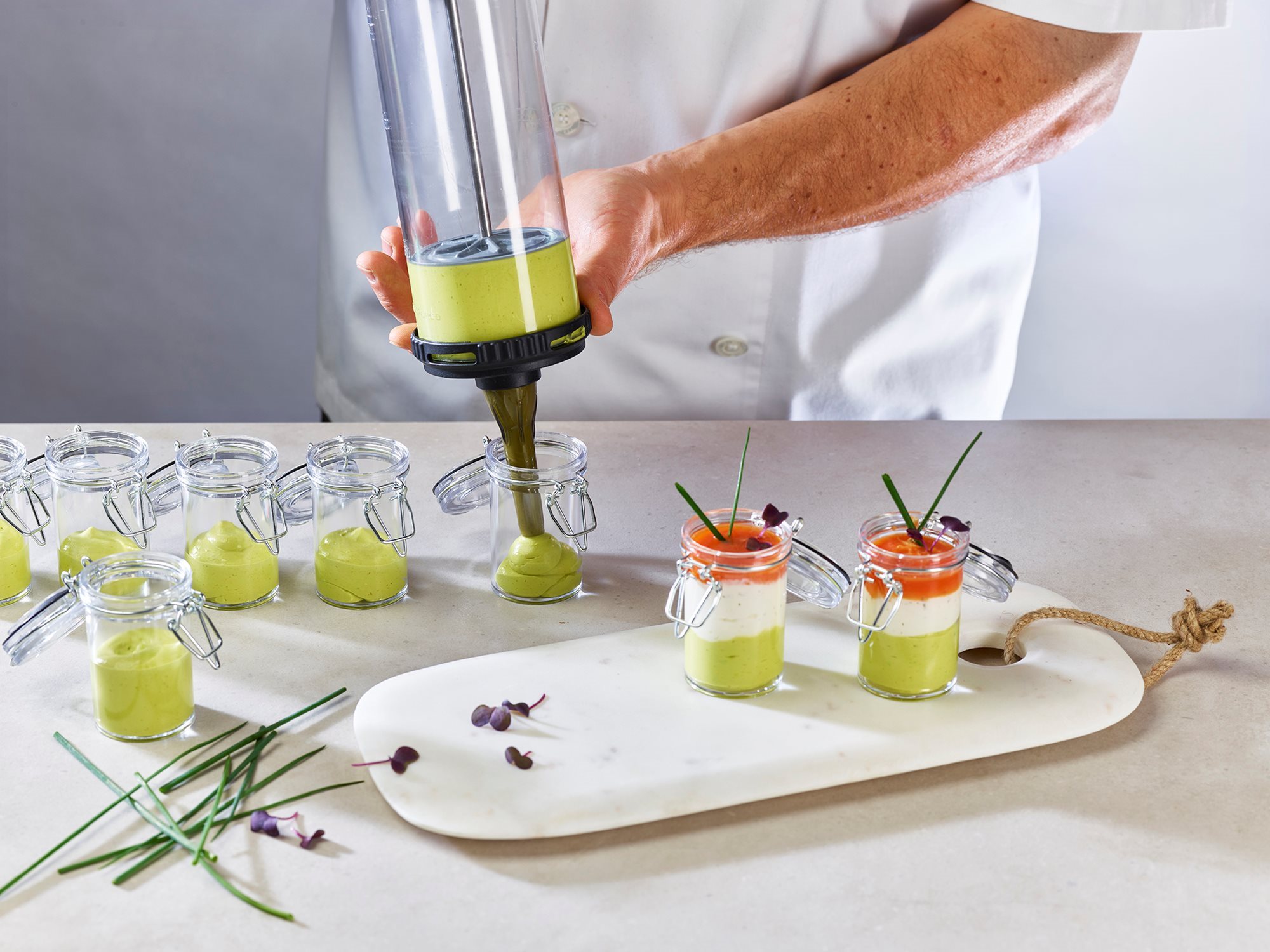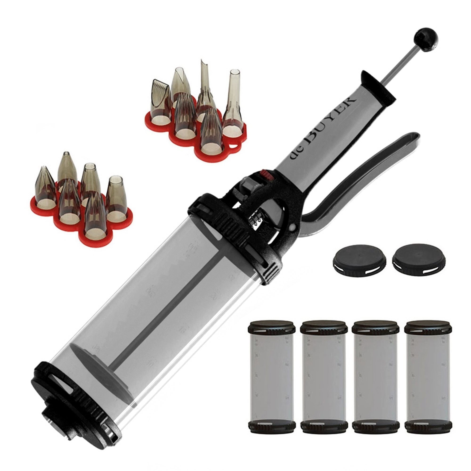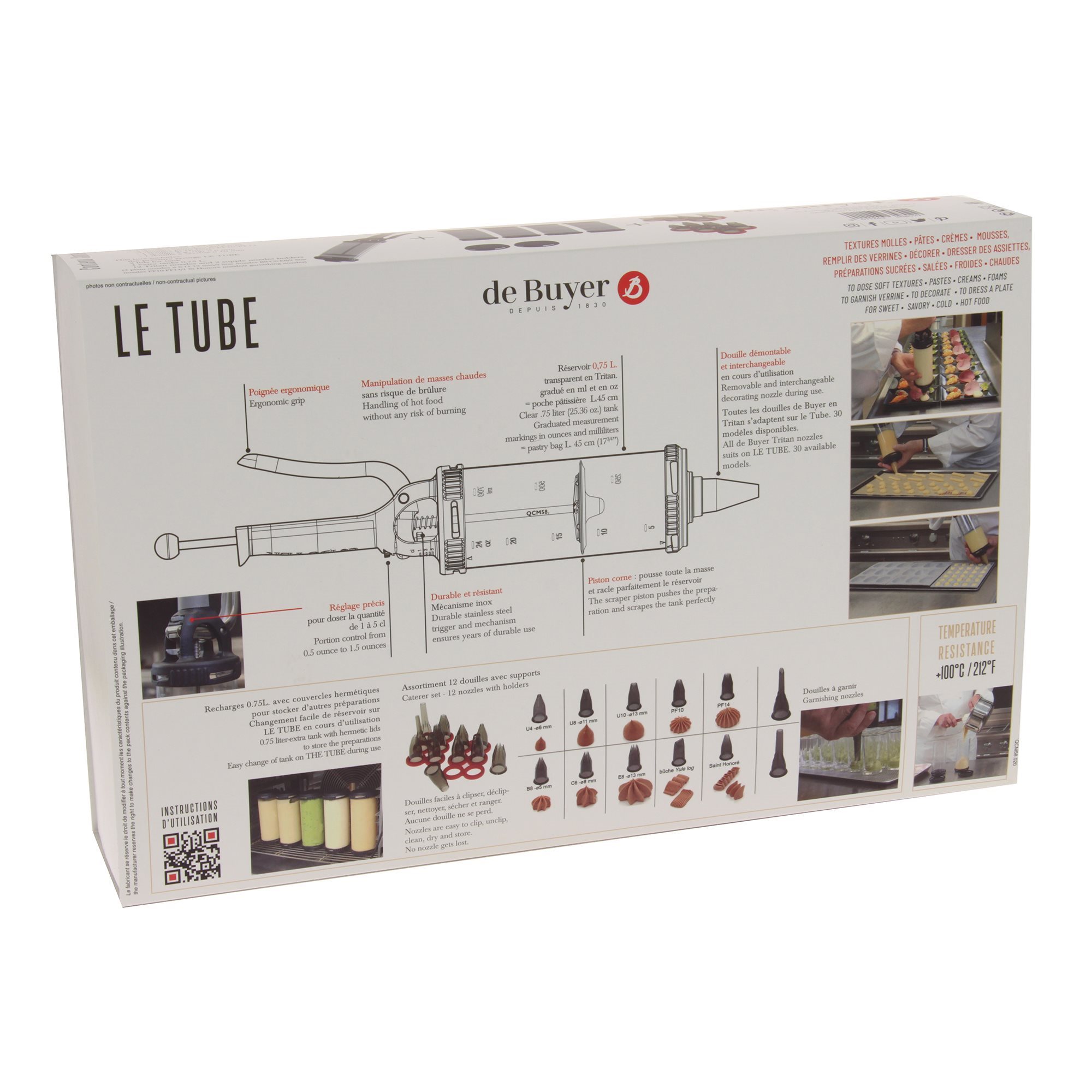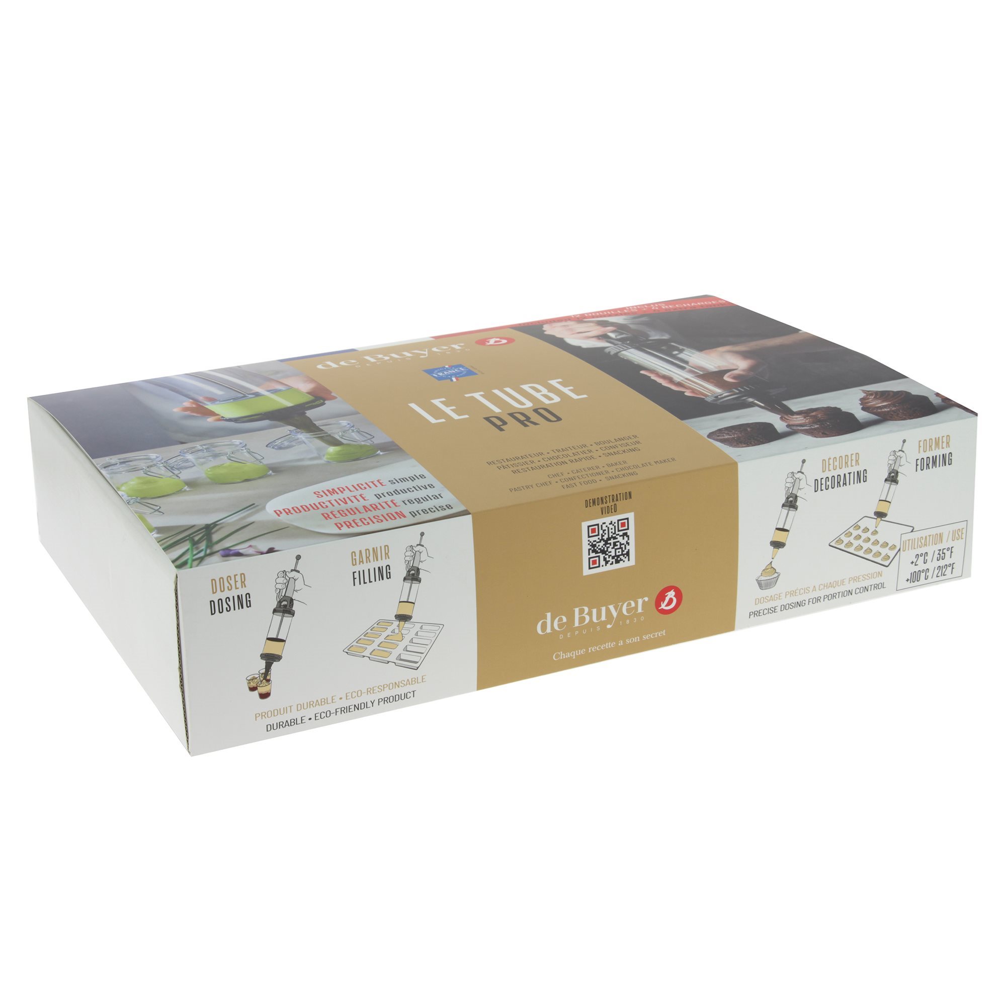 Този комплект на de Buyer "Le Tube Pro" за професионални готвачи и сладкари включва спринцовка за сладкиши под налягане със същите функции като торбичките за сладкиши: за пълнене, гарниране, декориране. Шприцът е идеален за гъсти препарати като кремове, мусове, тесто от чоу.