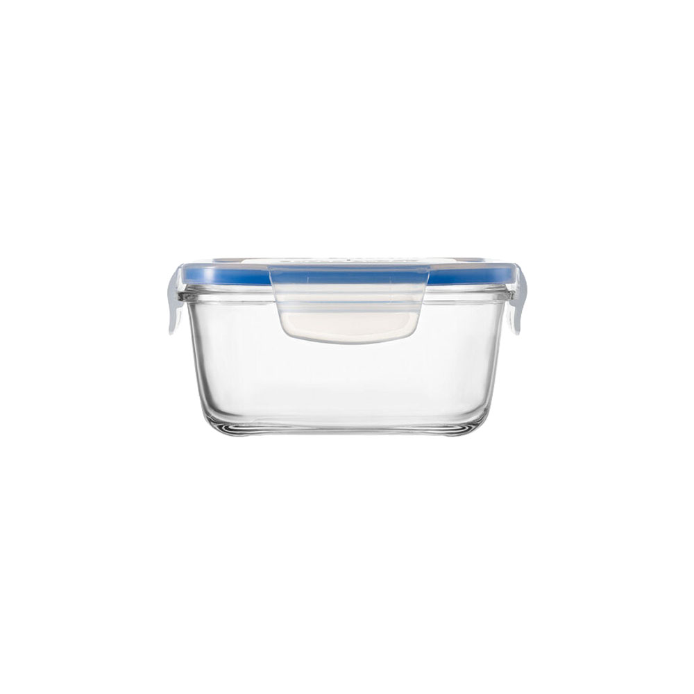 Правоъгълен съд за храна с капак, марка Borgonovo, вместимост 800 ml, размери 15 x 15 x 7 cm, изработени от стъкло, устойчиво на температури между -20 и +70 °C.