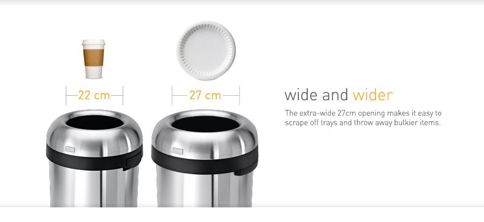 Кошът за боклук няма капак, а има отвор с ширина 27 см , за да можете да изхвърляте обемисти боклуци или остатъци от тави, използвани в ресторанти или други места, възможно най-бързо. Това прави кофата за боклук идеална за търговски помещения като ресторанти или кафенета.