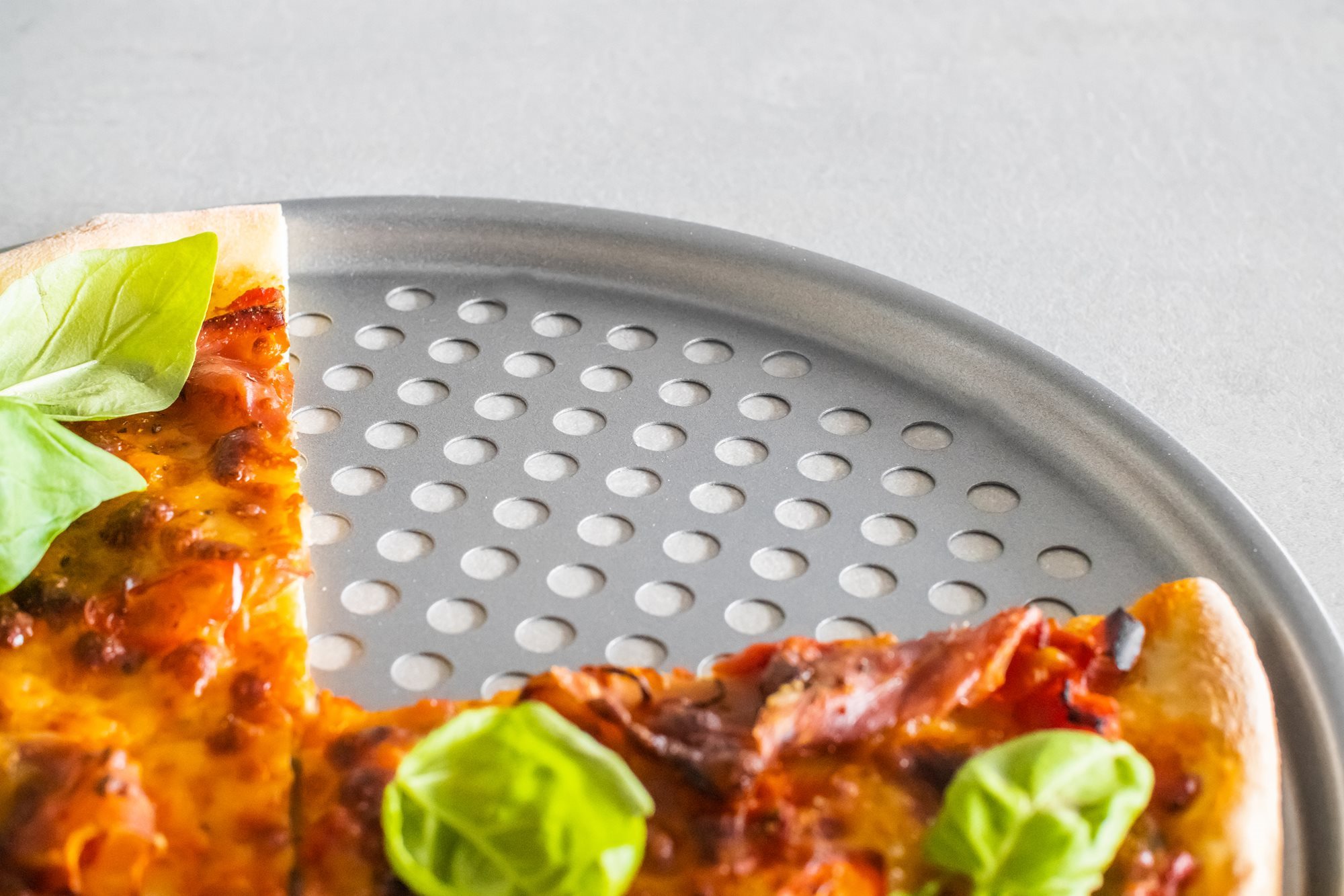 Кръгла тава за пица с диаметър 33 см, произведена от Kitchen Craft, идеална за приготвяне на хрупкава пица. Тавата има отвори за аерация, които помагат за ефективно изпичане на тестото за пица или чипс.