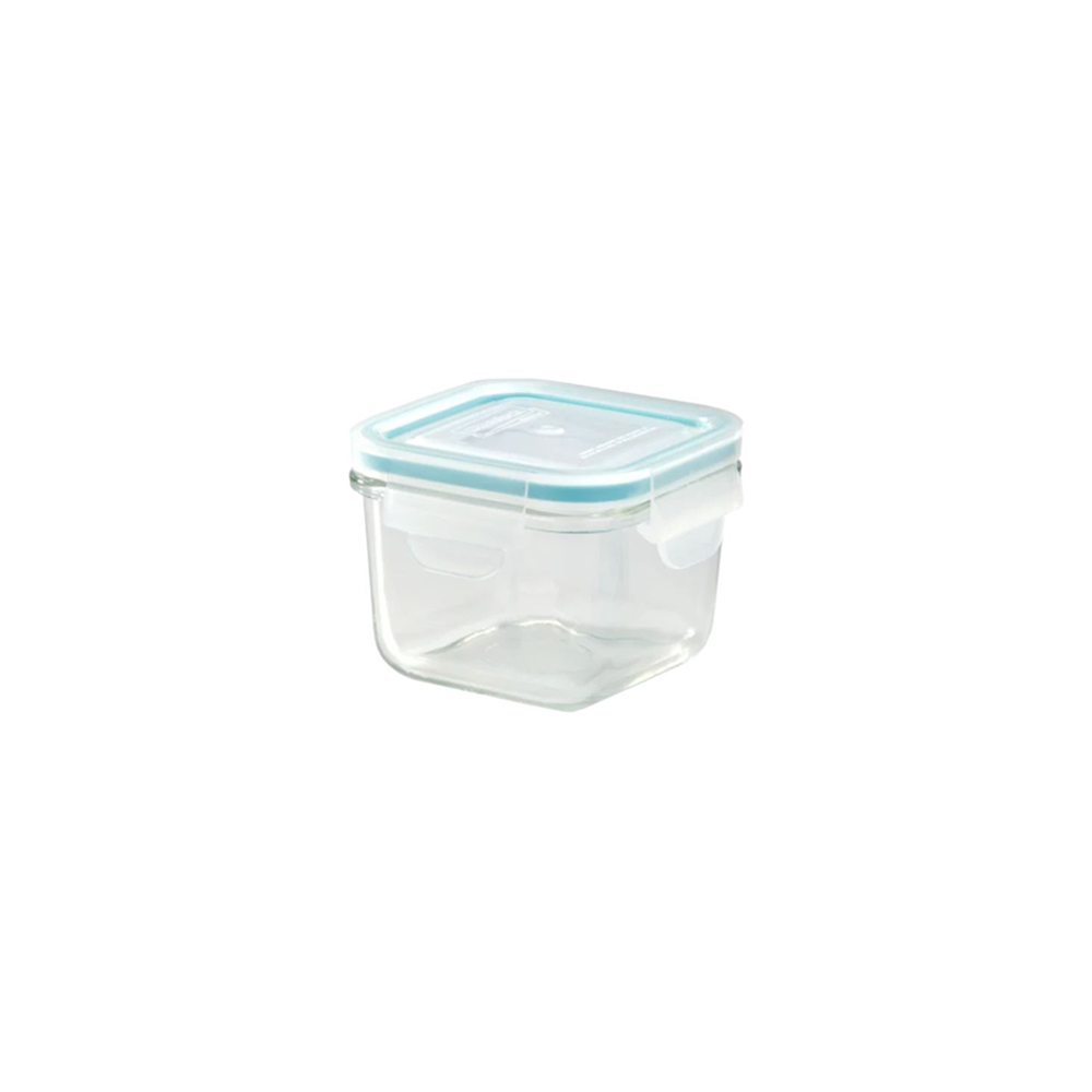 Квадратен контейнер за храна Glasslock с капак, вместимост 210 ml, размери 8.2 x 8.2 x 5.7 см, изработен от закалено стъкло, устойчив на температури между -20°C и +120°C.