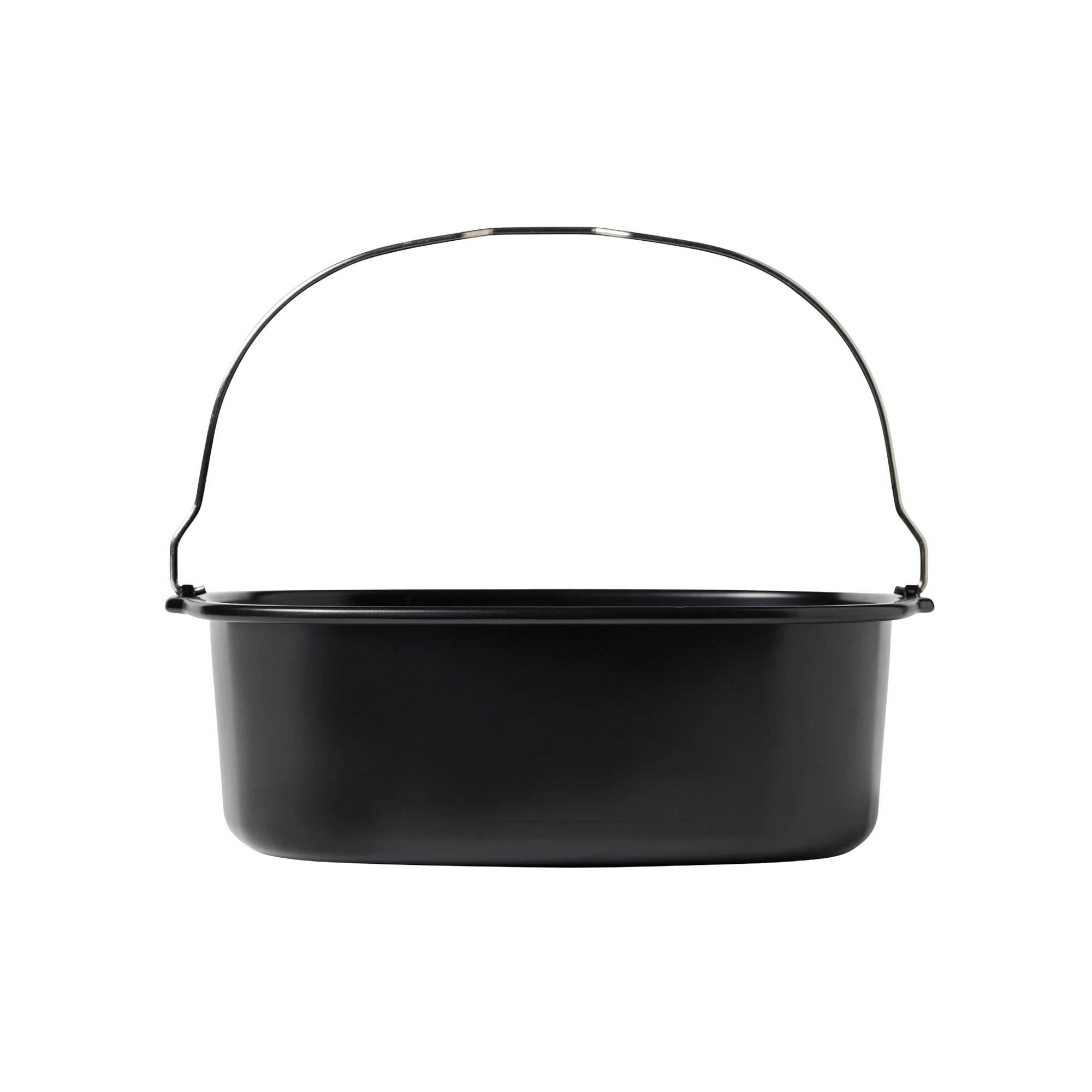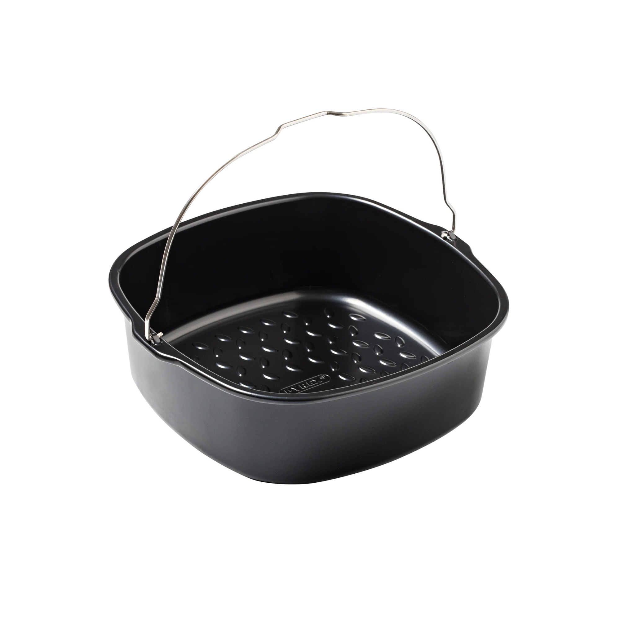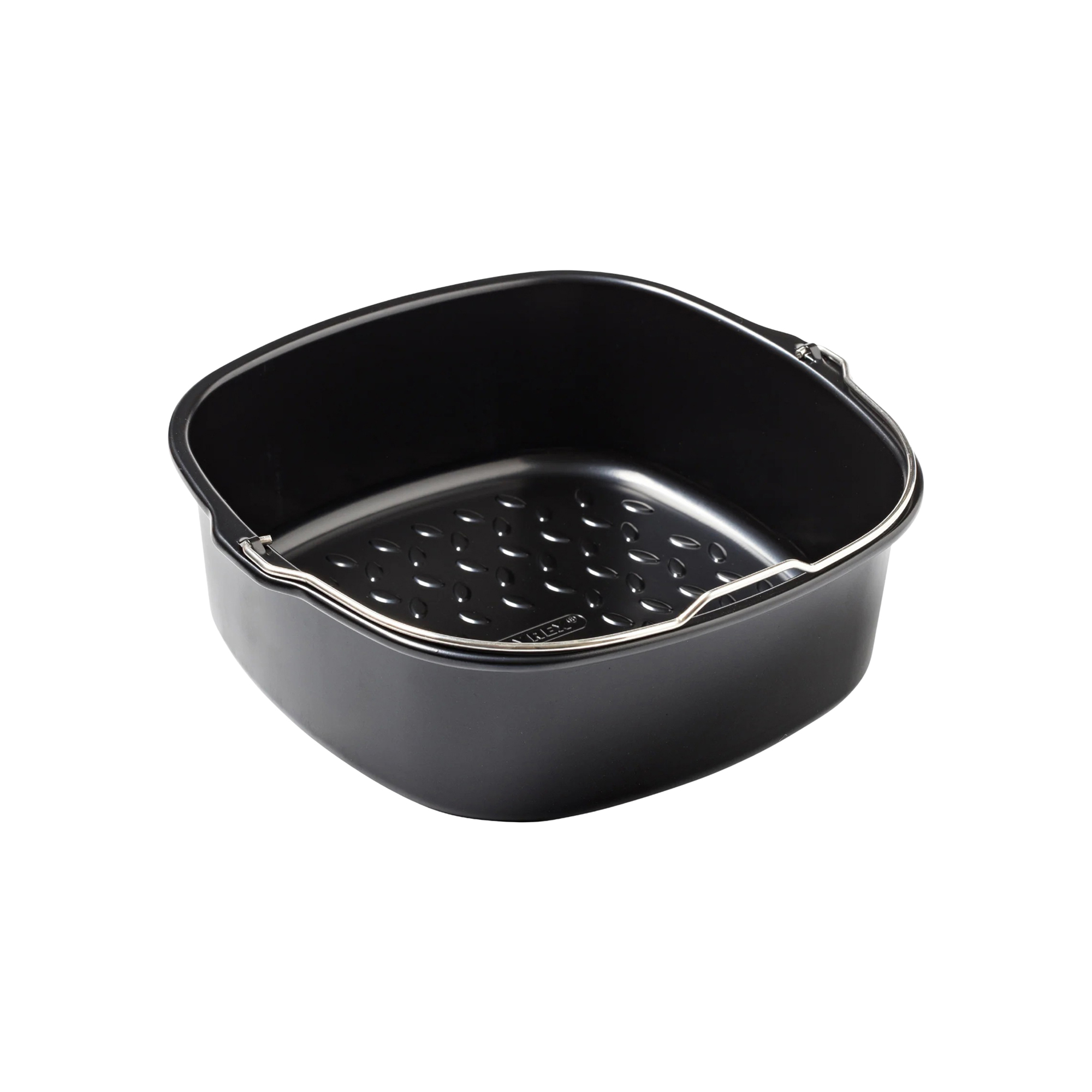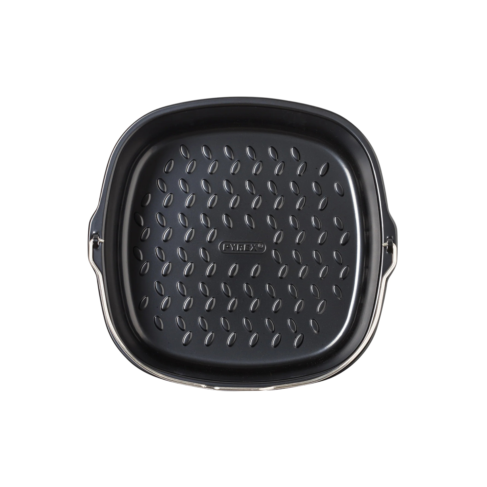Квадратен контейнер, подходящ за фритюрници, с външни размери 21 x 20 см, изработен от стомана с незалепващо покритие, произведен от Pyrex.