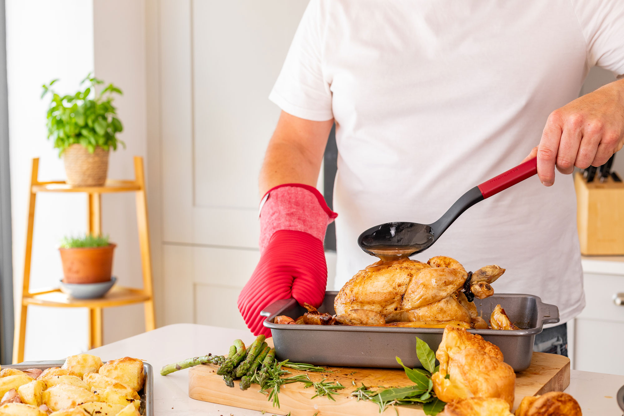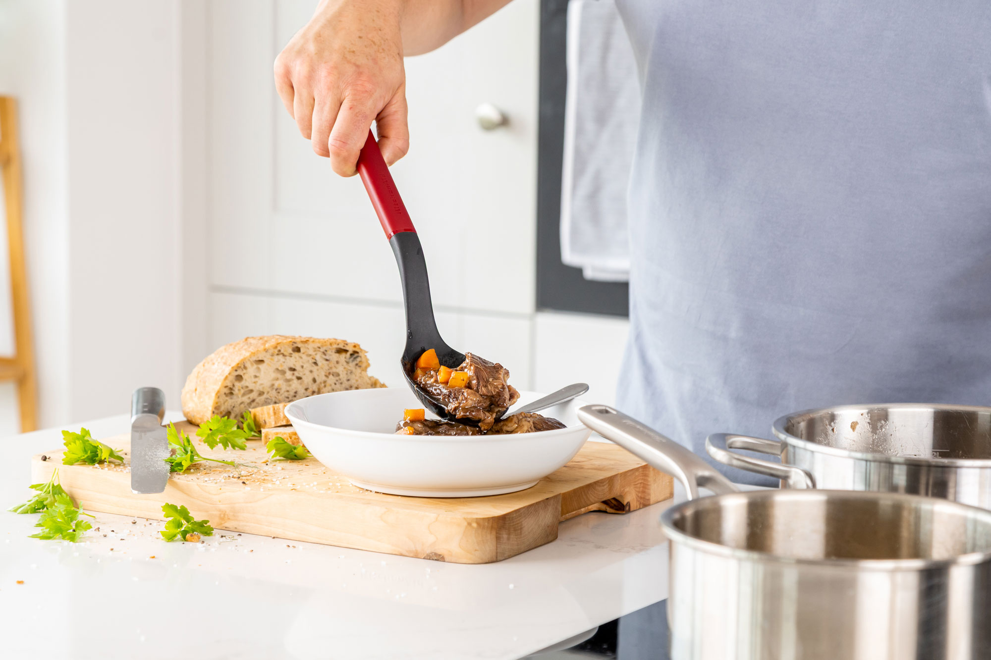 Готварска лъжица, произведена от KitchenAid, изработена от пластмаса, безопасна за използване с всички видове котлони, включително тези с антизалепващи покрития.