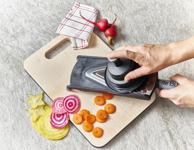 Дебелината на нарязване може да се регулира с помощта на вградения бутон от края на дръжката. Ергономичната нехлъзгаща се дръжка е изработена от полипропилен и позволява лесно боравене.