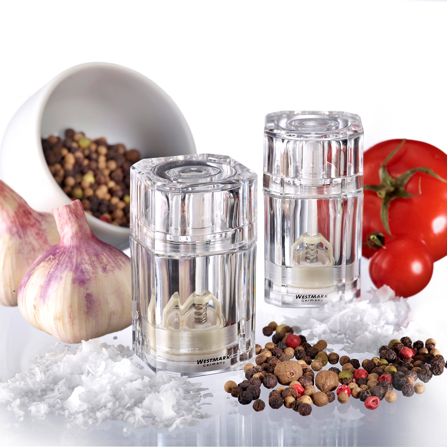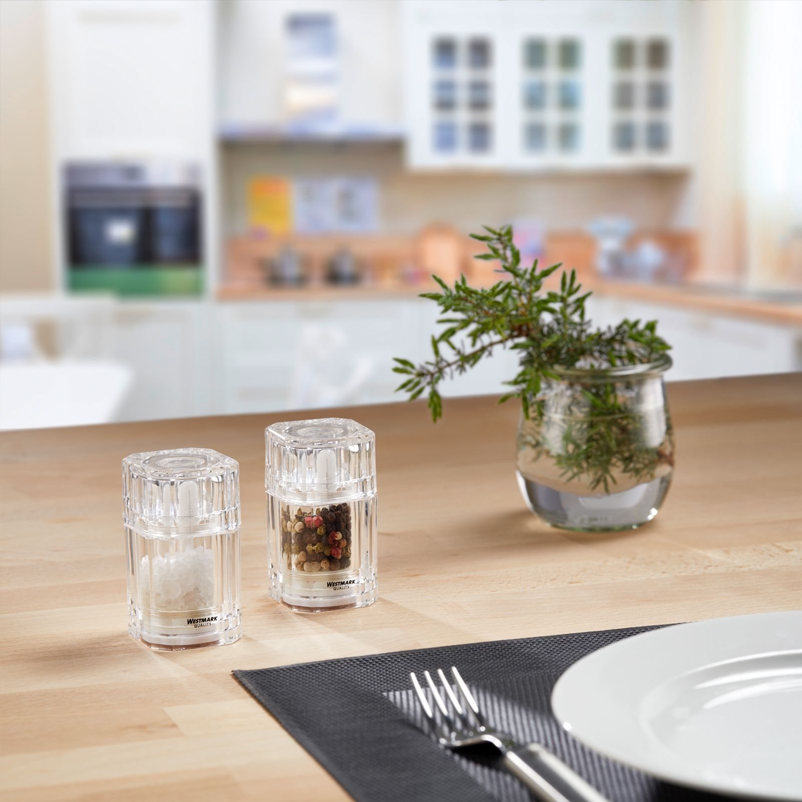 Шлайфащо устройство за пипер, сол или подправки, марка Westmark, размер 7,3 см. Тялото му е направено от пластмаса, а системата за смилане от керамика.