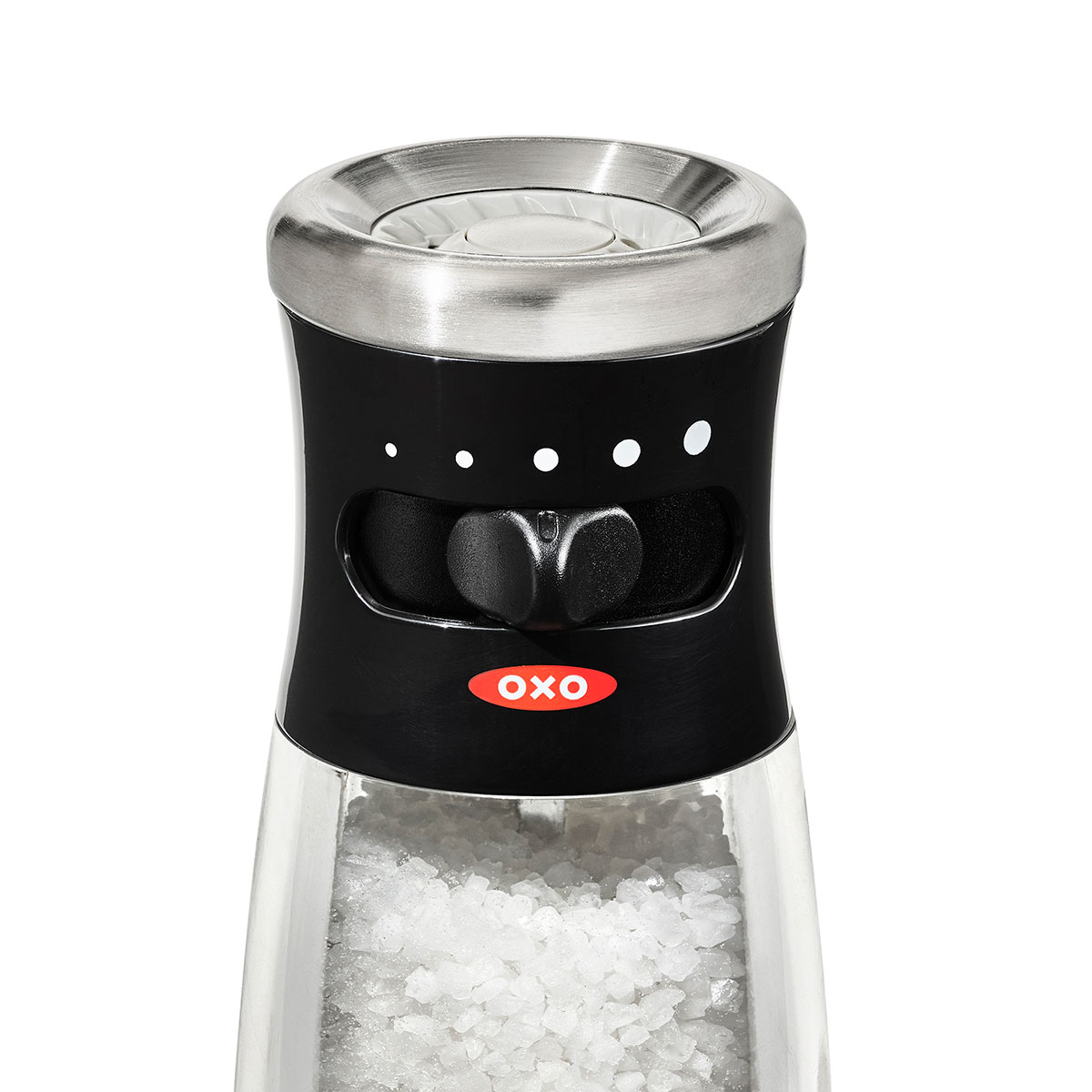 Елегантната мелничка за сол OXO SoftWorks е перфектният аксесоар за всяка кухня или маса за хранене. Тази ръчна мелничка е с акценти от неръждаема стомана и прозрачен акрилен корпус, което ви позволява лесно да виждате кога е време за пълнене.