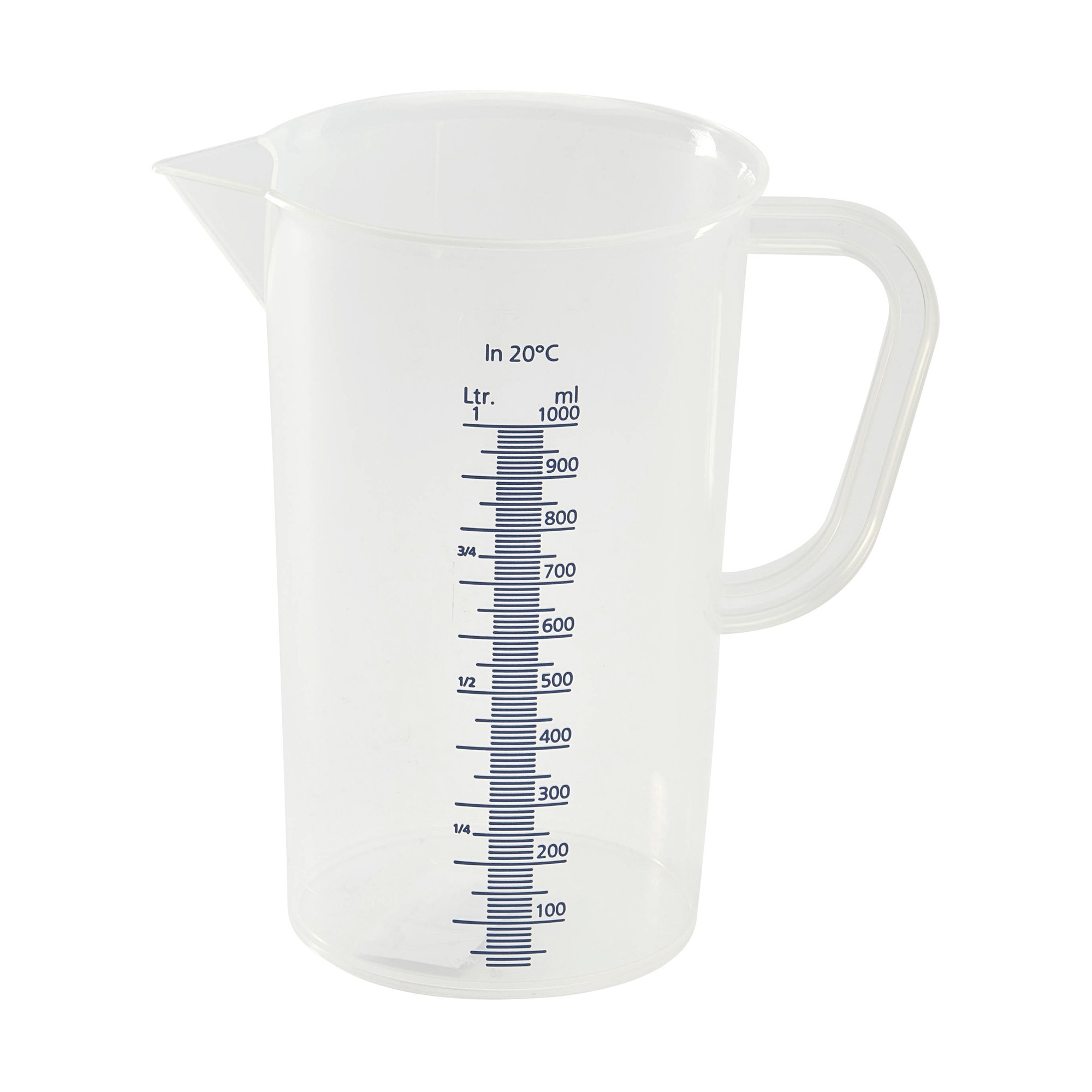 Мерителна мугла, de Buyer марка, диаметър 11,5 см, височина 18 см, която може да измери обем до 1 л, от прозрачен полипропилен и снабдени със сини маркировки.