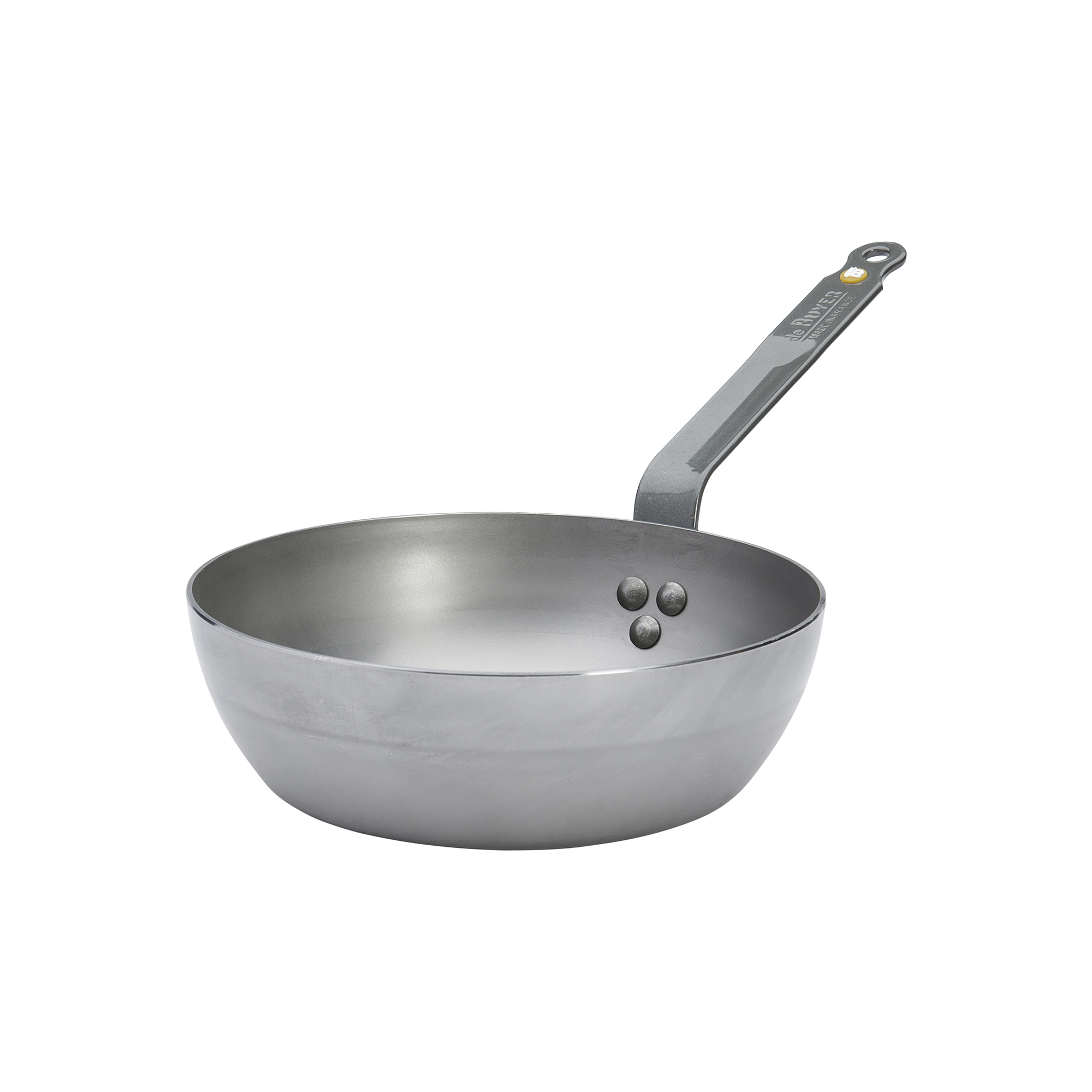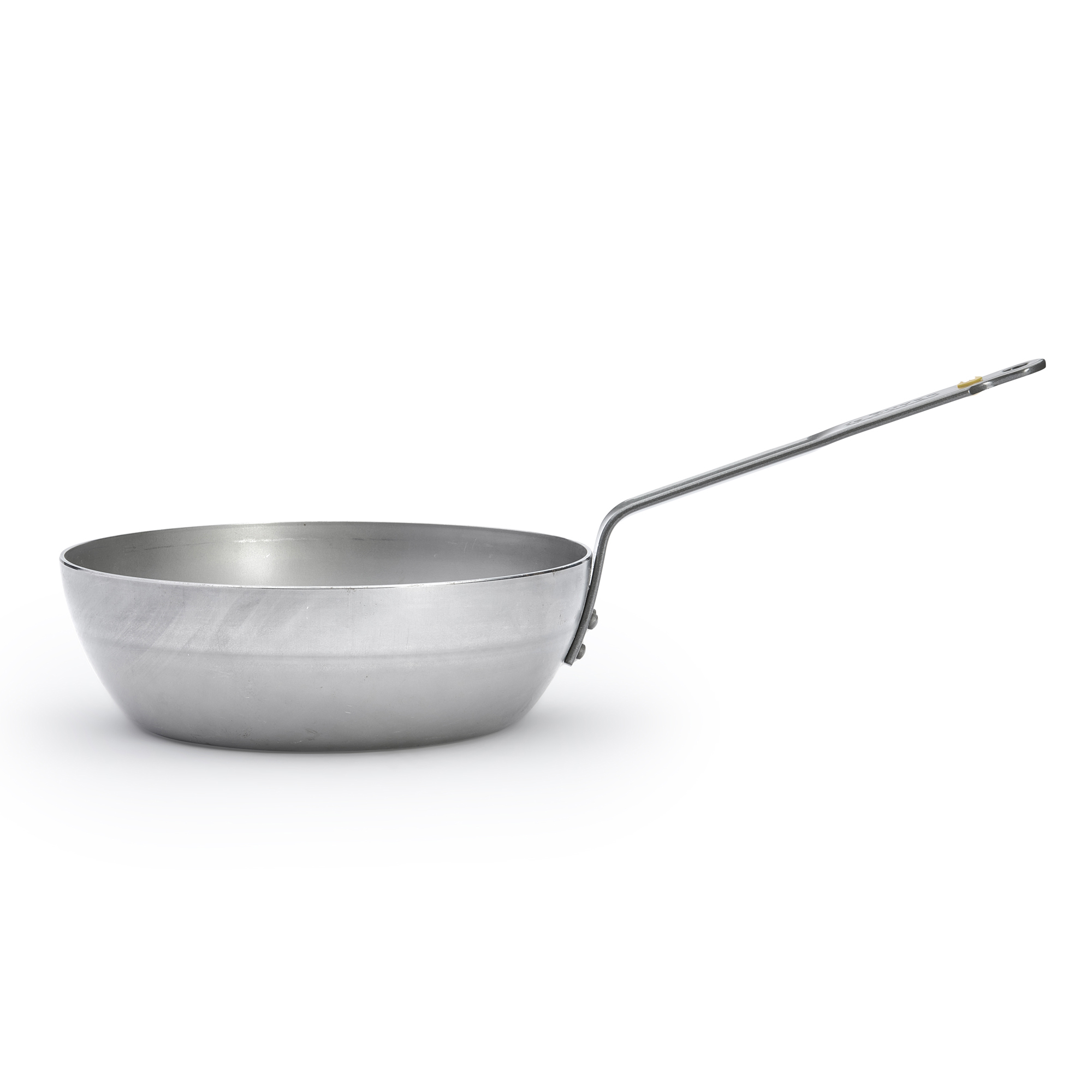 Професионален тиган, de Buyer марка, диаметър 24 см, височина 8 см, изработен от стомана с дебелина 2,5 мм, която не се деформира. Неговото покритие се прави с естествен пчелен восък, който предпазва тигана срещу окисляване и улеснява третирането му чрез смазване и нагряване с масло преди употреба (вижте как се прави смазването и нагряването с масло във видеото по-долу).