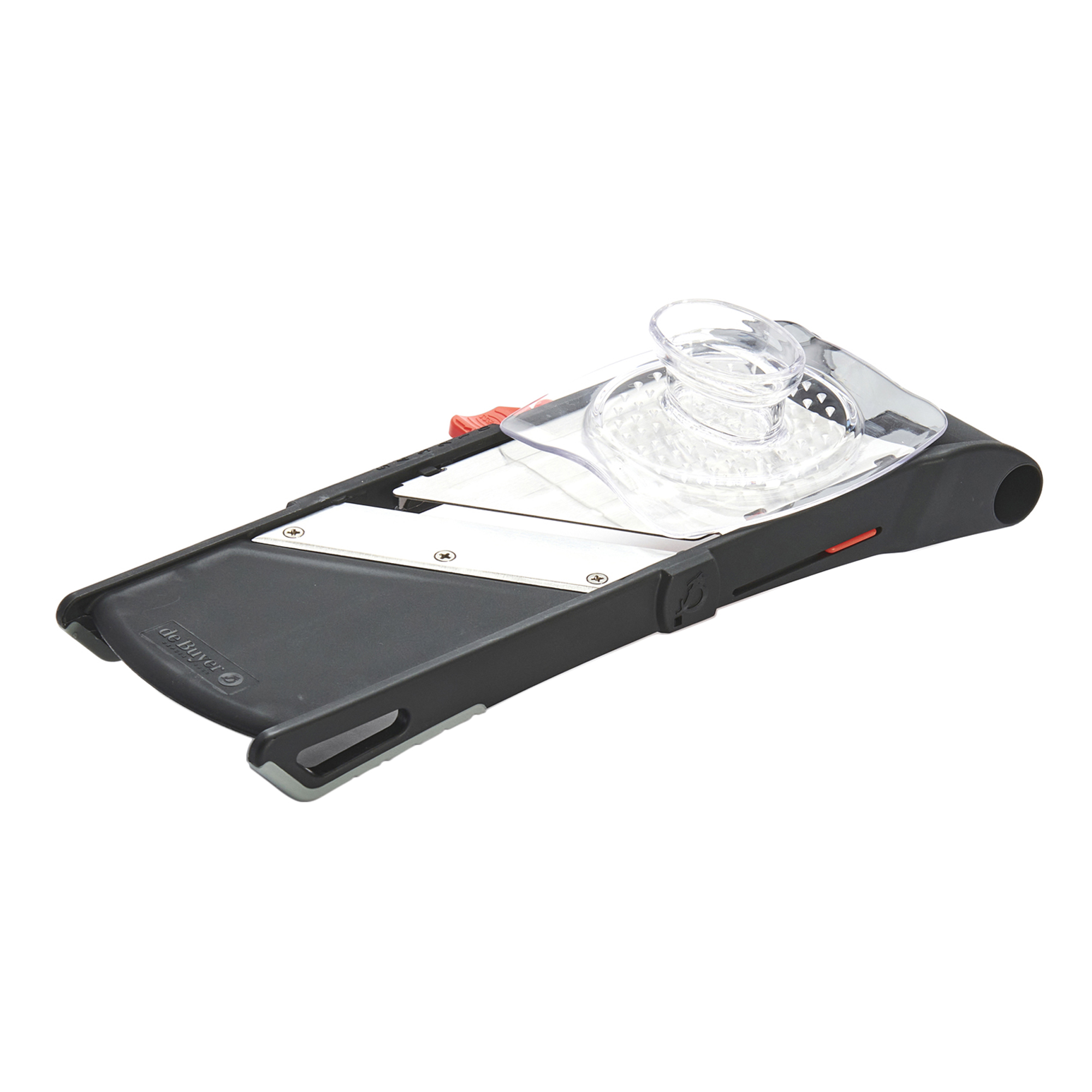 Мини-мандолина "Коми", марка de Buyer, с интегрирано хоризонтално острие, изработено от неръждаема стомана, наклонено под ъгъл 35°, за по-лесно насичане. Мандолината е оборудвана с 2 остриета за насичване на Юлиен с разстояние на насичване 2 и 4 мм. Дебелината на острието може да се регулира между 0 и 5 мм.