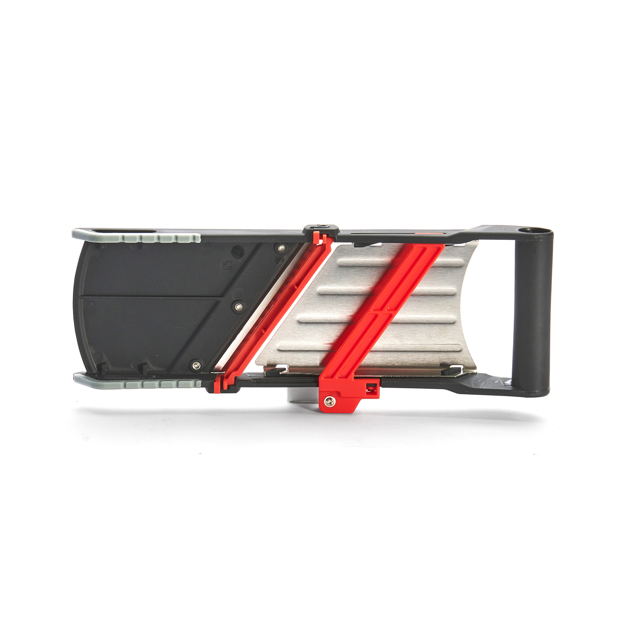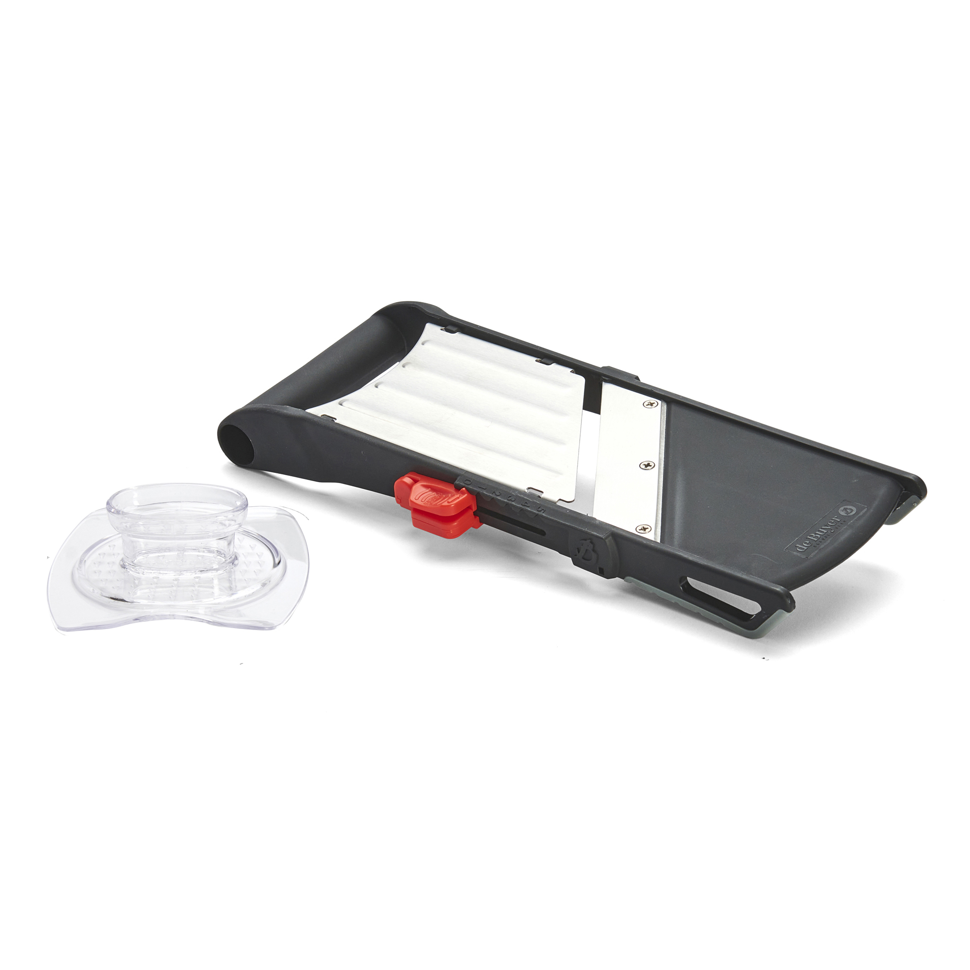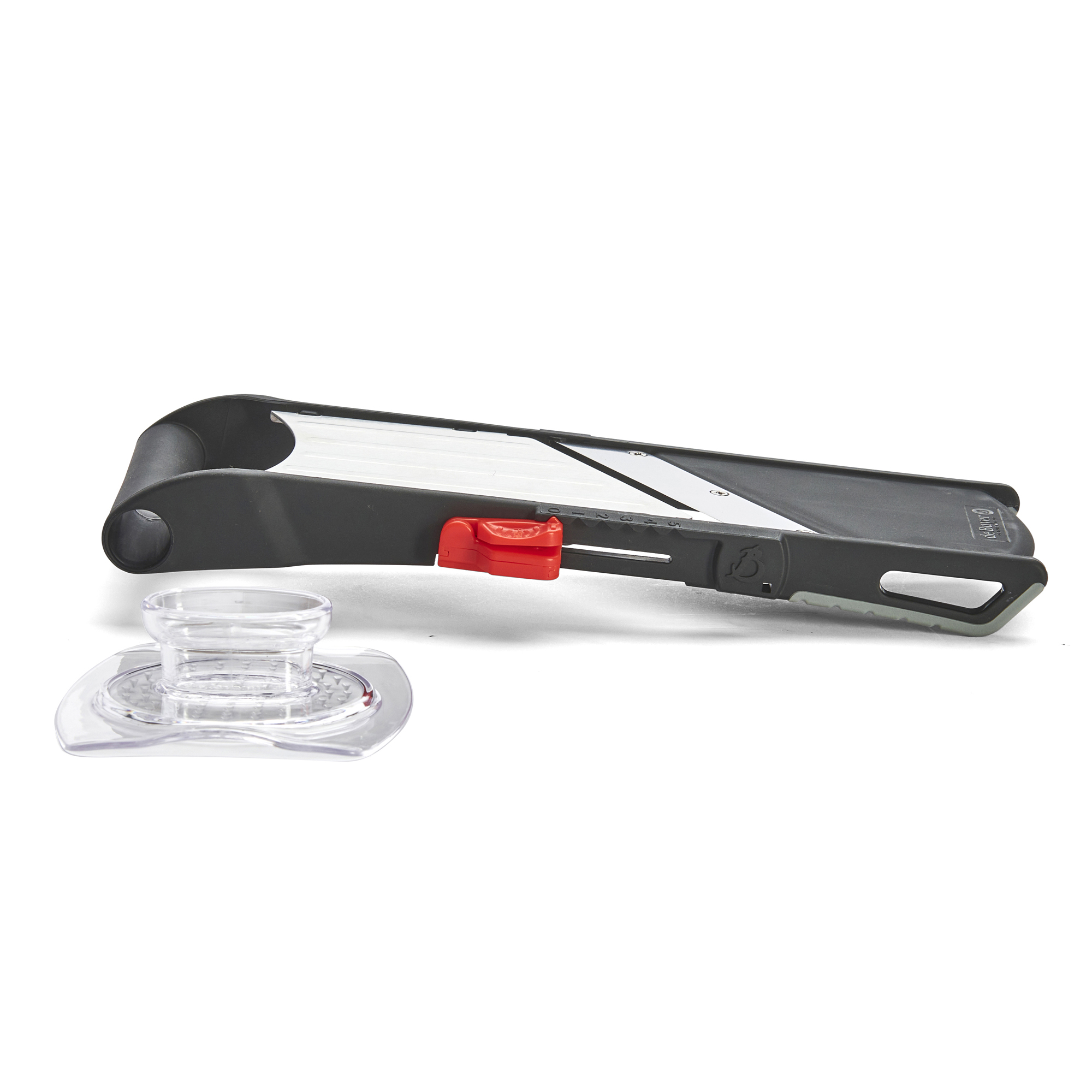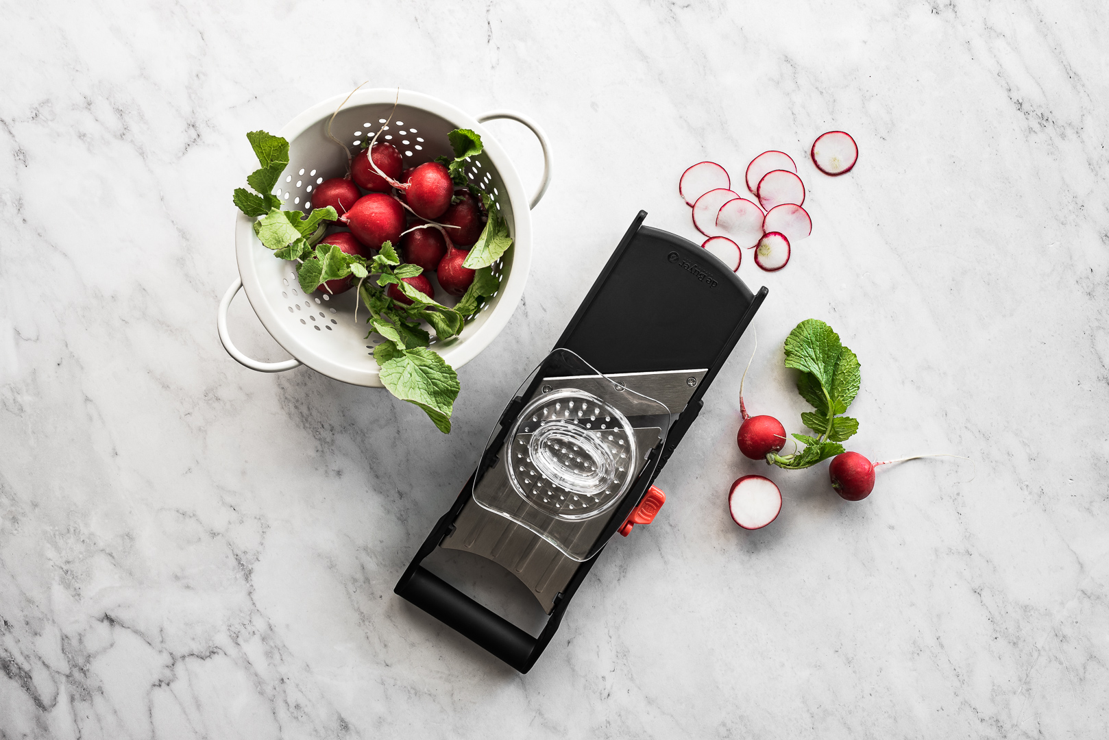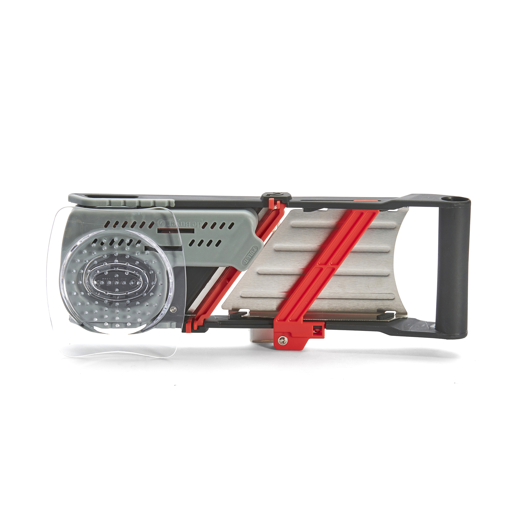 Използвате мандолина, за да нарежете, каймак и нарежете плодове и зеленчуци на Джулиен, дори меки домати. Дебелината на рязане може да се регулира в единици от по 1 мм всяка, с помощта на измервателния мащаб, изписан отстрани на мандолина.
