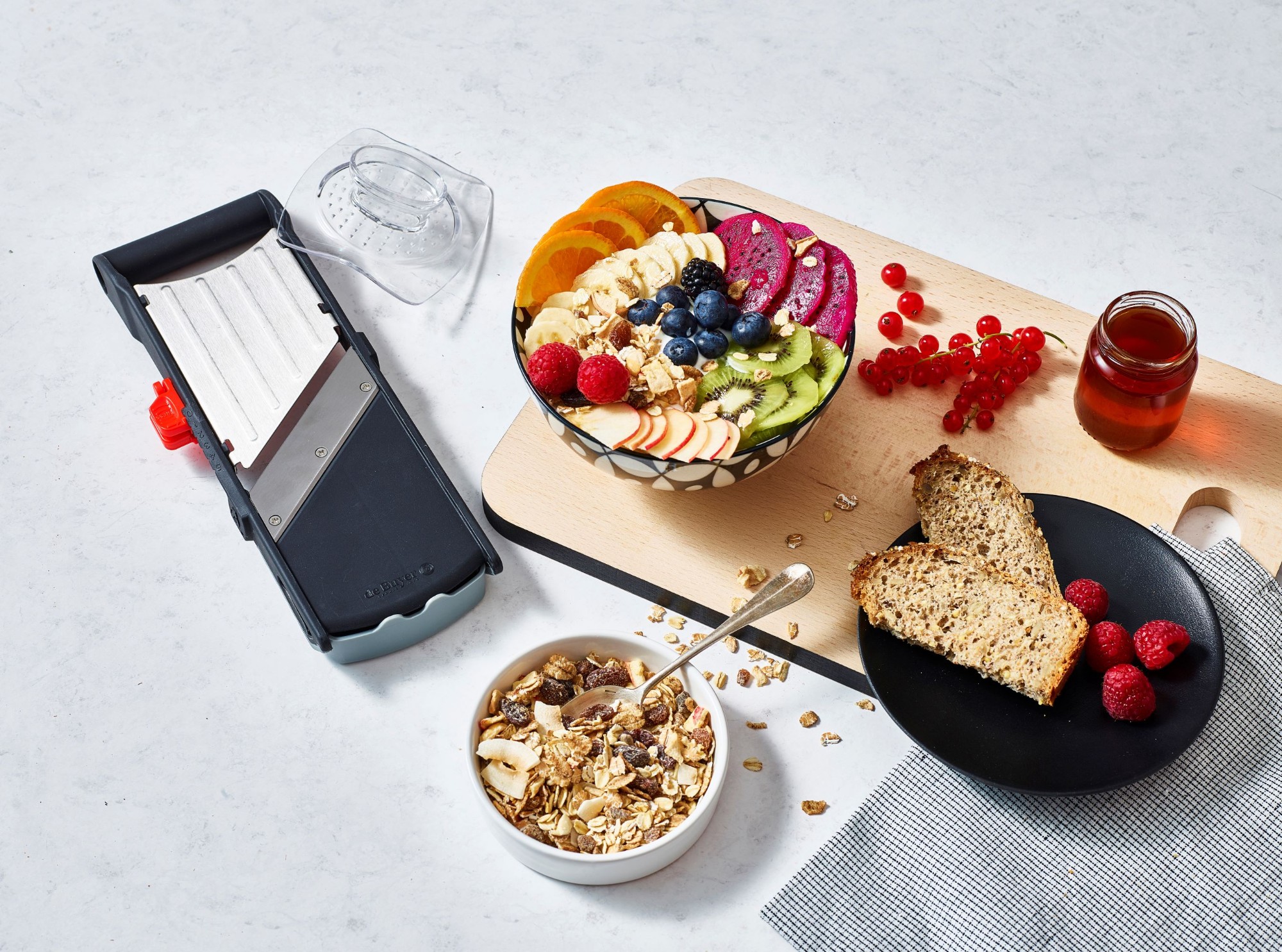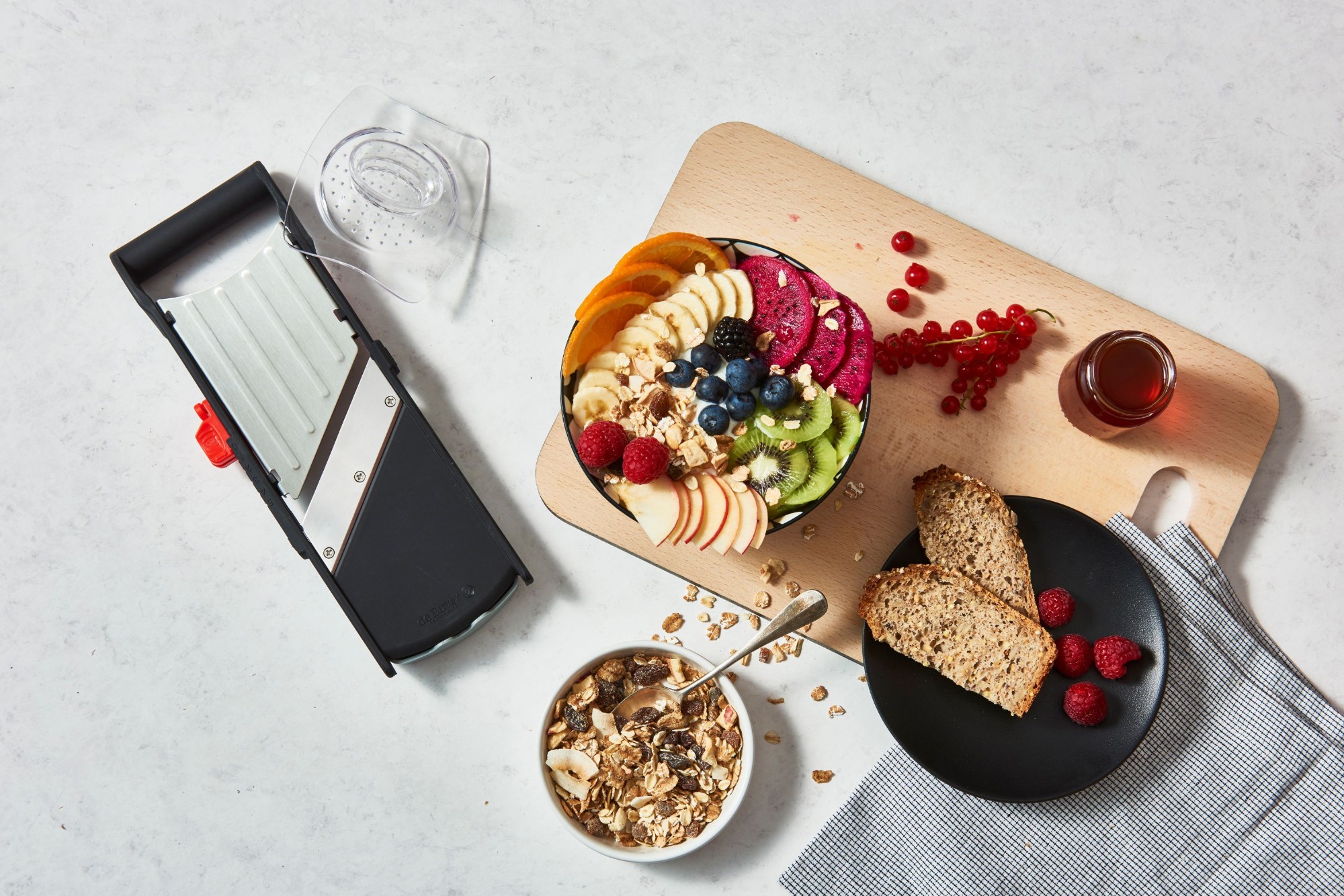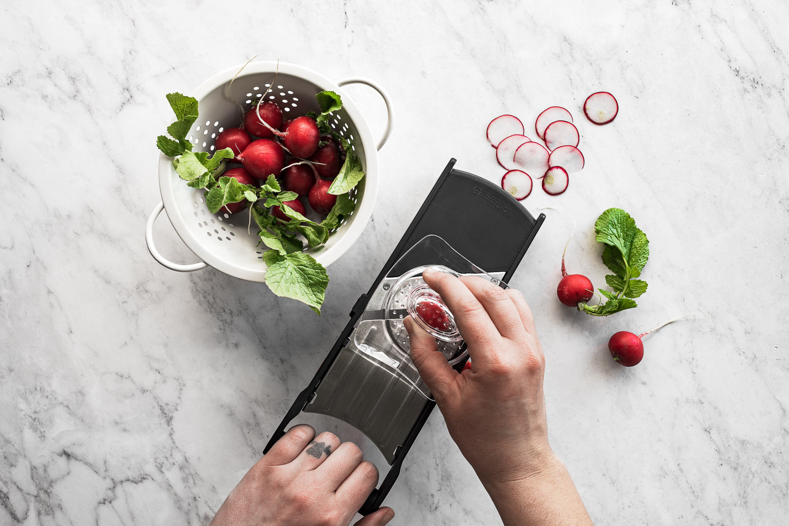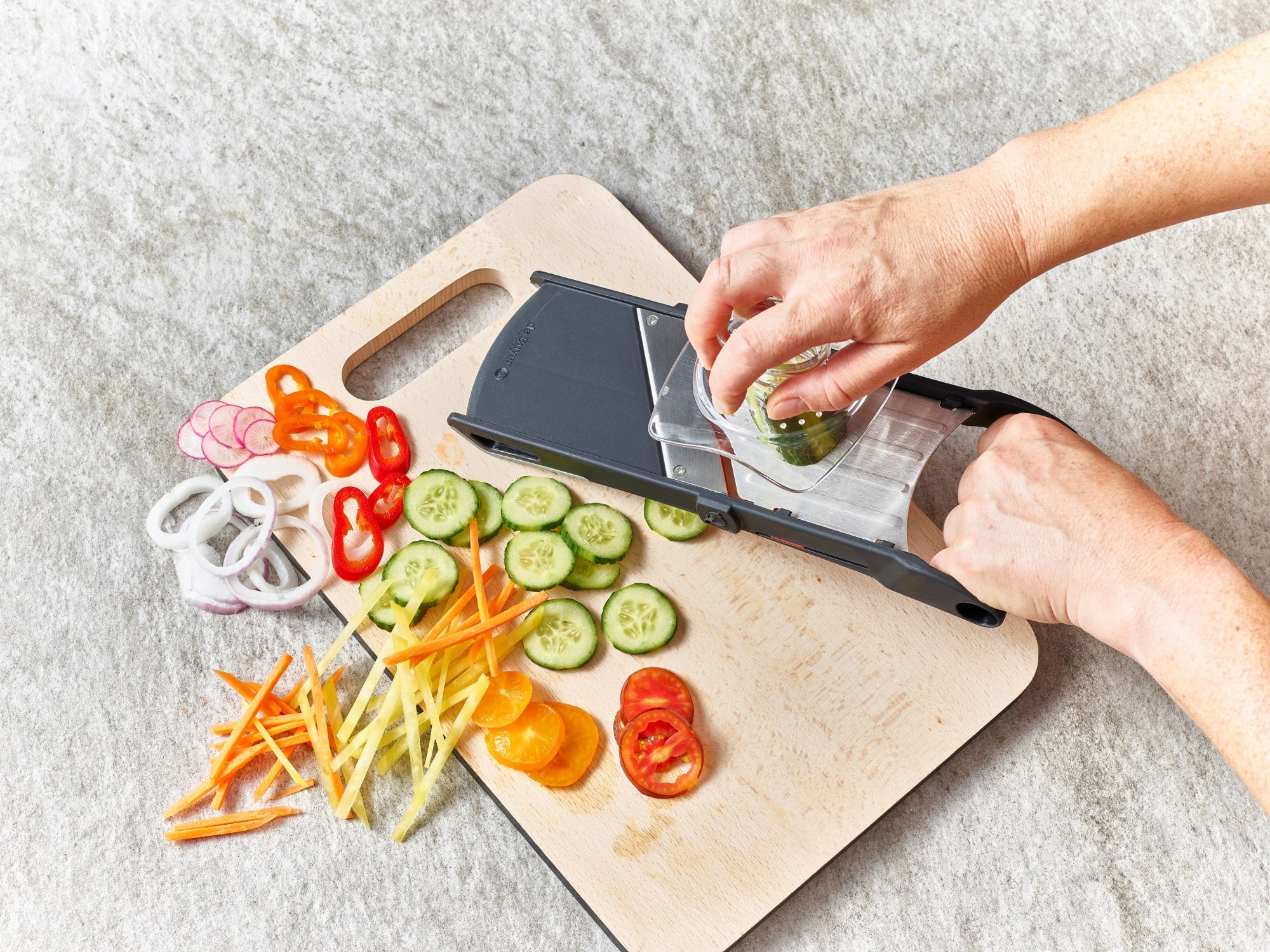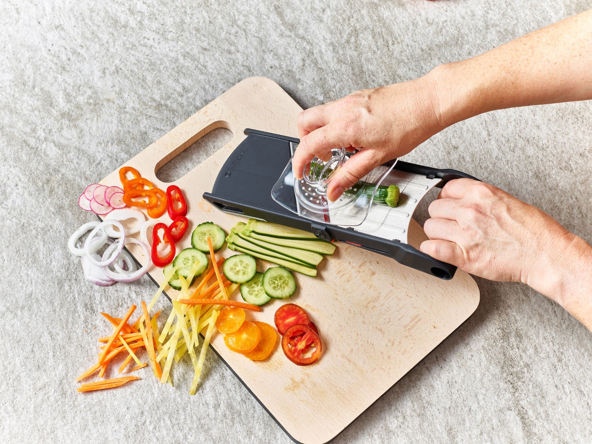 Използвате мандолина, за да нарежете, каймак и нарежете плодове и зеленчуци на Джулиен, дори меки домати. Дебелината на рязане може да се регулира в единици от по 1 мм всяка, с помощта на измервателния мащаб, изписан отстрани на мандолина.