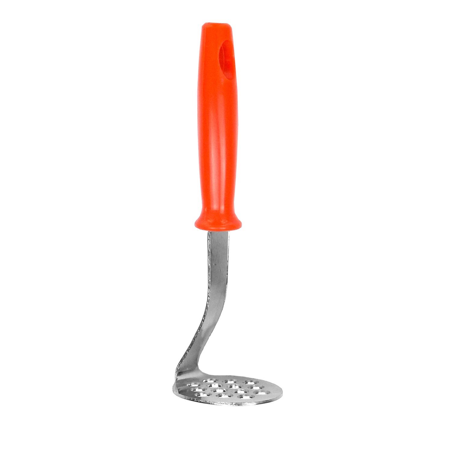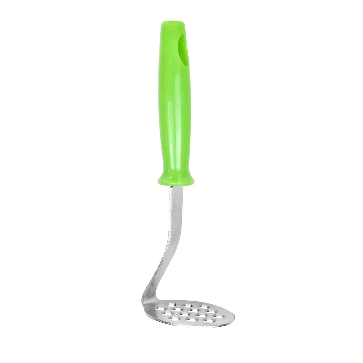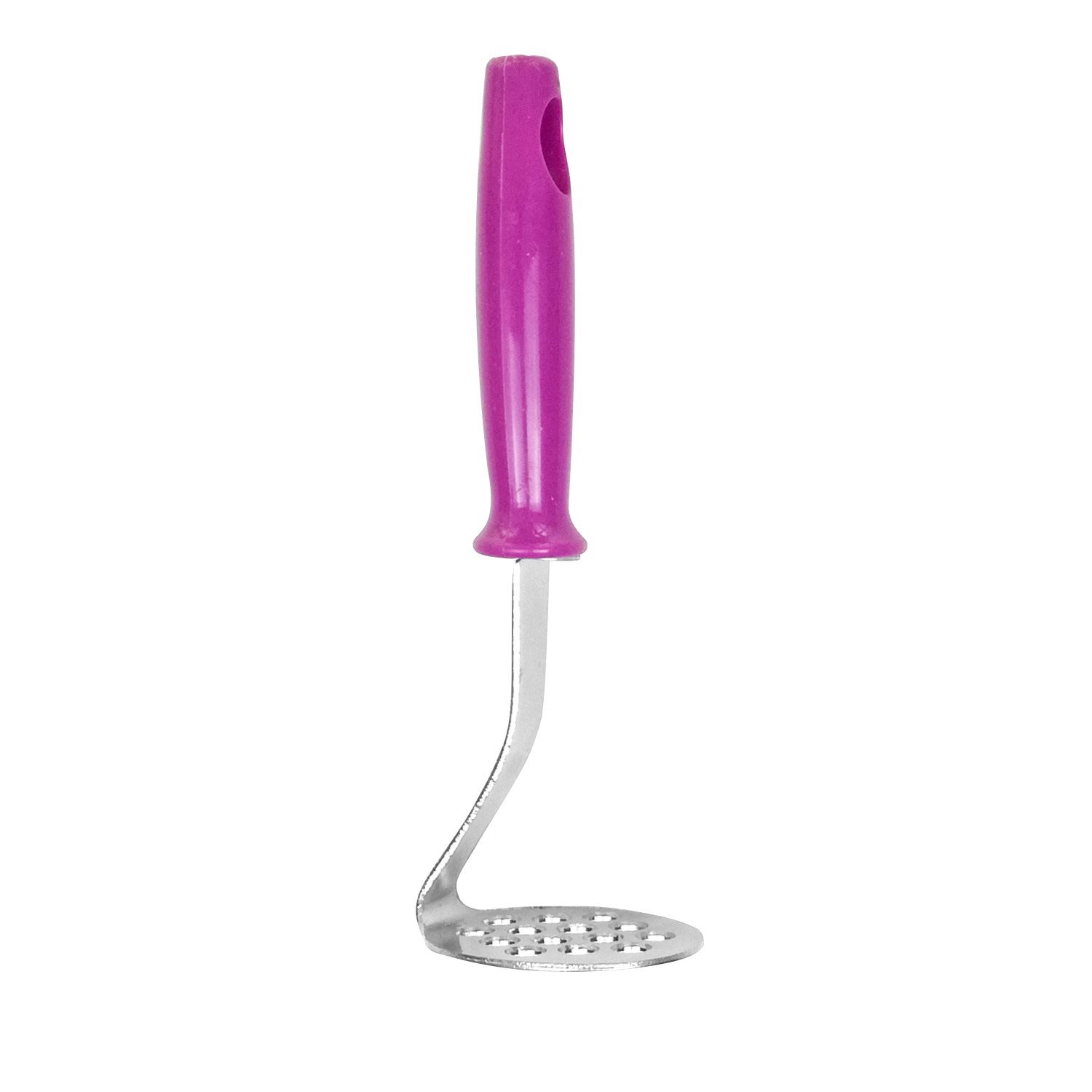 Мини инструмент за мачкане на картофи, дължина 17 см, с цветна пластмасова дръжка и функционален край, изработен от неръждаема стомана и пръстен за закачане на продукта.