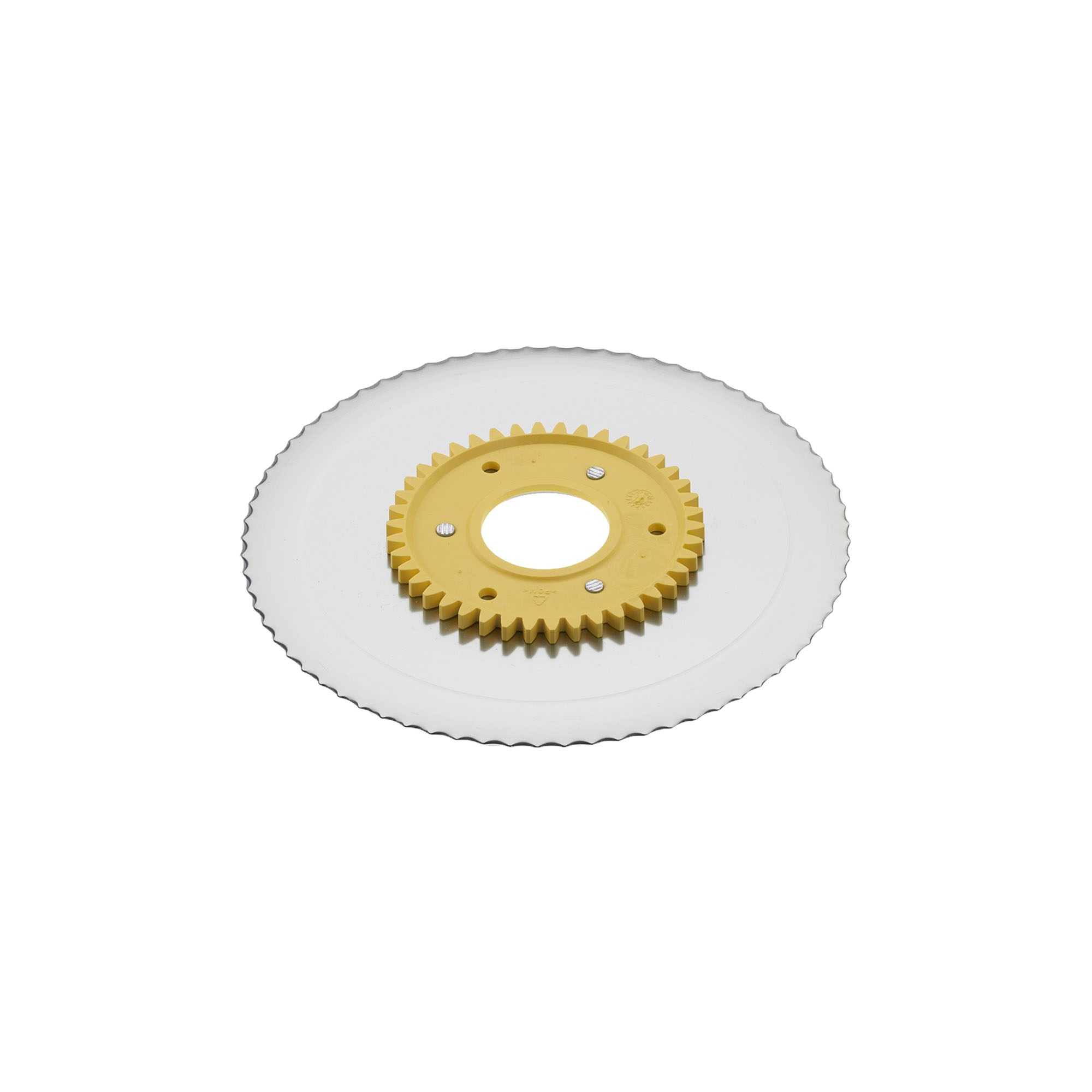 Назъбено кръгло острие с електрополирана повърхност и жълто зъбно колело, произведено от Ritter, с диаметър 17 см, изработено от неръждаема стомана, подходящо за домакински електрически резачки Ritter.