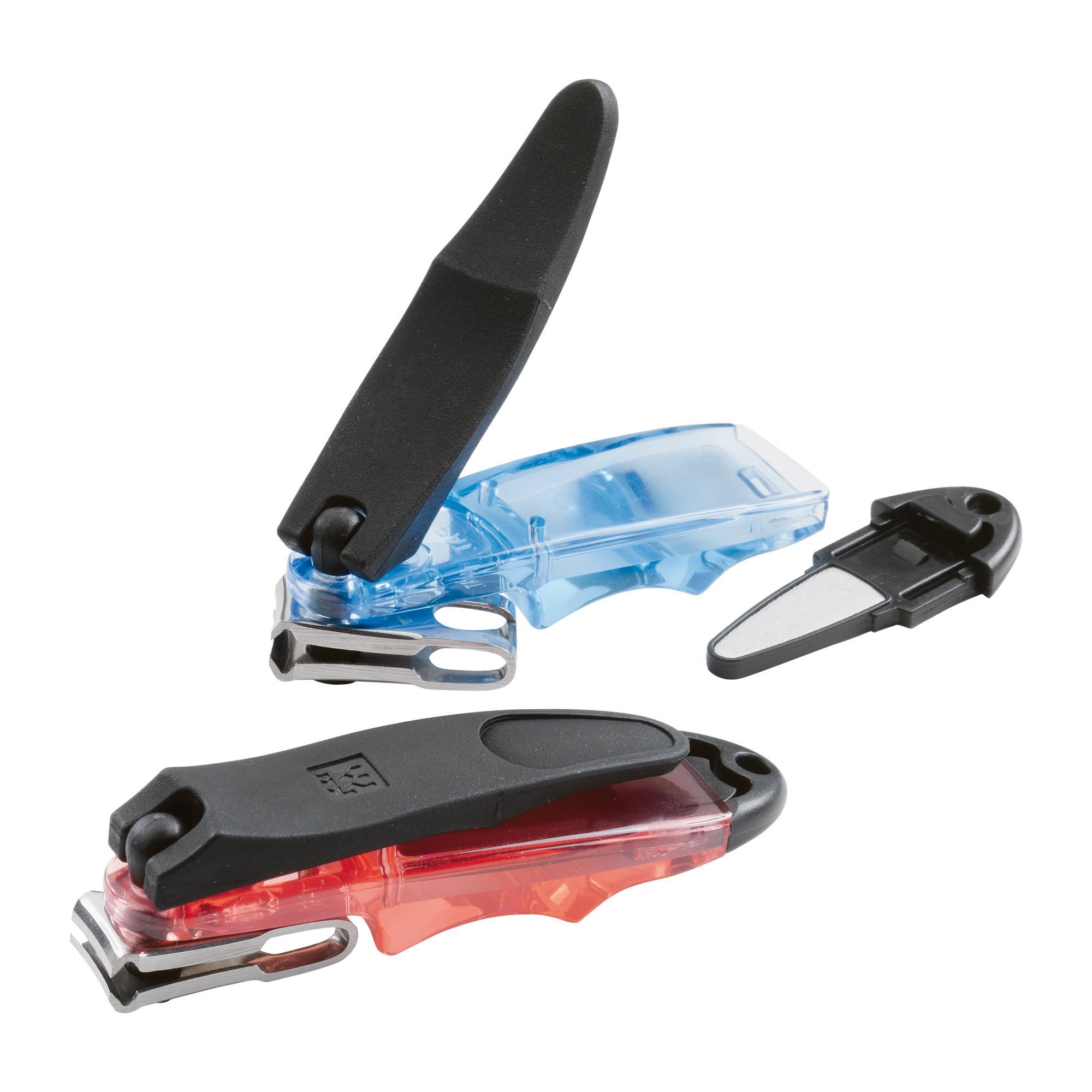 Ротационна нокторезачка, произведена от Zwilling, изработена от сатенирана неръждаема стомана и прозрачна цветна пластмаса в червено или синьо, с уникален стил и отличителен дизайн за подобрена ергономичност.