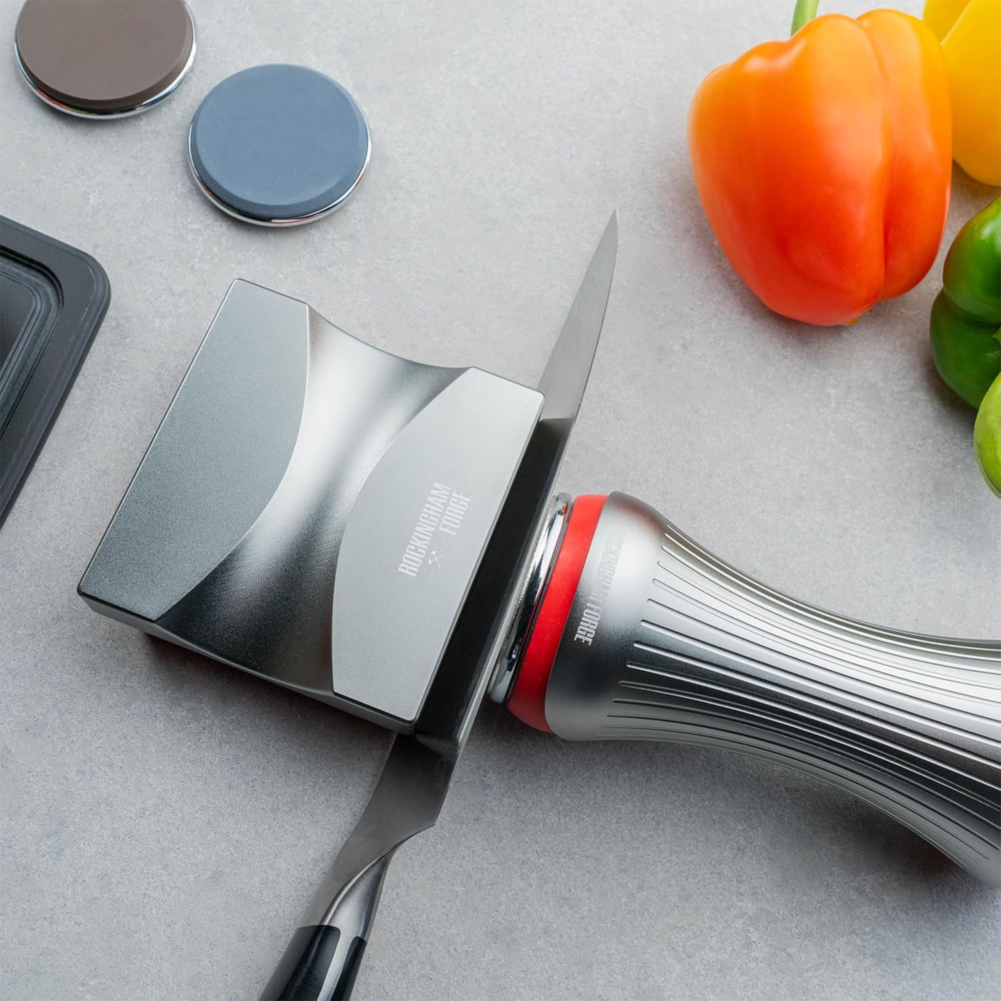 Острилката Rockingham Forge е иновативна система, която позволява на потребителите да постигат прецизни резултати бързо и без усилие. Просто прикрепете ножа към магнитната основа, поставете желания диск и завъртете острилката по острието, за да възстановите ръба. С едно просто движение напред-назад всеки може да наточи кухненските си ножове като експерт .