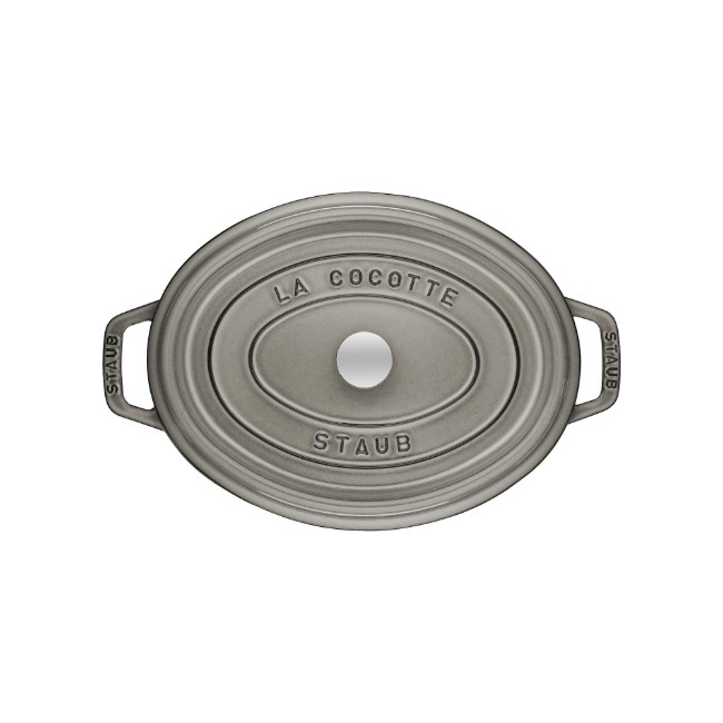 Овална тенджера за готвене в гамата Cocotte, марка Staub, диаметър 23 см, капацитет 2.35 л, направена от чугун.