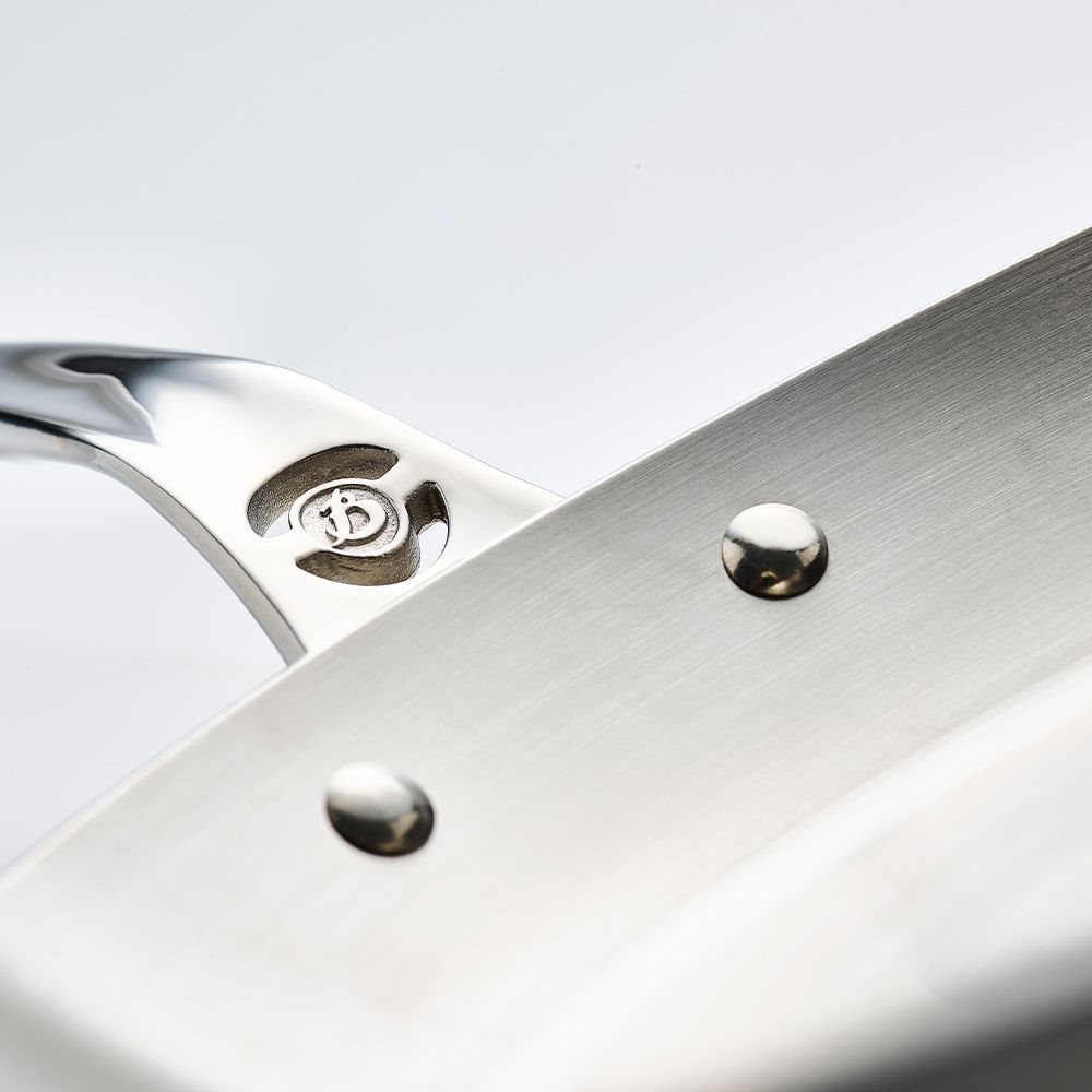 Дизайнът на дръжката от неръждаема стомана, обезопасена с много твърди нитове, е издръжлива, гладка и позволява на тигана да се борави по удобен начин. Тиганът за пържене беше така проектиран, че температурата постепенно се увеличава.