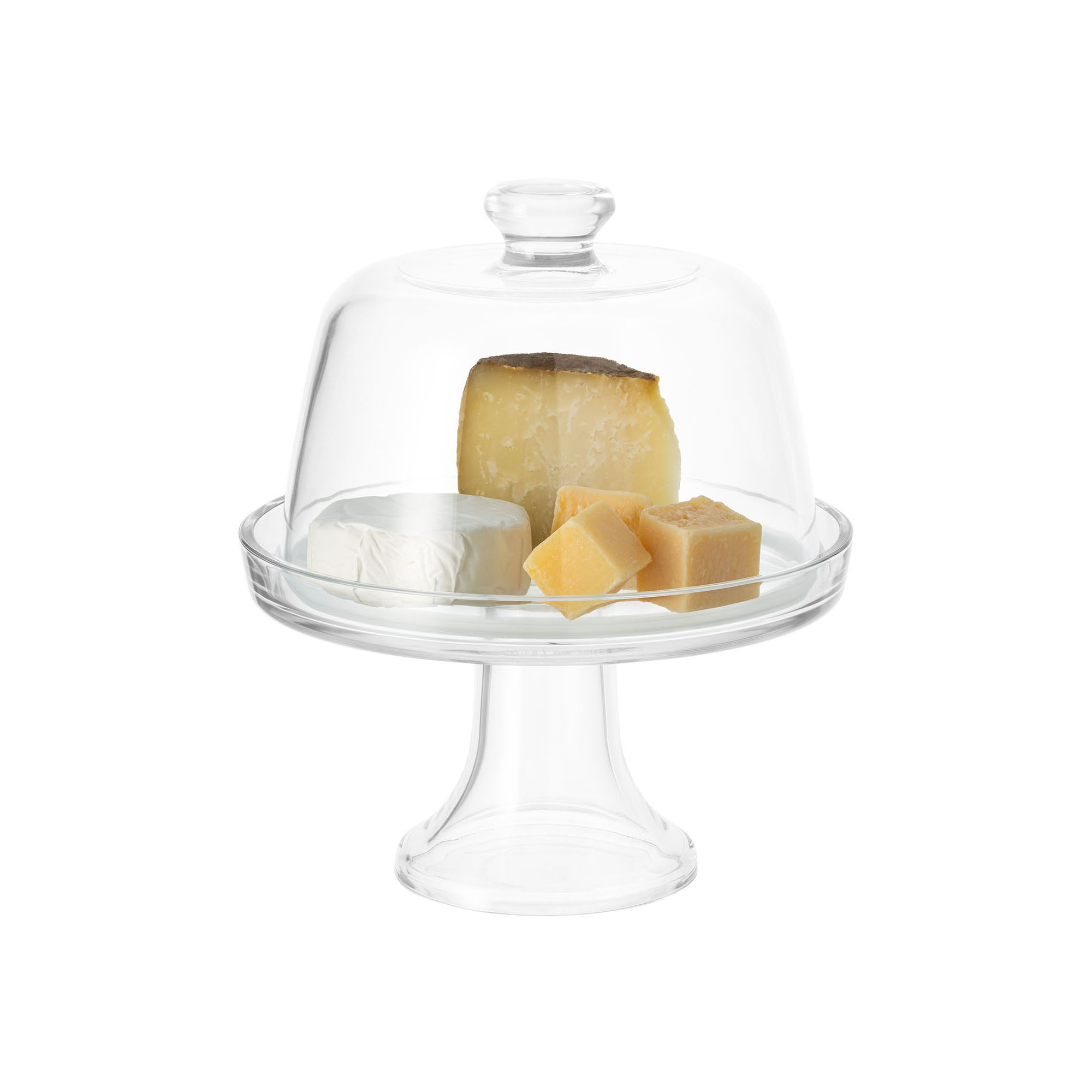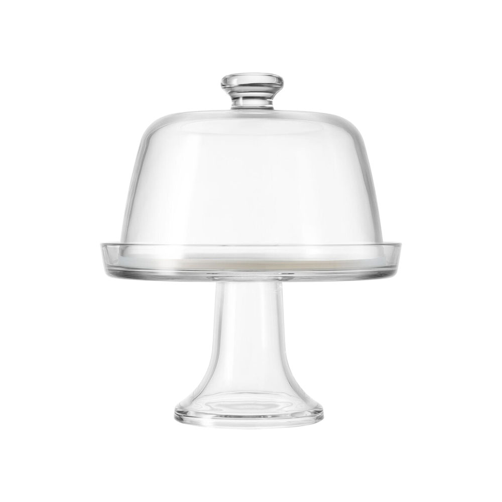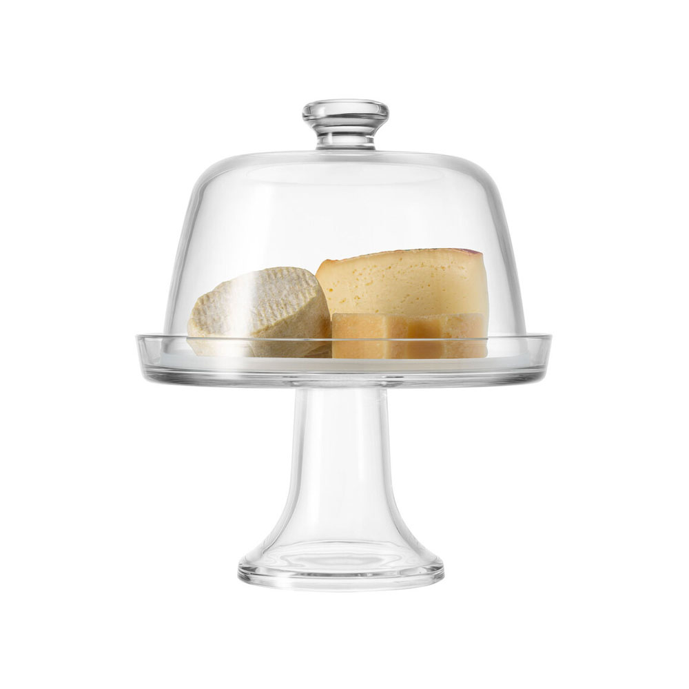 Крачен поднос с капак тип купол, марка Borgonovo, диаметър 22 см, изработена от стъкло, подходяща за сервиране на сирена.