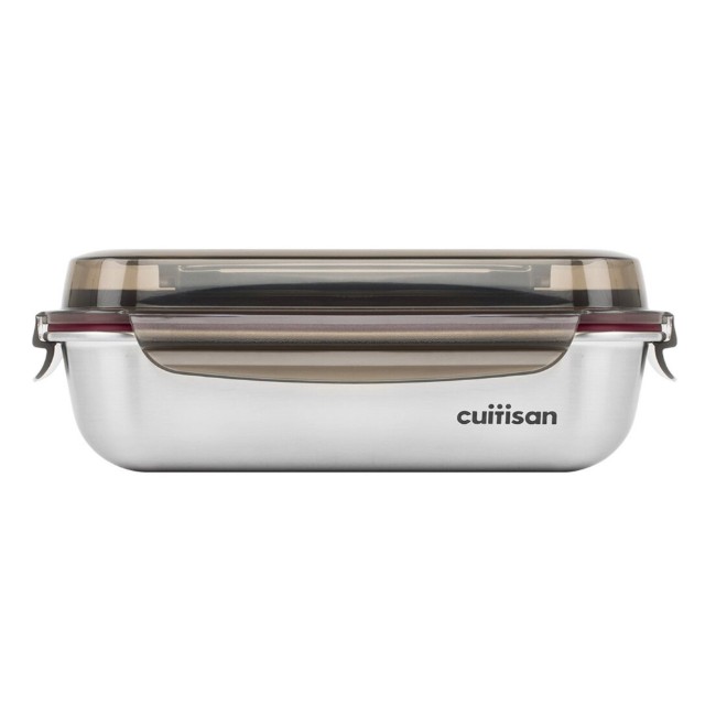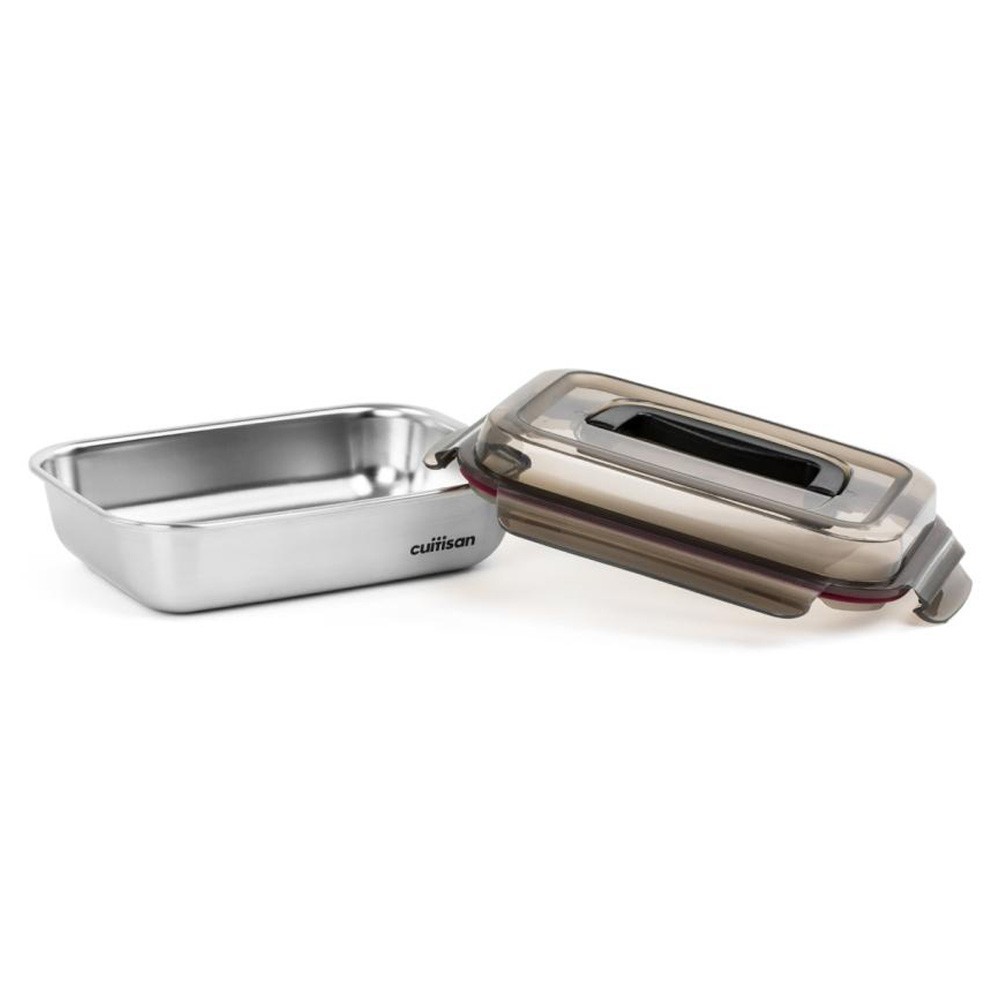 Правоъгълен съд за съхранение на храна, производство на Cuitisan, вместимост 1900 ml, размери 26,3 × 20 × 9,5 см, изработен от Cromosteel неръждаема стомана, с капак с полипропиленова дръжка.