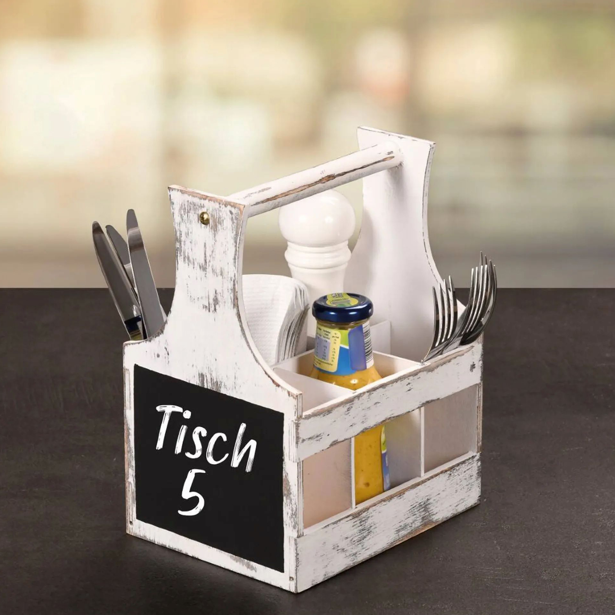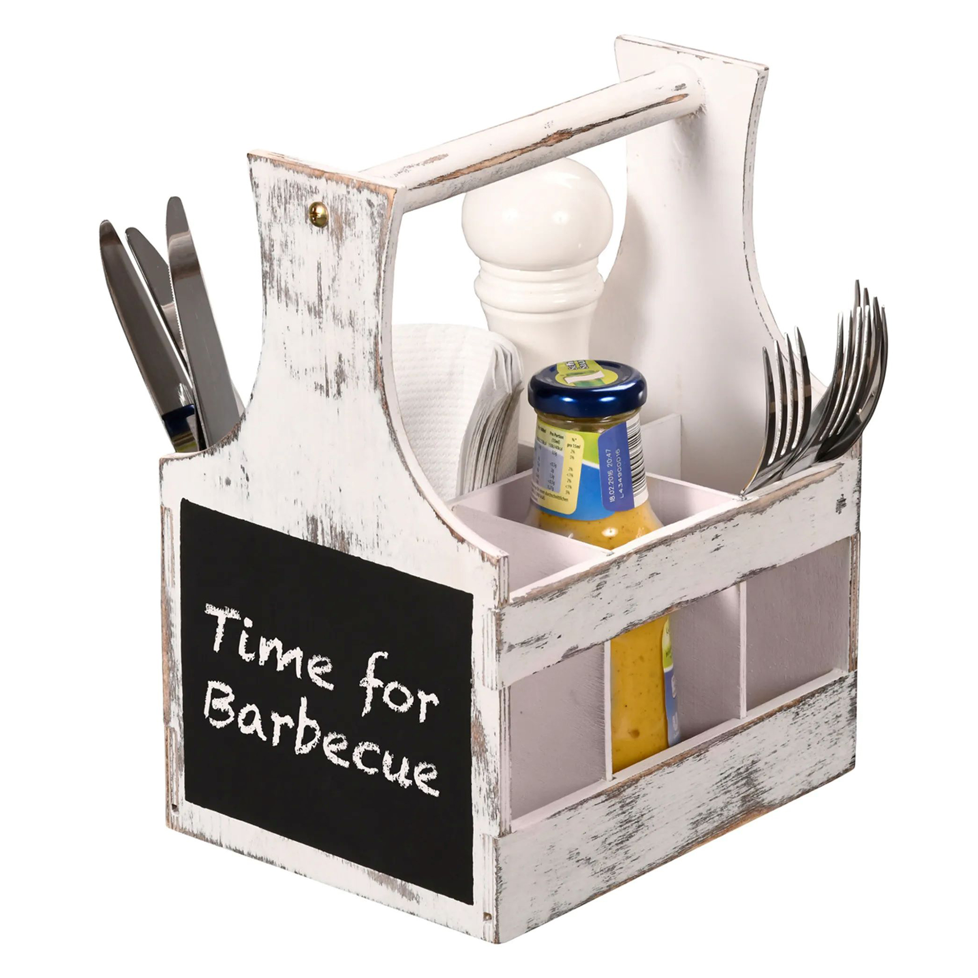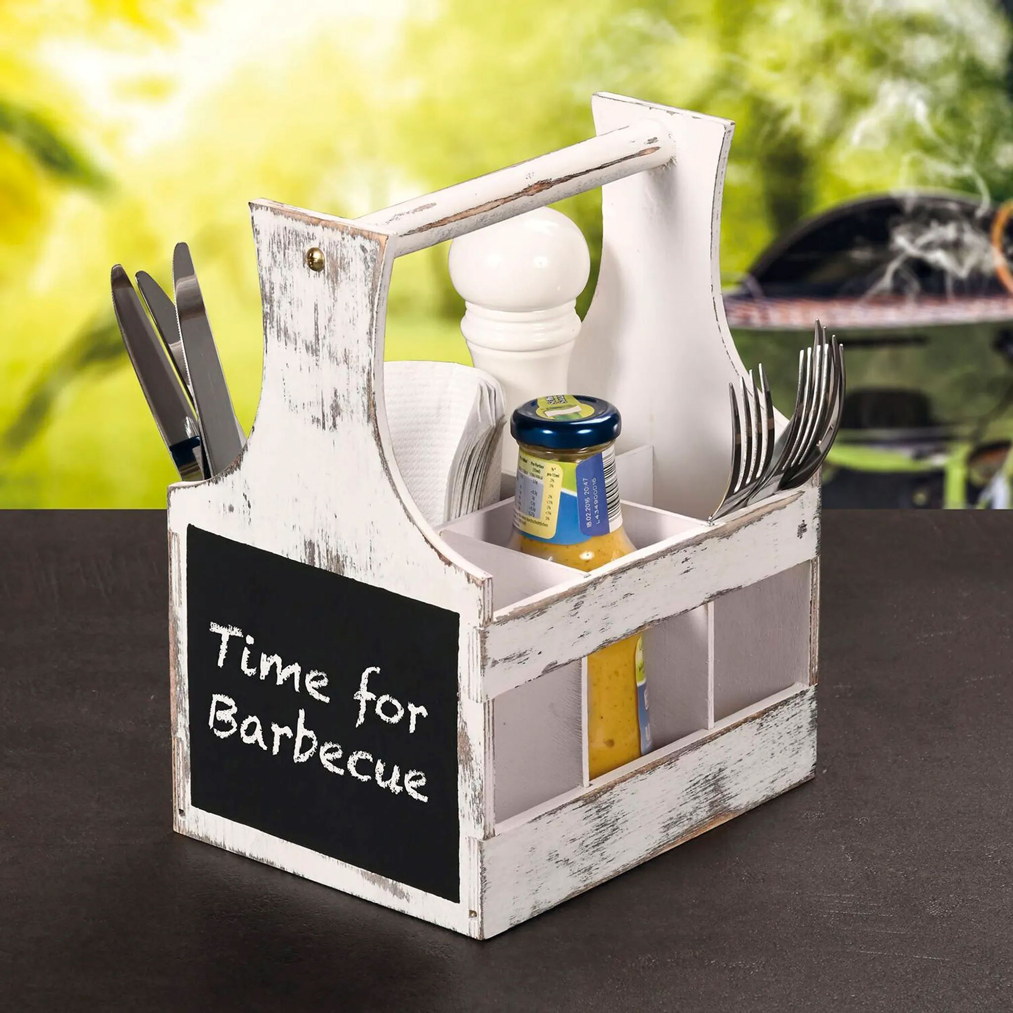 Този елегантен и функционален държач с 6 отделения е идеален за организиране на прибори, сосове, салфетки и подправки. Отличен помощник при барбекюта и партита, той лесно може да се носи до масата с помощта на практичната дръжка.