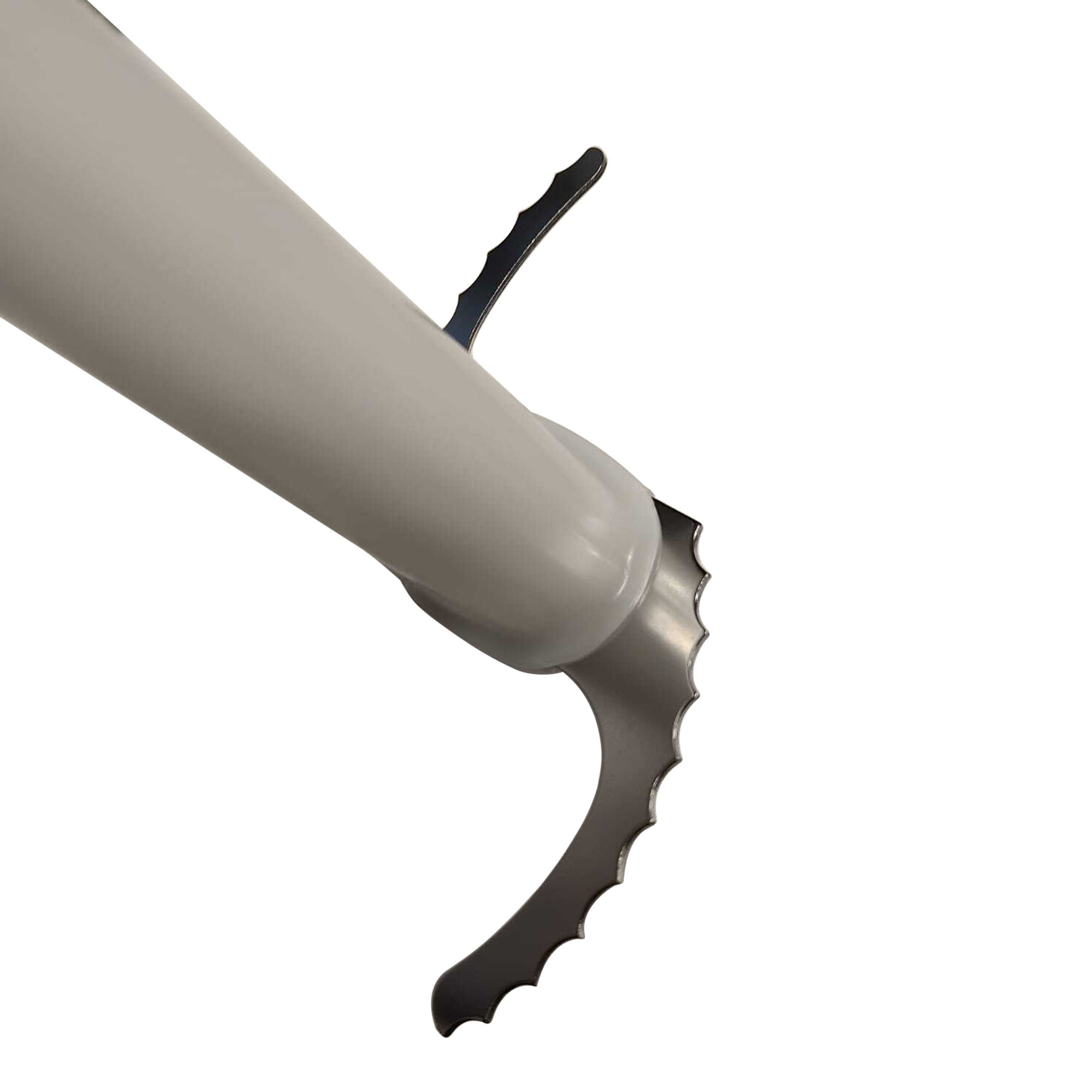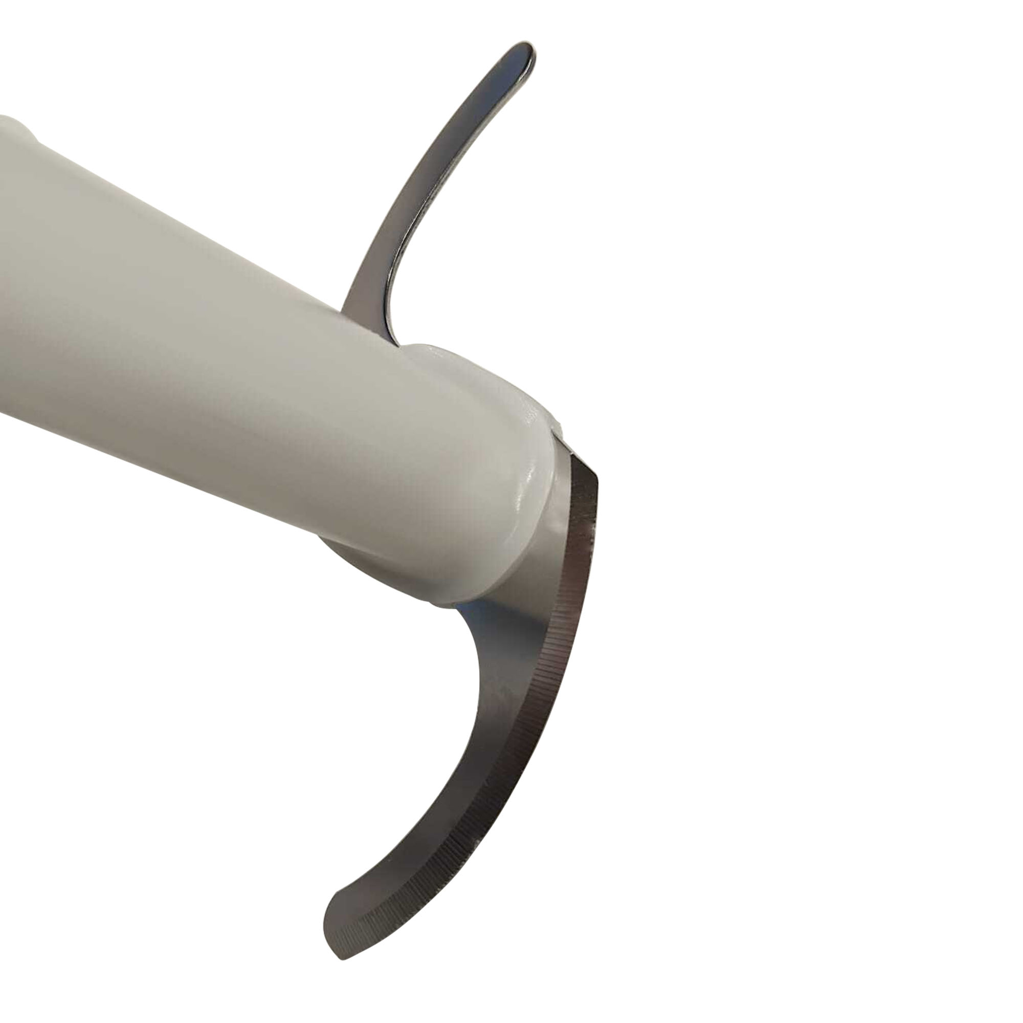 Снабден е с назъбено острие за лесно натрошаване на лед.