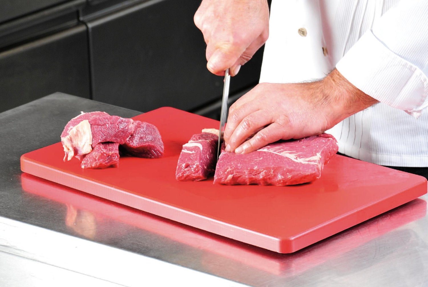 Дъска за кълцане, марка Kesper, размери 53 x 32,5 x 1,5 см, от пластмаса от червен цвят, специално предназначена за сурово червено месо (говеждо, свинско, агнешко).