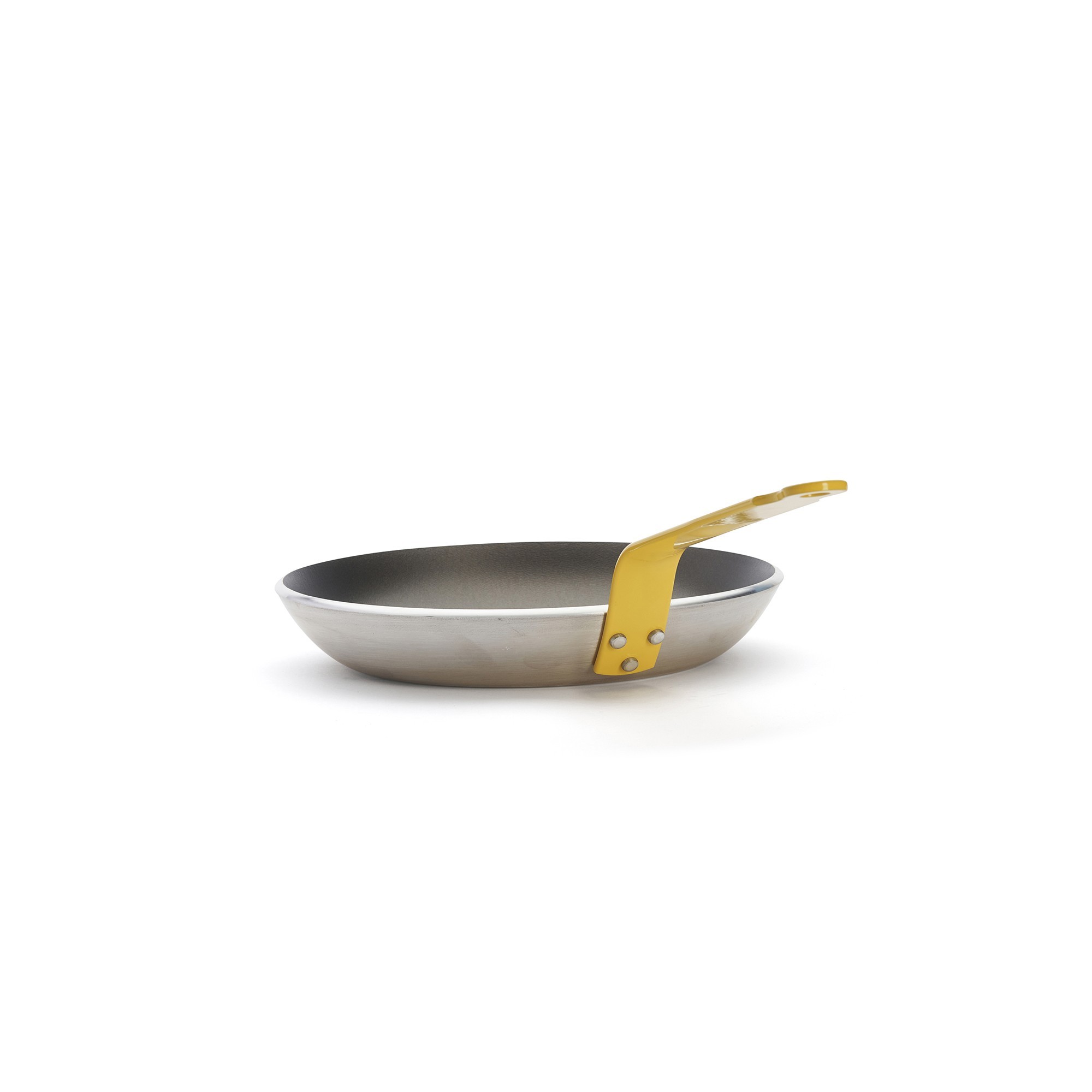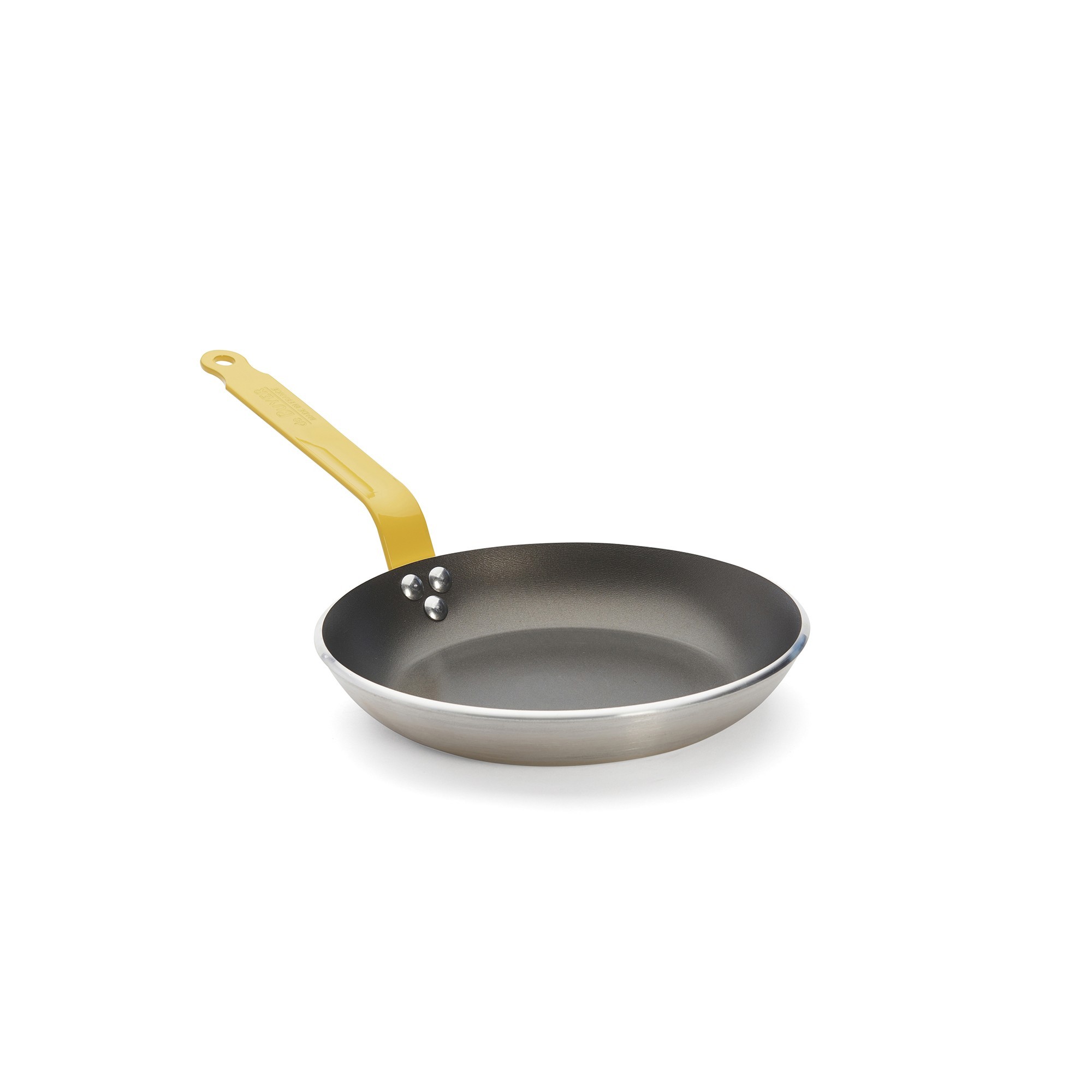 Много устойчивата дръжка на тигана е направена от стомана, подсигурена е с нитове и има жълт цвят за готвене на яйца.