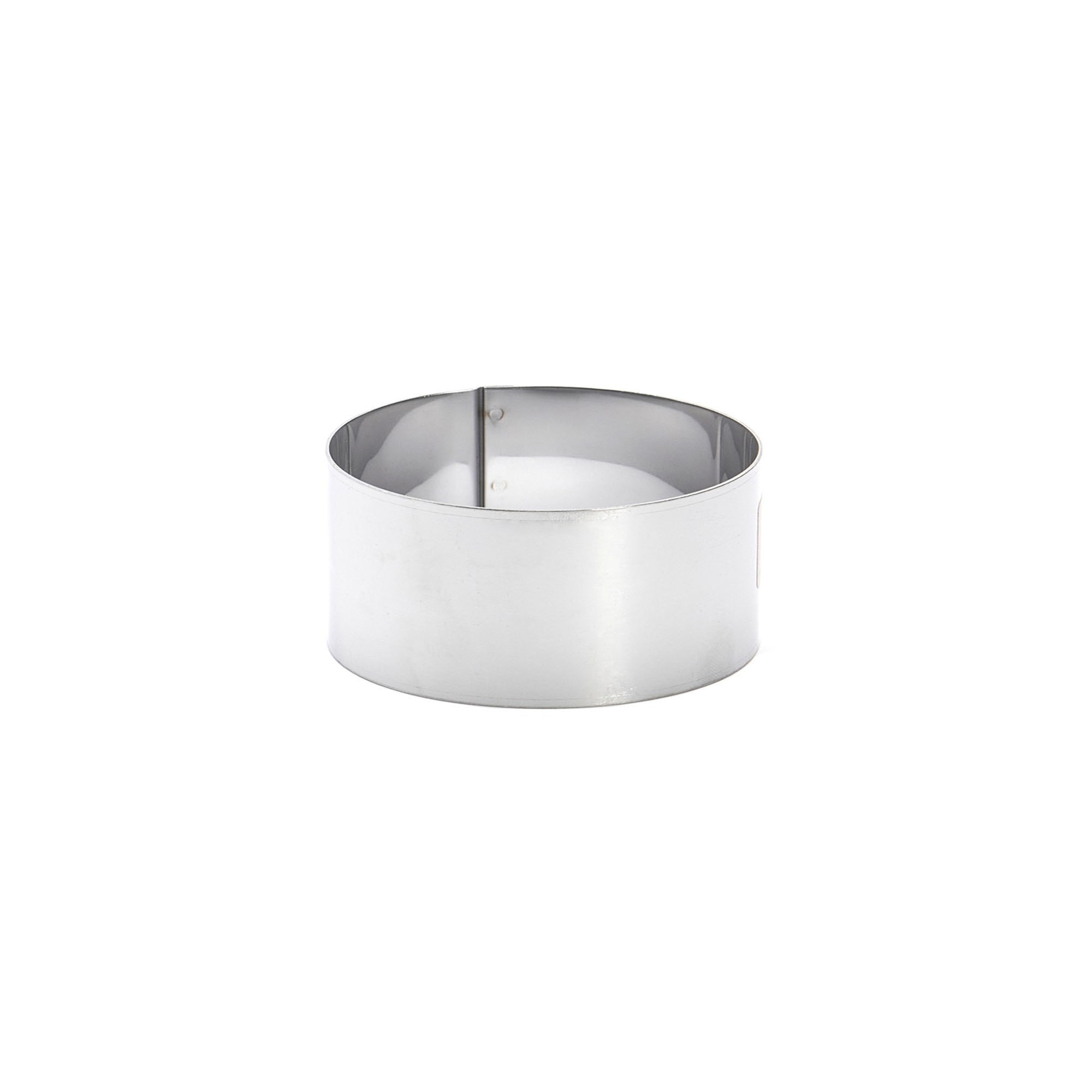 Кръгъл пръстен за тесто с прави ръбове, с височина 4,5 см и диаметър 12 см, изработен от неръждаема стомана, идеален за сглобяване на десерти и студено формоване, произведен от de Buyer.