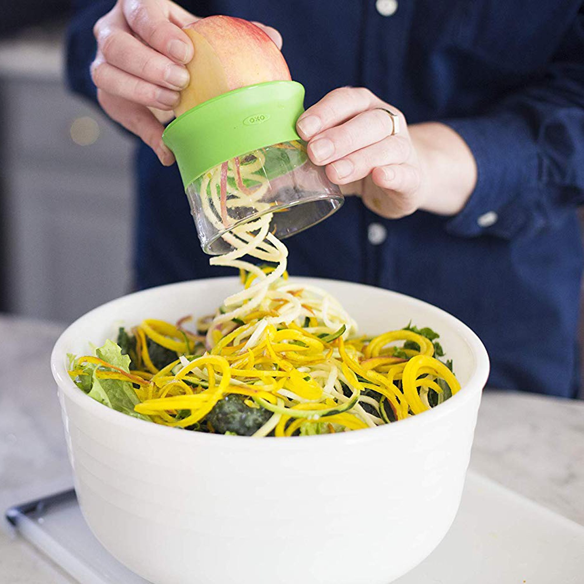 След това, спираловидното устройство за зеленчуци, марка OXO, с остриета от неръждаема стомана, подходящо за спираловидно завъртане на краставици, сладки картофи, zucchini или други кръгли и удължени зеленчуци, е решението, което търсите.