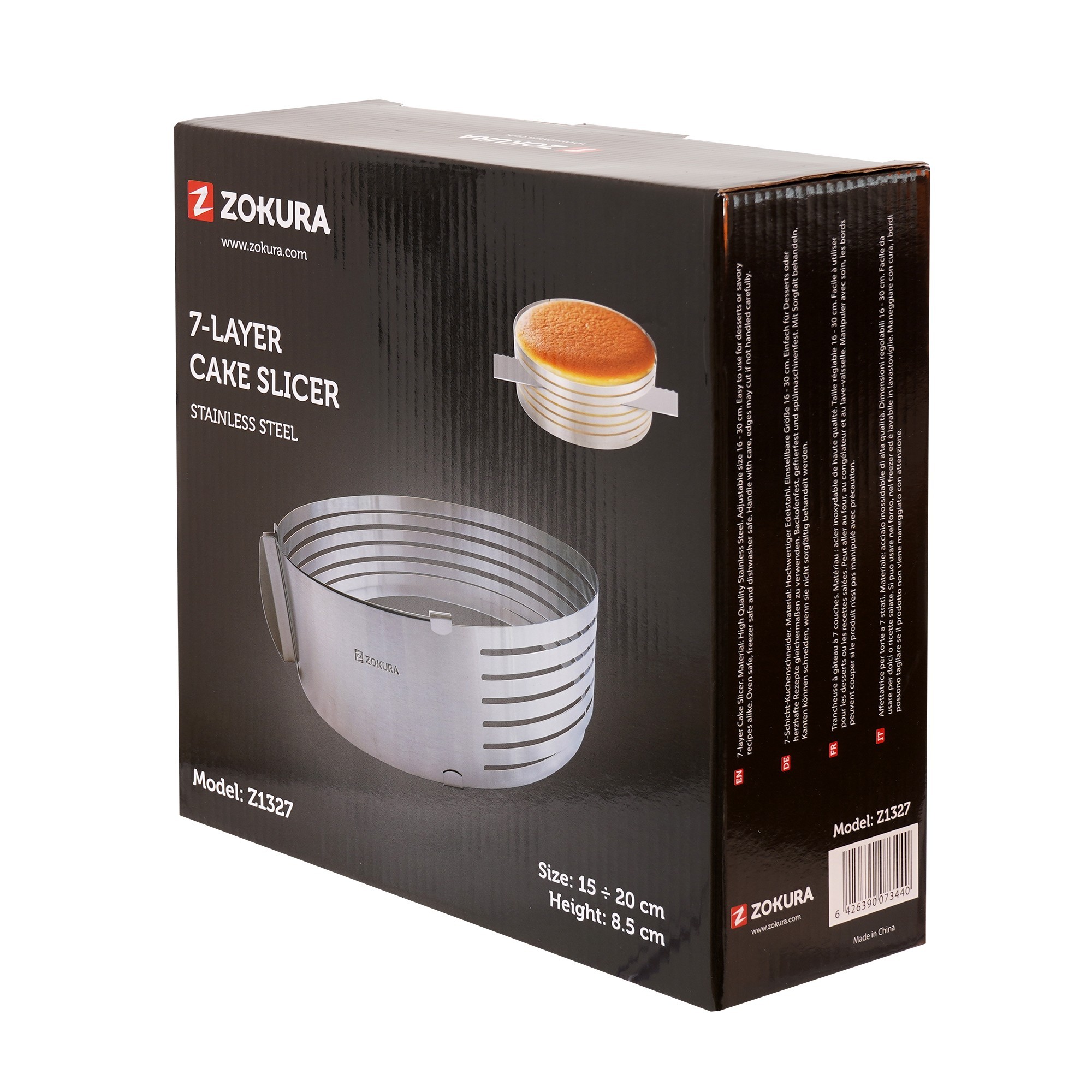 Регулируем ринг за нарязване на торта, състоящ се от 7 слоя, изработен от висококачествена неръждаема стомана 18/0 с дебелина 0,45 мм, регулируем диаметър между 15 и 20 см и височина 8,5 см, марка Zokura