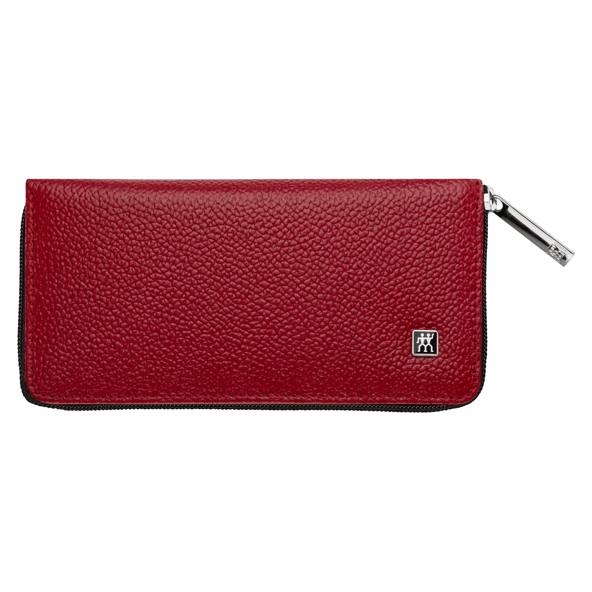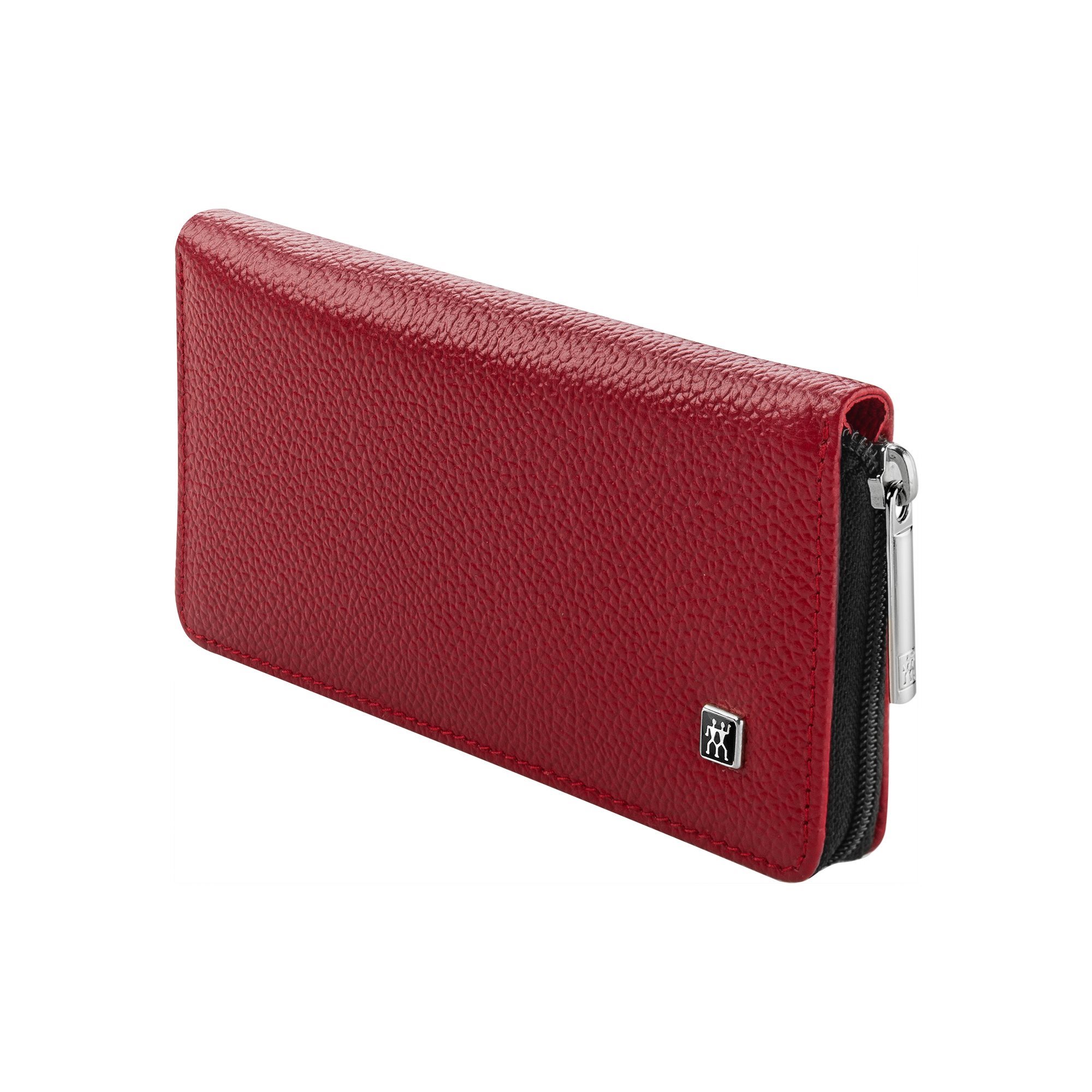 Калъф с цип, червена лъскава кожа отвън и черна кожена вътрешност.