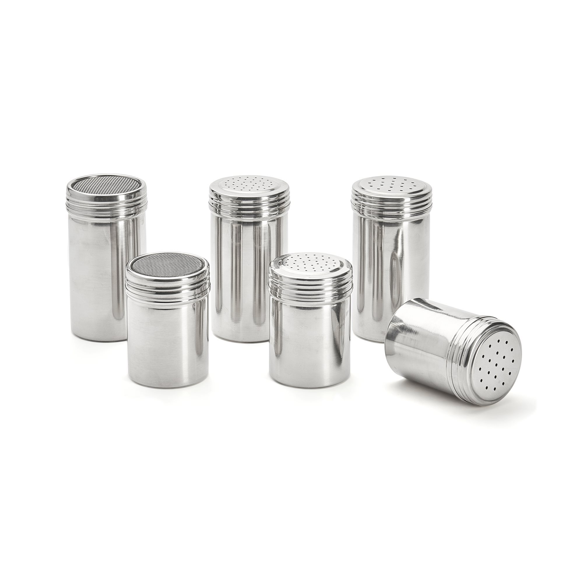 Съд от неръждаема стомана за поръсване на подправки с размери 7×10 см, произведен от de Buyer, идеален за поръсване на пудра захар, брашно, какао, канела, кокос на прах, подправки, кристална захар.