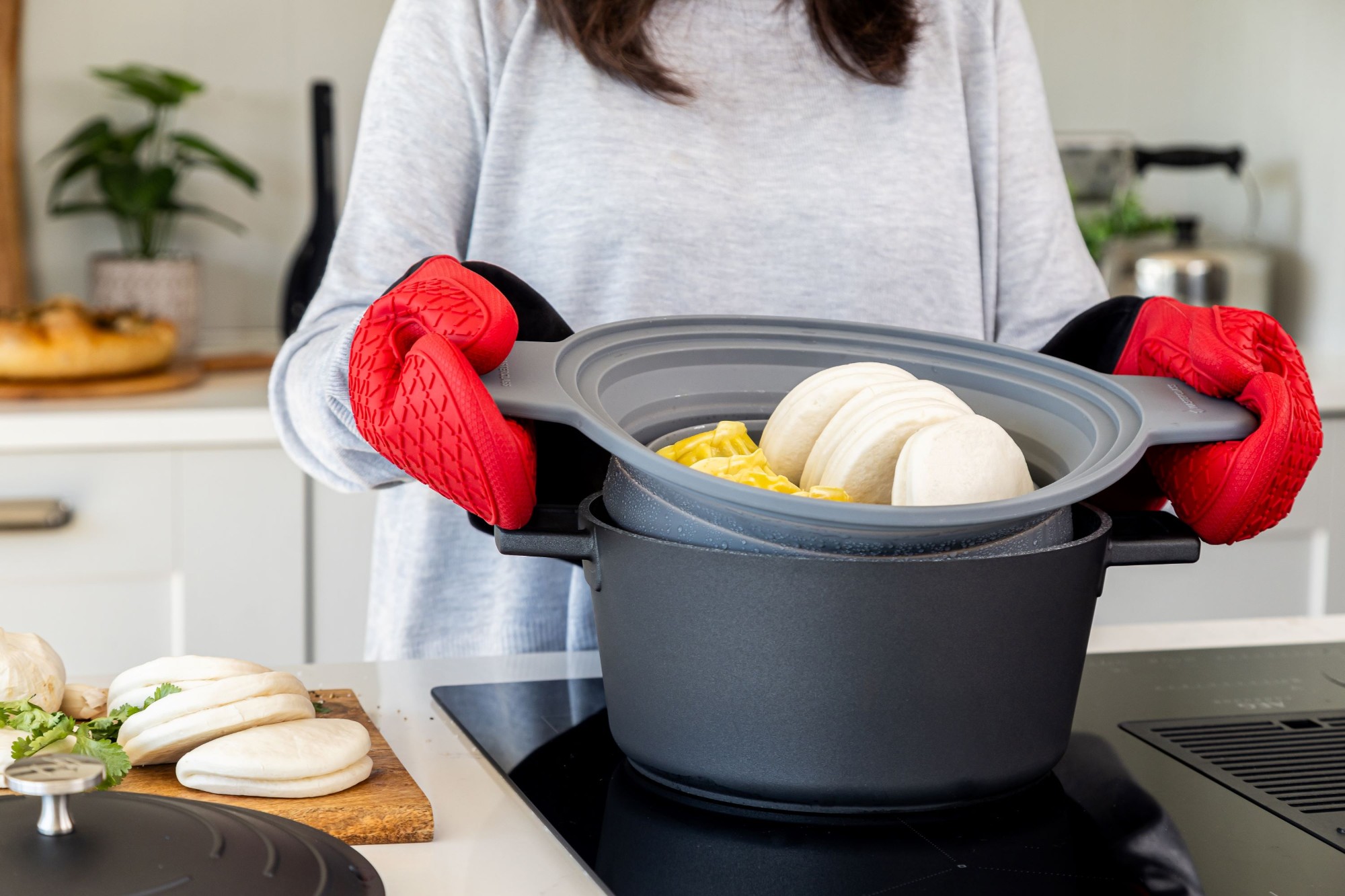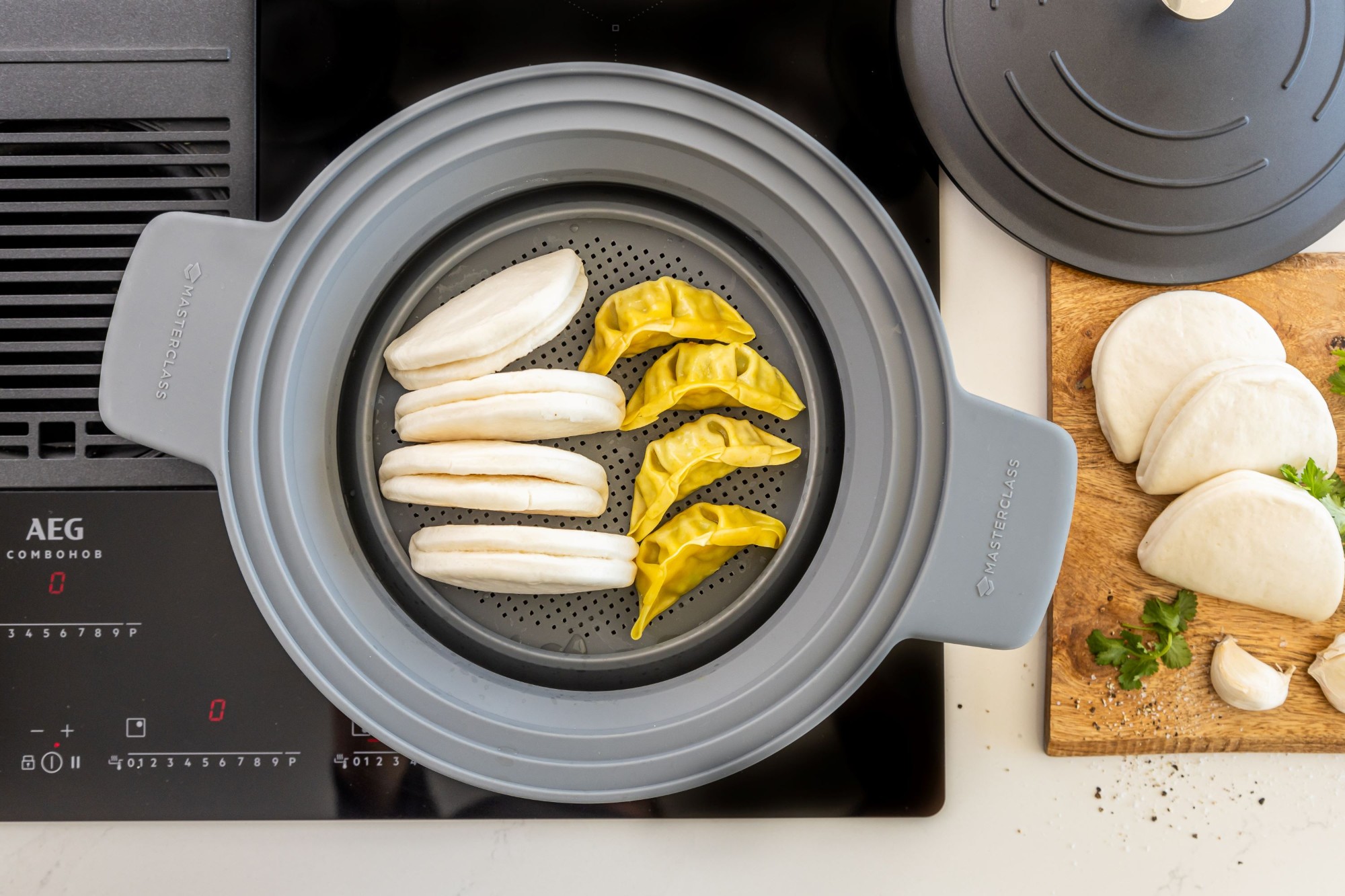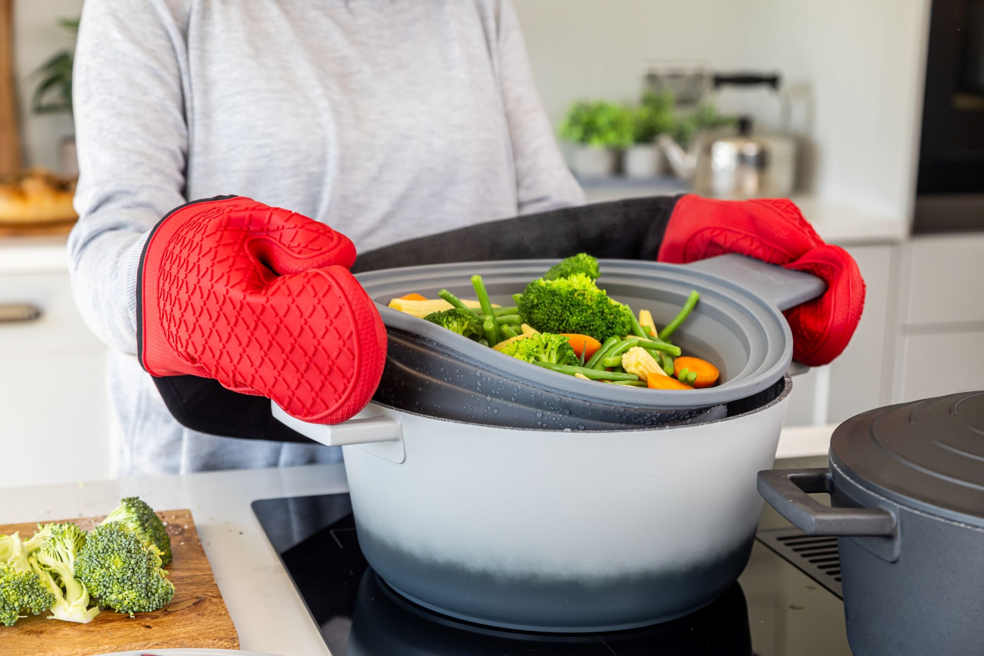 Цедка и кошница за параход 2 в 1, изработени от силикон, произведени от MasterClass, с размери 39 х 29 см.