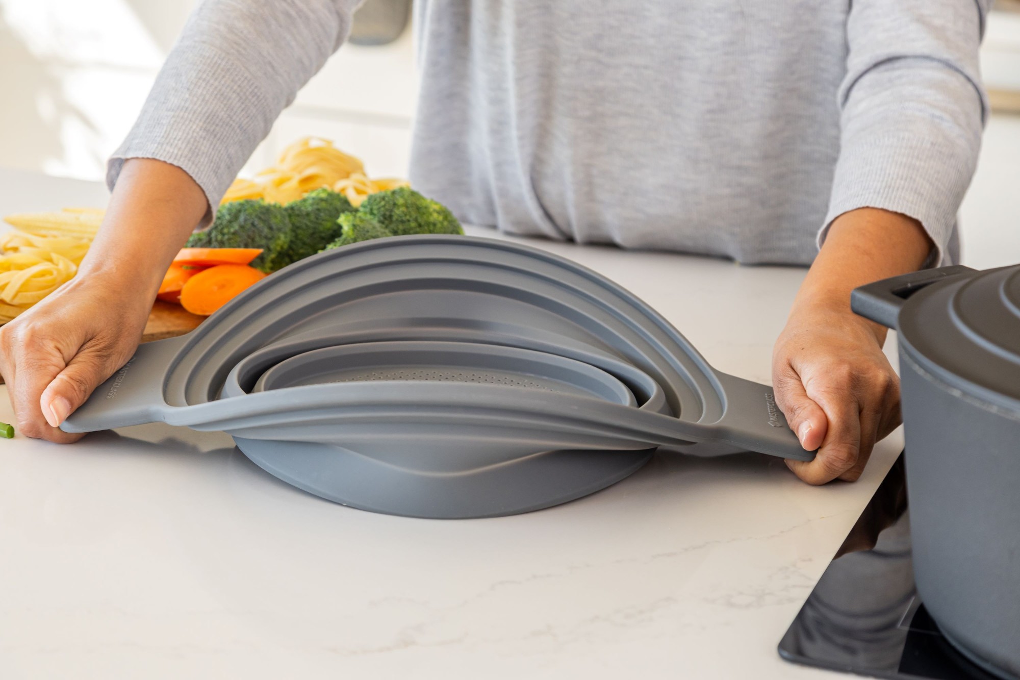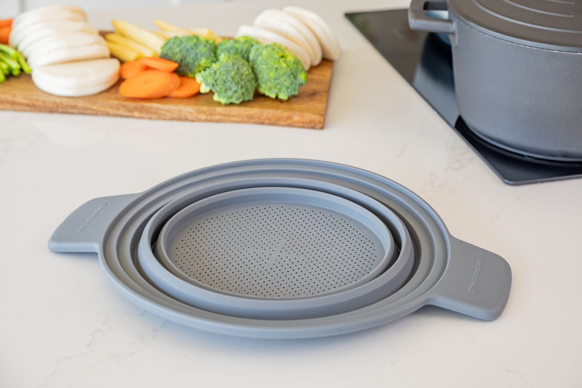 Многофункционалната сгъваема цедка за храна е проектирана за удобство и спестяване на място.
