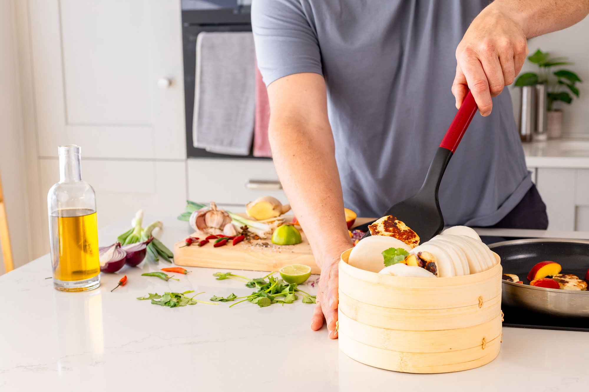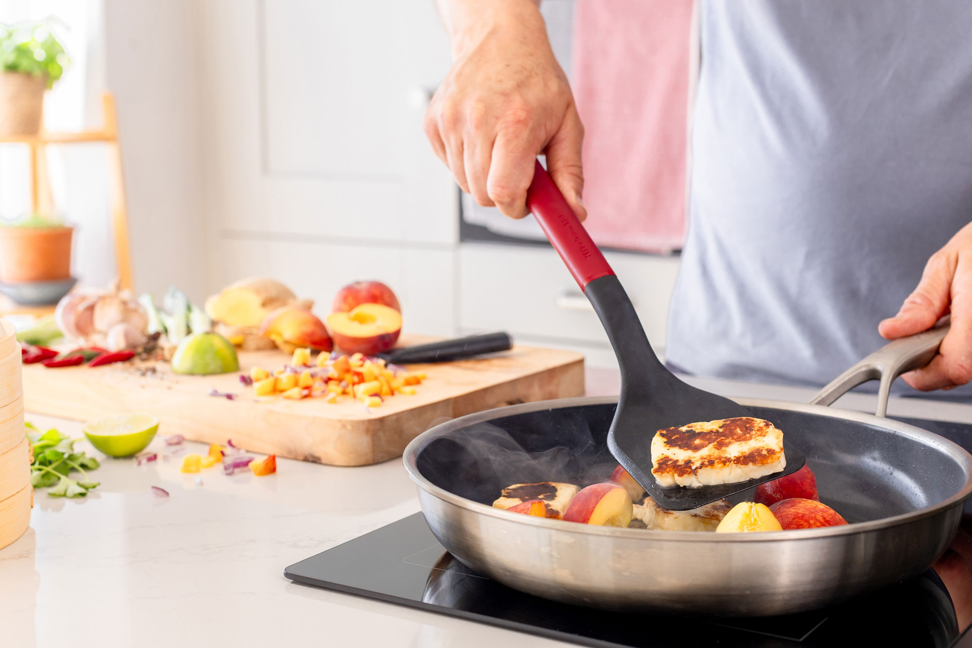 Голямата глава осигурява стабилна повърхност за яйца, палачинки, бургери и други , и е устойчива на топлина до 232°C/450°F.