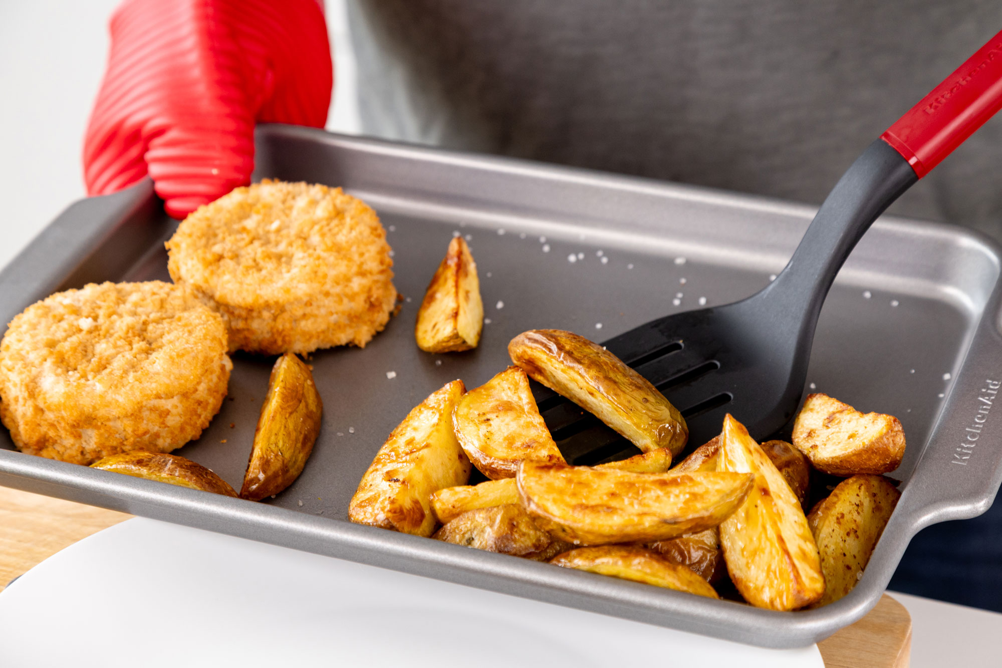 Шпатула с прорези, произведена от KitchenAid, изработена от пластмаса, безопасна за използване с всички видове съдове за готвене, включително тези с незалепващи покрития.