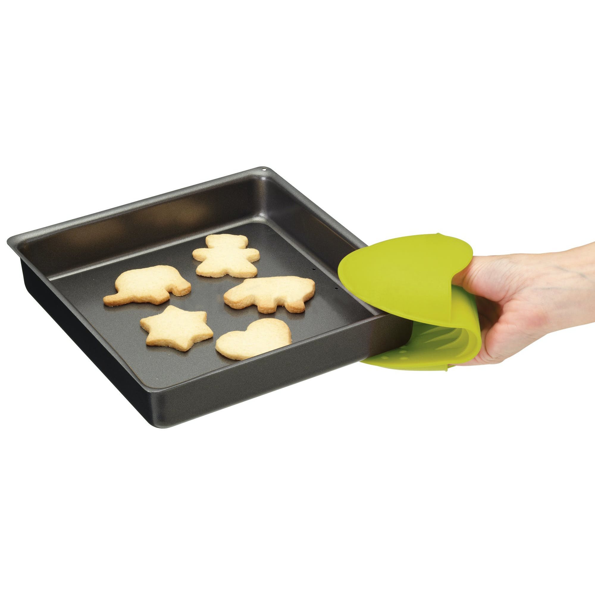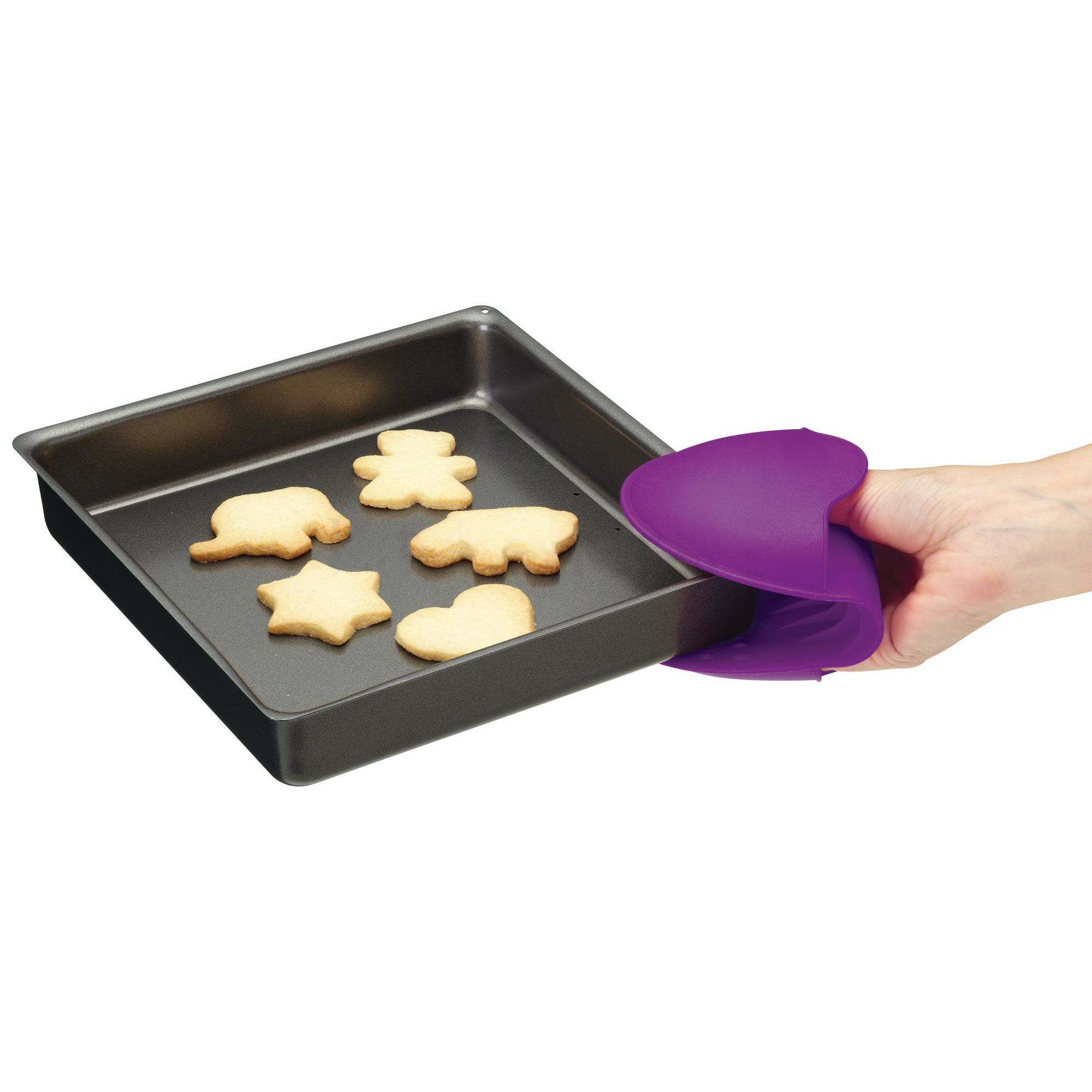 Изработена от гъвкав, неплъзгащ се силикон, устойчив на топлина до 260°C, защитната ръкавица за фурна е с размери 9 x 10,5 см и може да се прикрепи към фурна, микровълнова или хладилник благодарение на магнита, с който е снабден.
