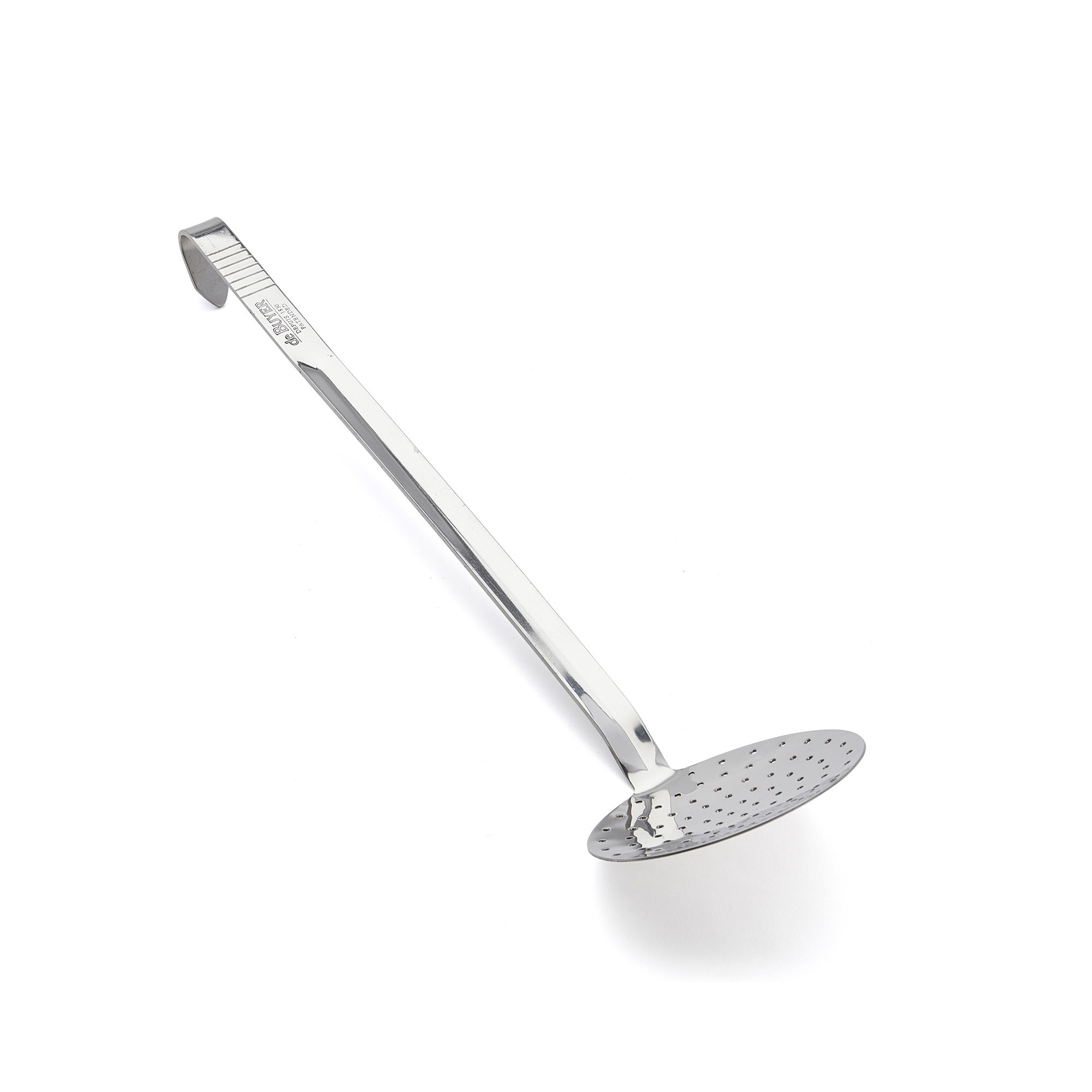 Инструментът за премахване на пяна е полезен за отстраняване на деликатни храни (грисове за кнедли, ньоки, равиоли) и източване на течности, изработен е от неръждаема стомана с широка дръжка с дебелина 2,5 мм.