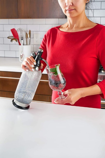 Сега има лесен, удобен и щадящ околната среда начин за получаване и съхранение на газирана вода без електричество и безпорядък върху плота с помощта на Sodamaker Classic. Продуктът е с вместимост 1 л и модерна визия, с отличителна мрежа от неръждаема стомана.