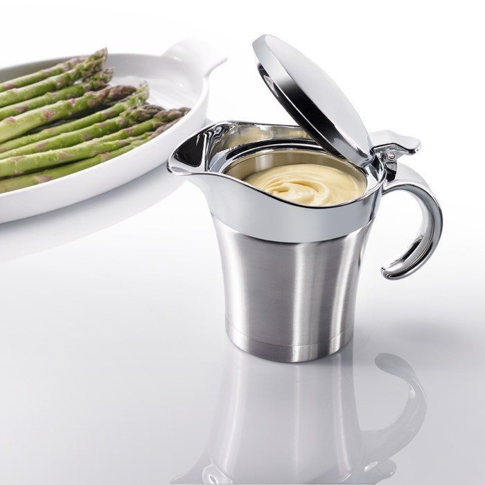 Контейнерът има двойни стени от неръждаема стомана и хромиран пластмасов капак, който се отваря с едно натискане на скобата. Така тази лодка за сос може да се използва с една ръка.