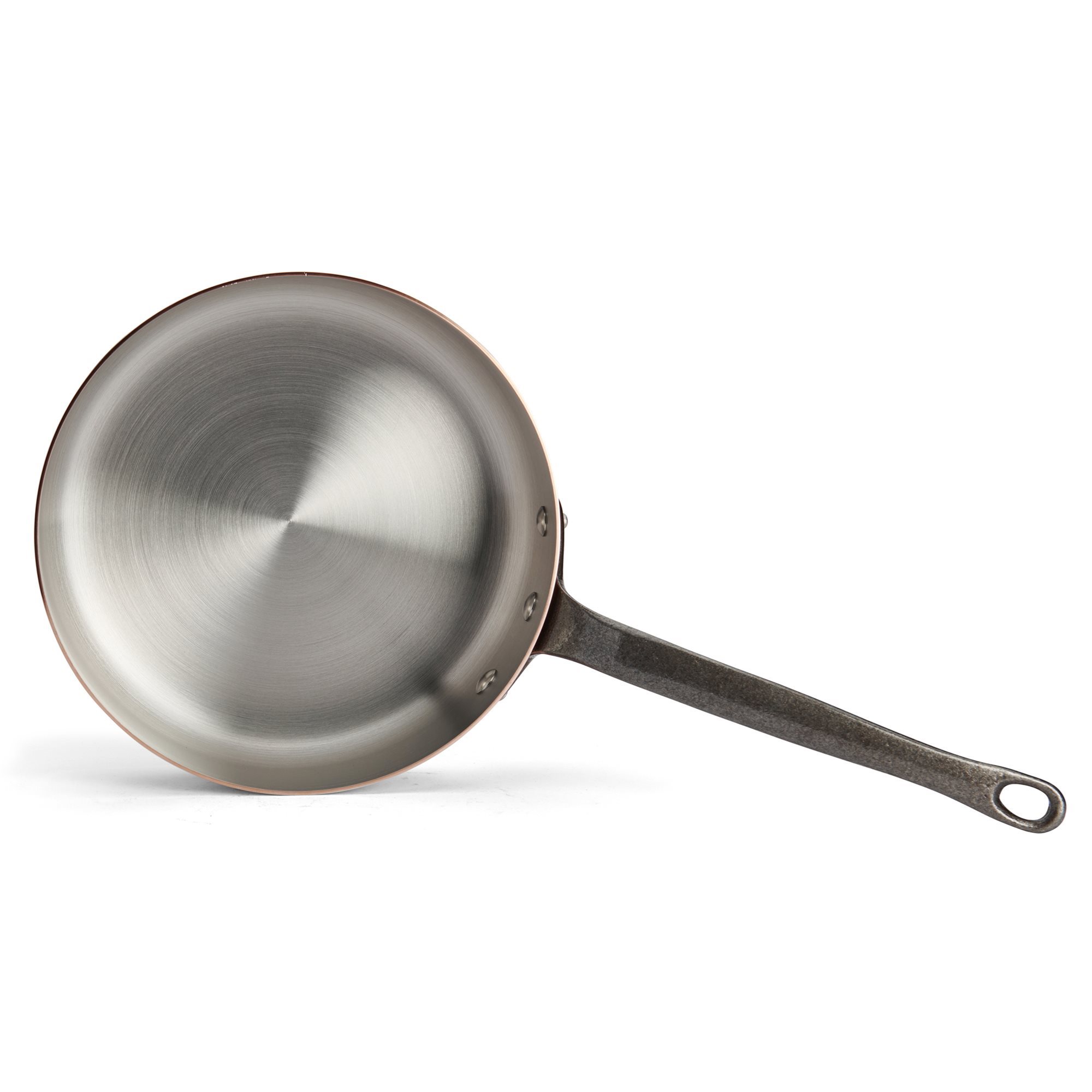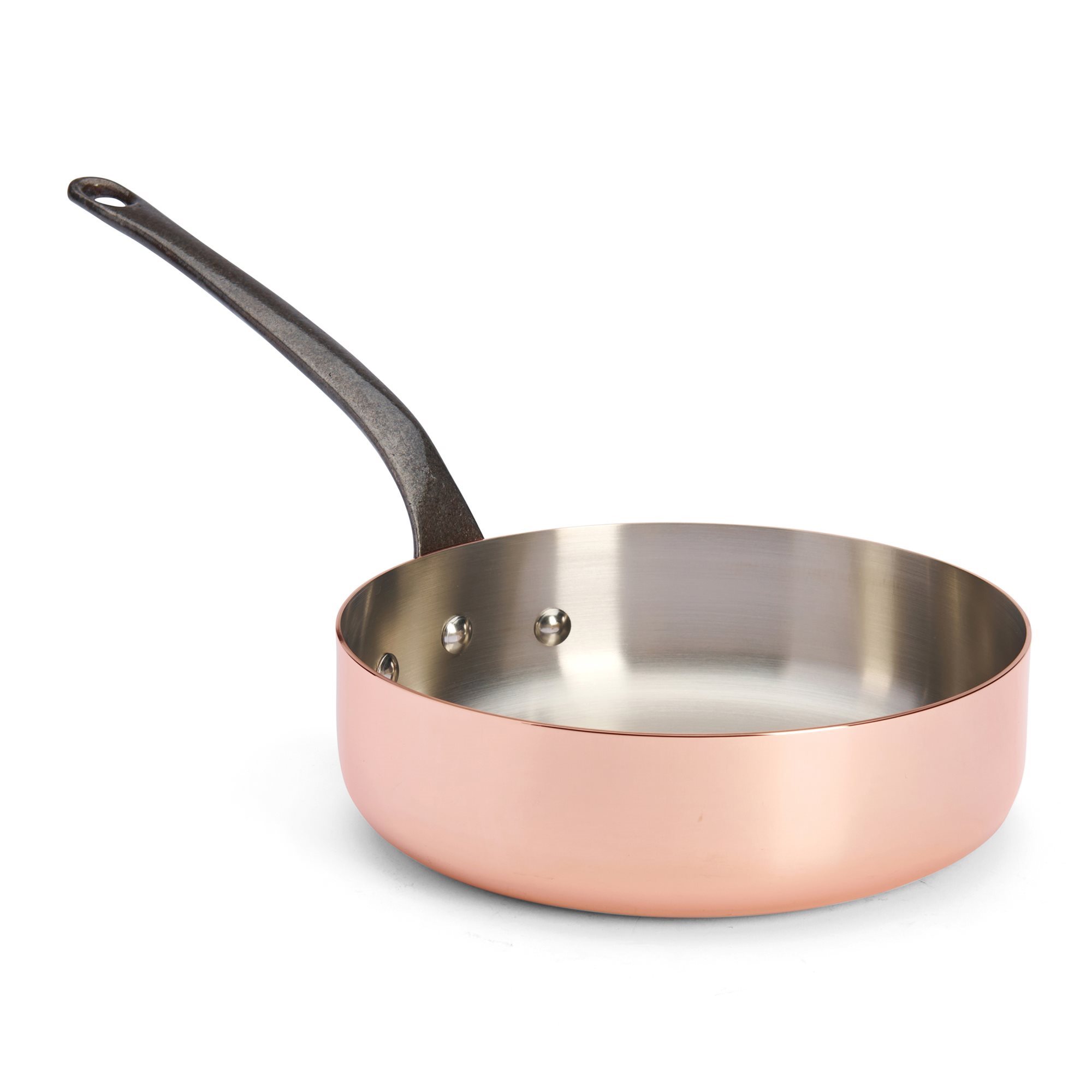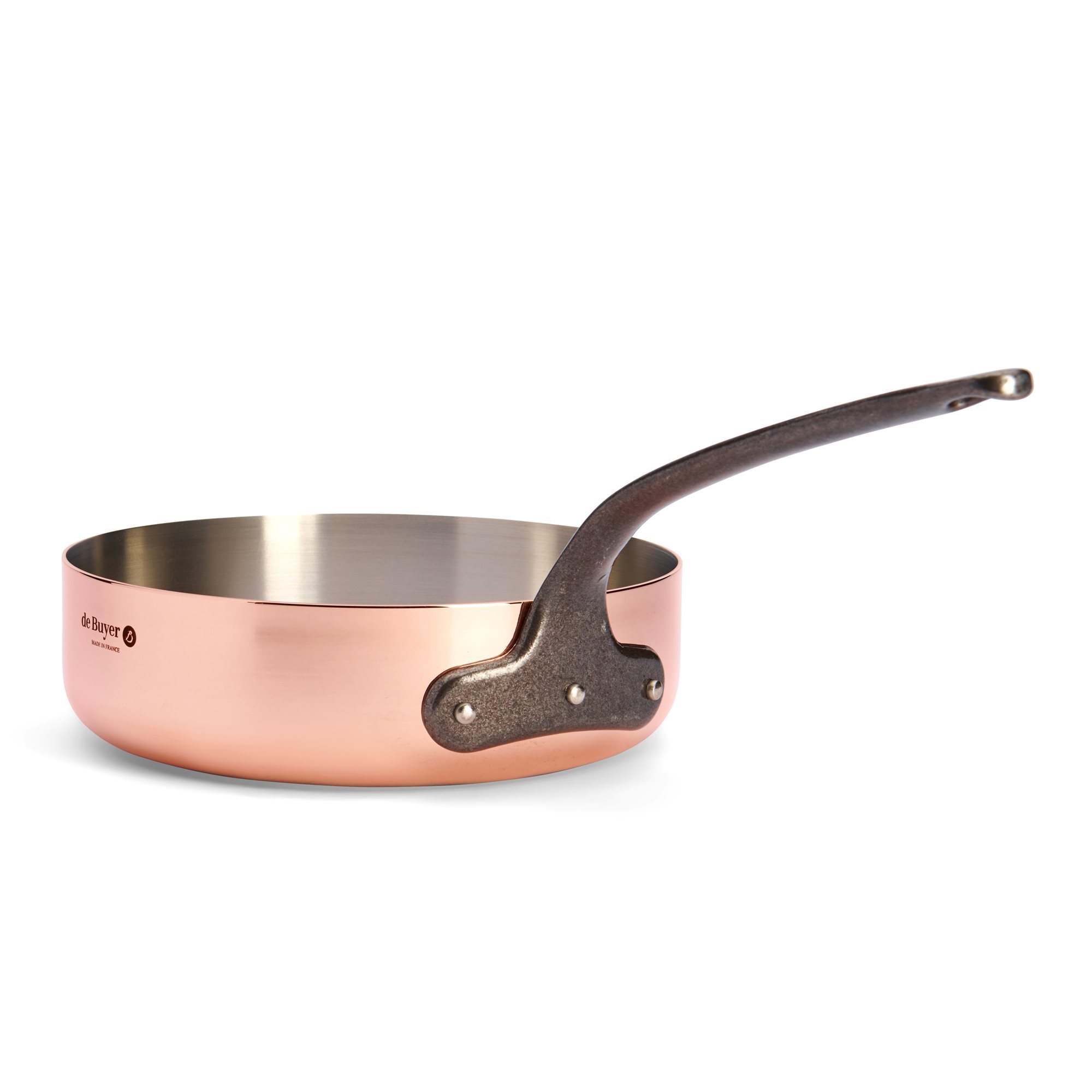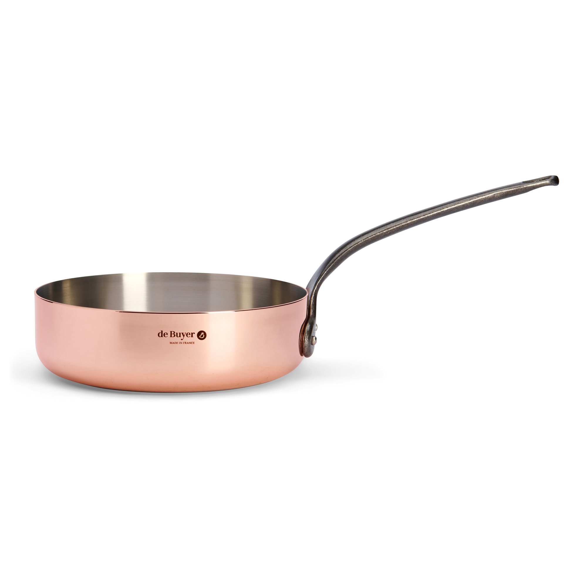 "Inocuivre First Classe" сауте тиган, с чугунена дръжка, диаметър 24 см, капацитет 3.1 л, направен от мед, от външната страна, и неръждаема стомана, от вътрешната страна, дебелина на материала 2 мм,de Buyer марка.