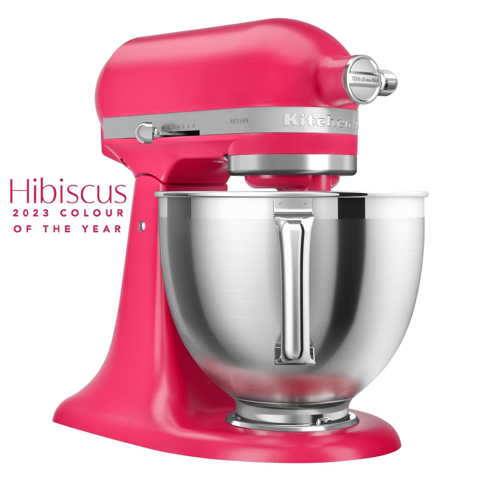 KitchenAid признава силата на цвета от пускането на първите цветове на стоящите миксери през 1955 г. Днес Цветът на марката на годината използва глобалните тенденции, за да улови текущия момент и да вдъхнови производителите по целия свят. Hibiscus, жива и буйна фуксия, е изборът на KitchenAid за 2023 г.