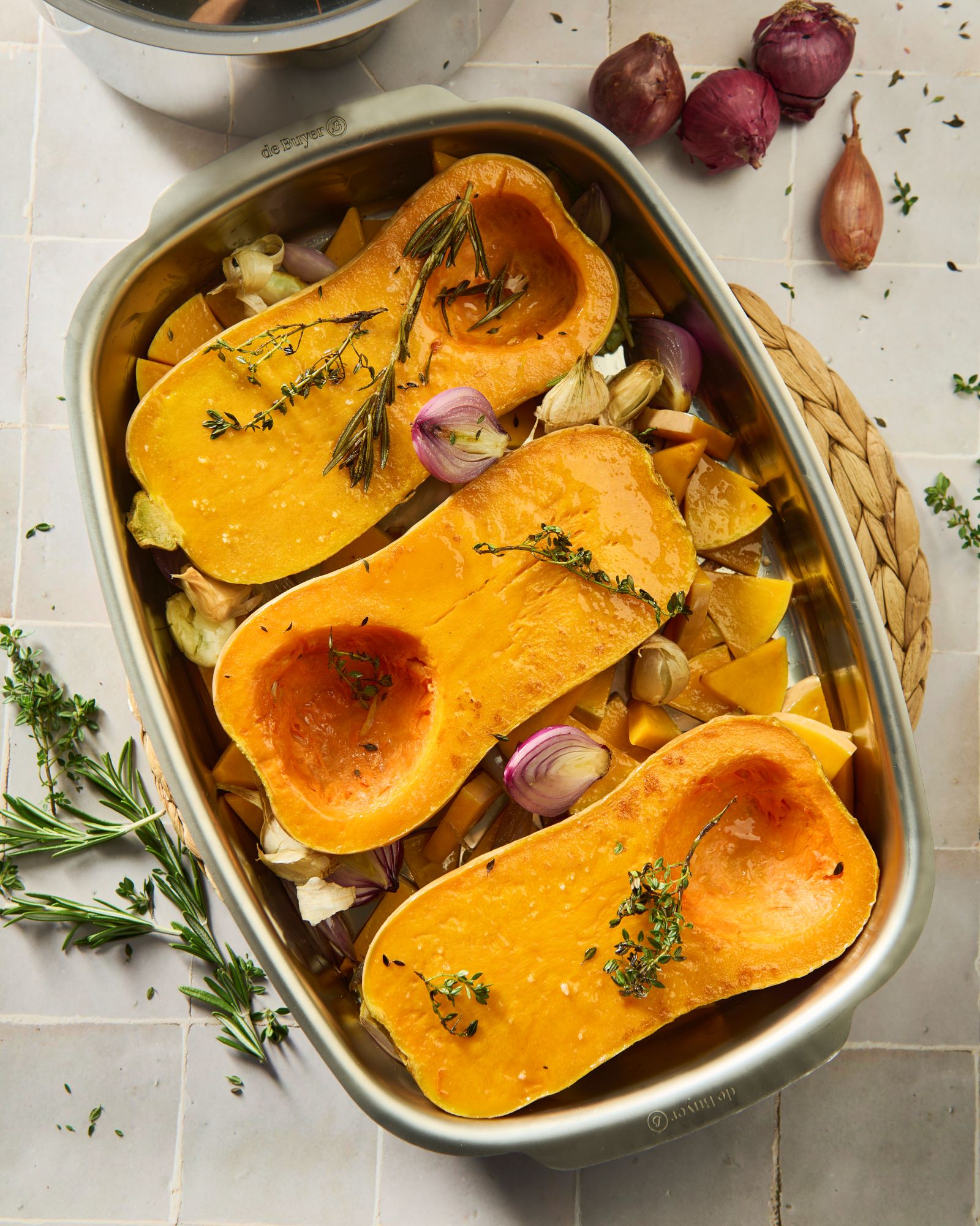 Здрава и издръжлива, тавата издържа на високи температури и е устойчива на надрасквания. Лесен е за поддръжка и може да се почиства в съдомиялната. Просторна, но компактна благодарение на интегрираните си дръжки, тази правоъгълна тава е идеална за до 8 души.