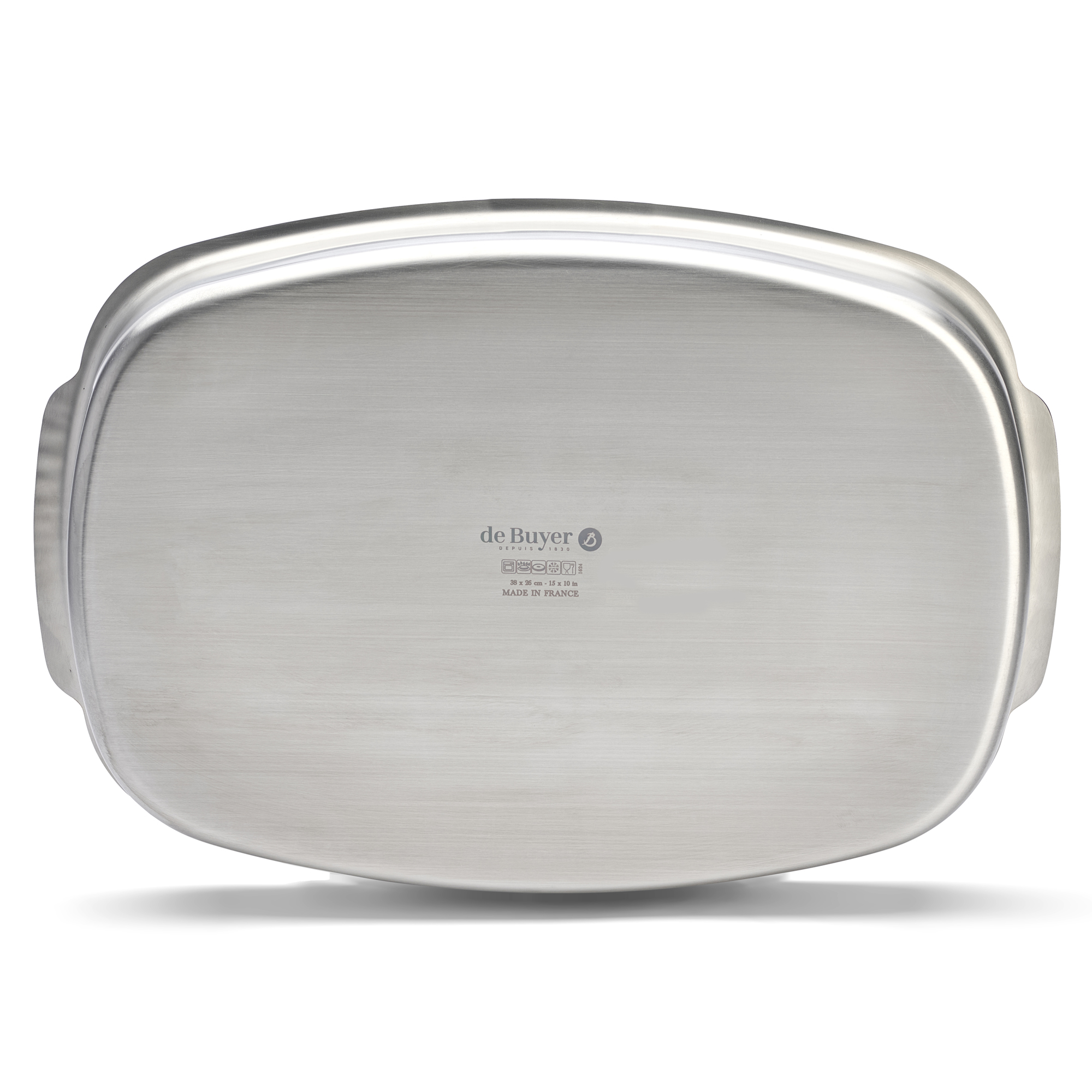 Правоъгълна тава за стек, изработена от неръждаема стомана, с вътрешни размери 38 x 26 см, произведена от de Buyer.