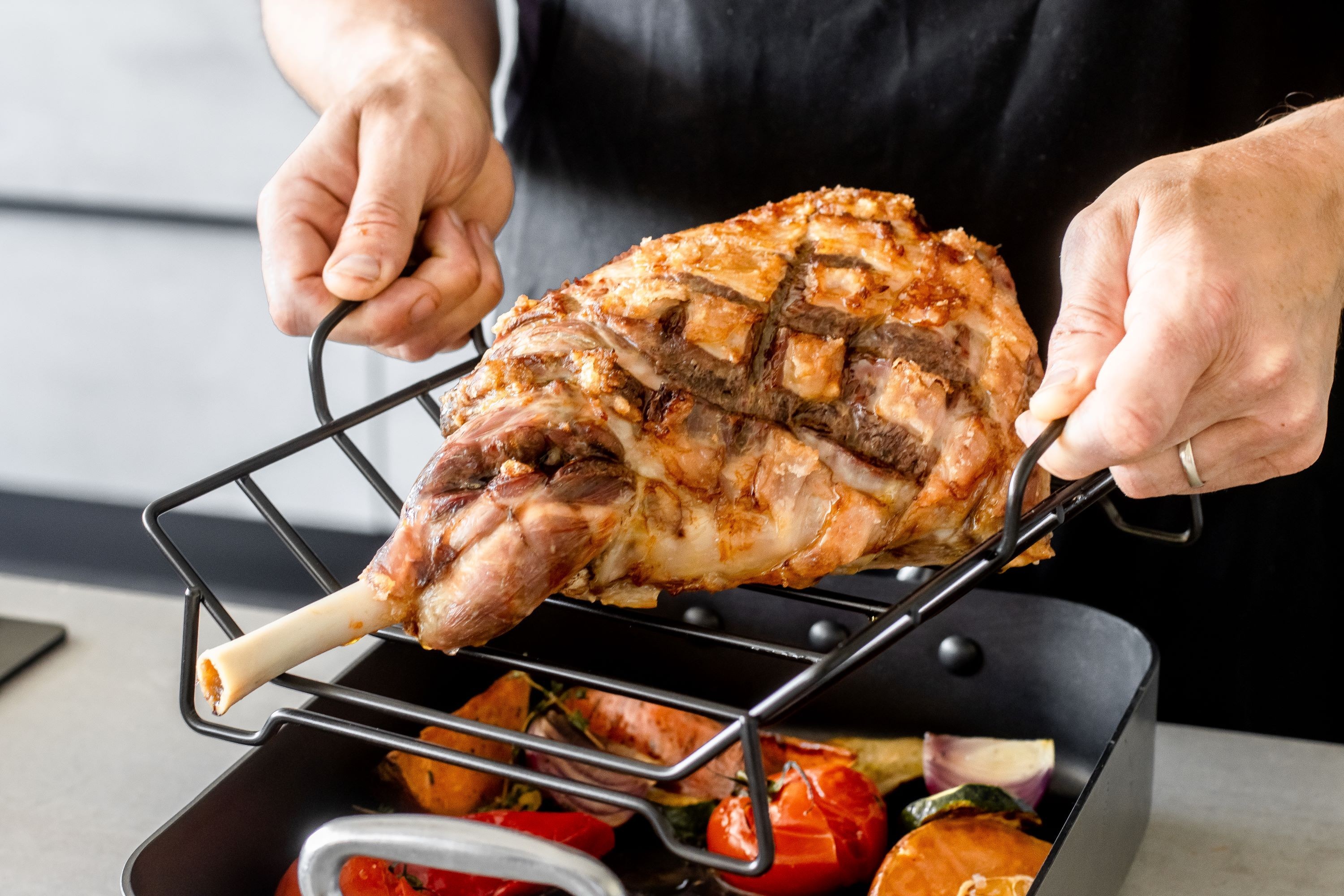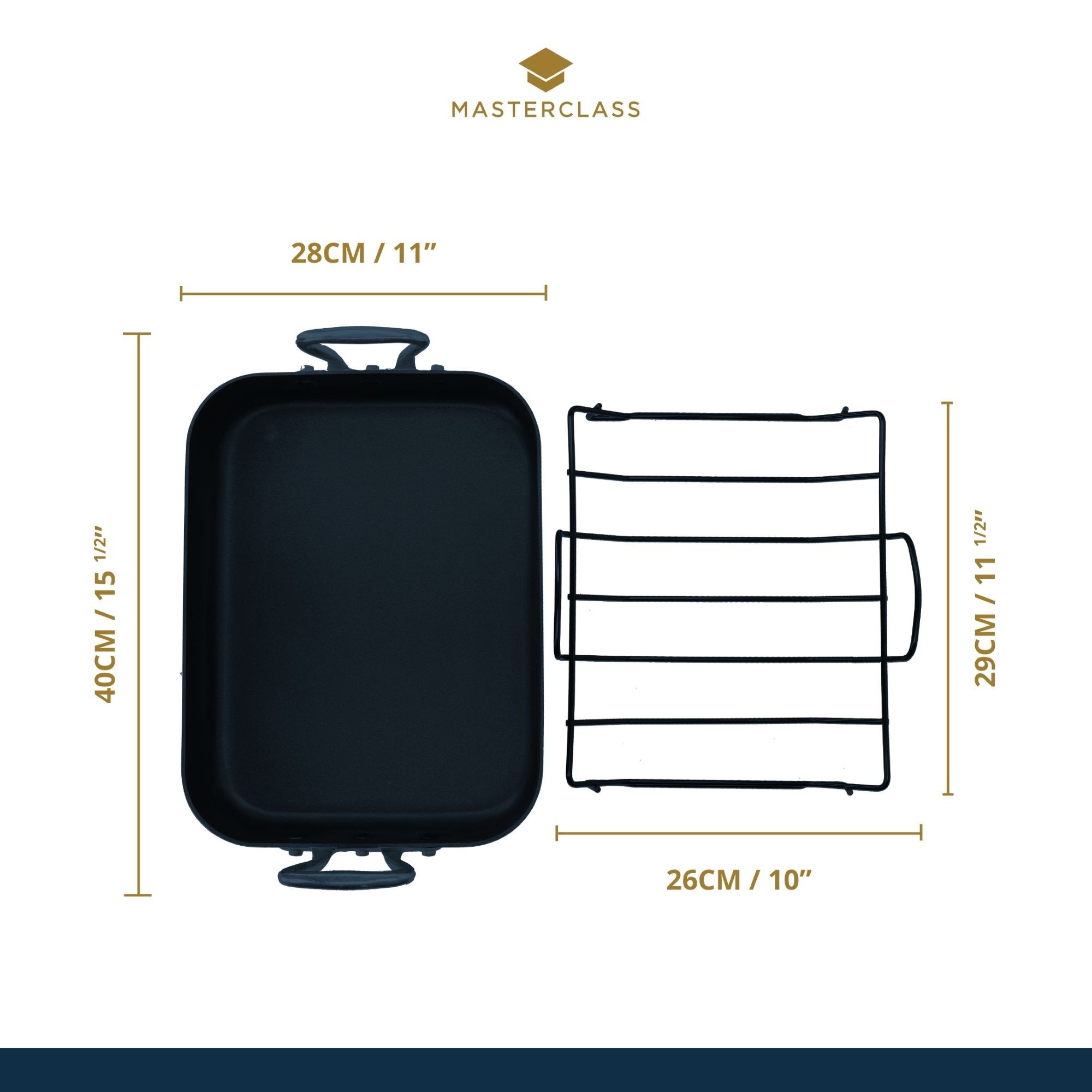 Тава за готвене на пържола, произведена от MasterClass, снабдена с разглобяема скара вътре.