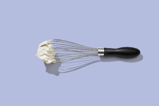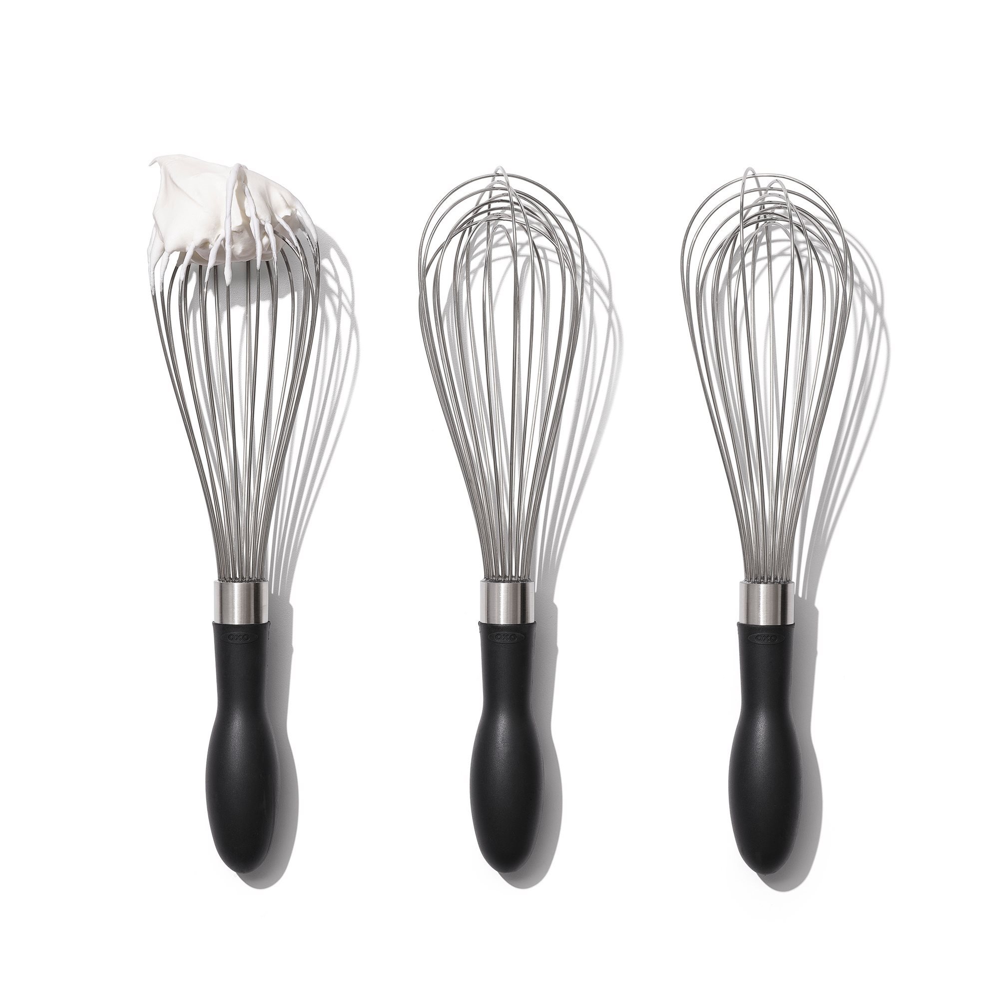 Телена бъркалка марка OXO, изработена от неръждаема стомана с ергономична дръжка.