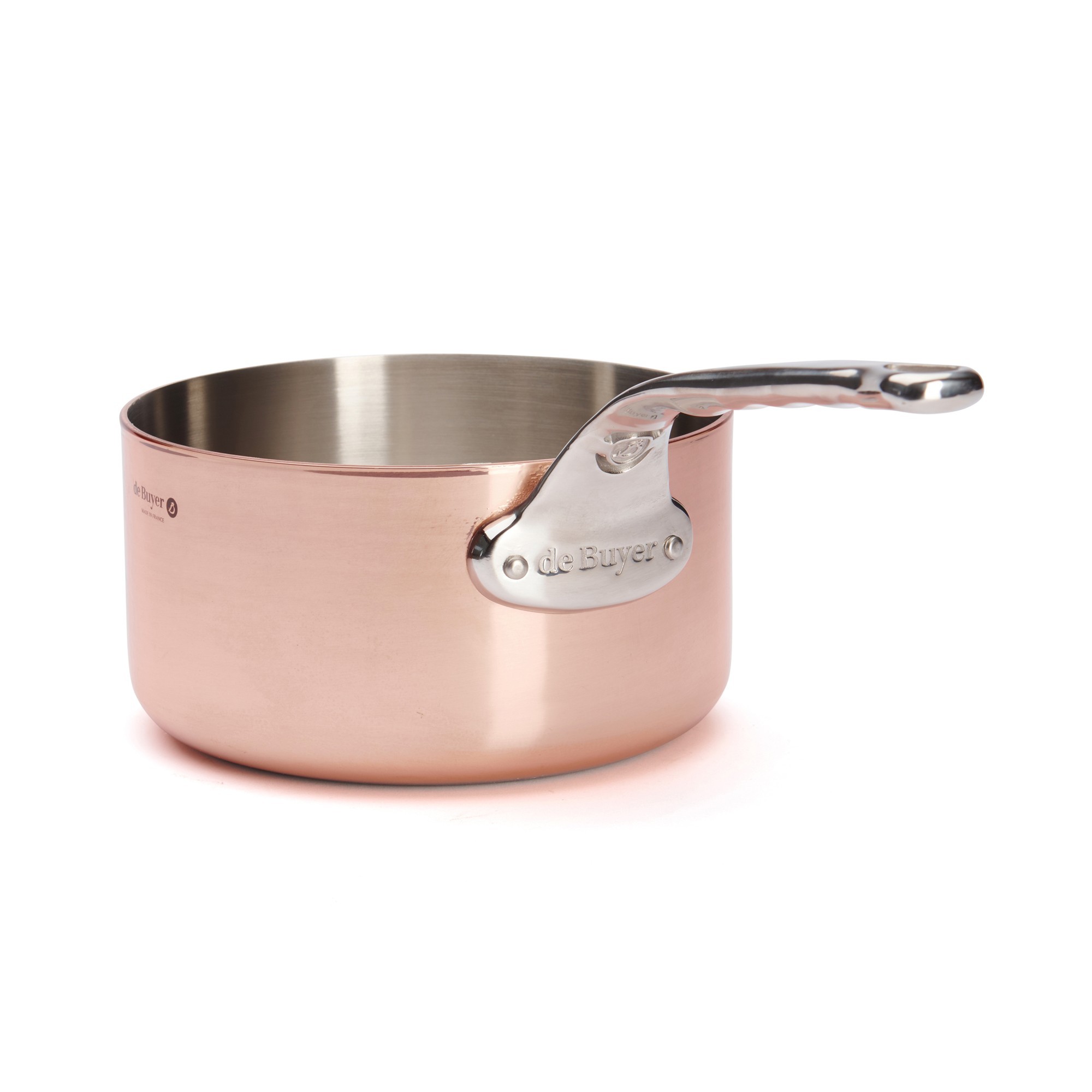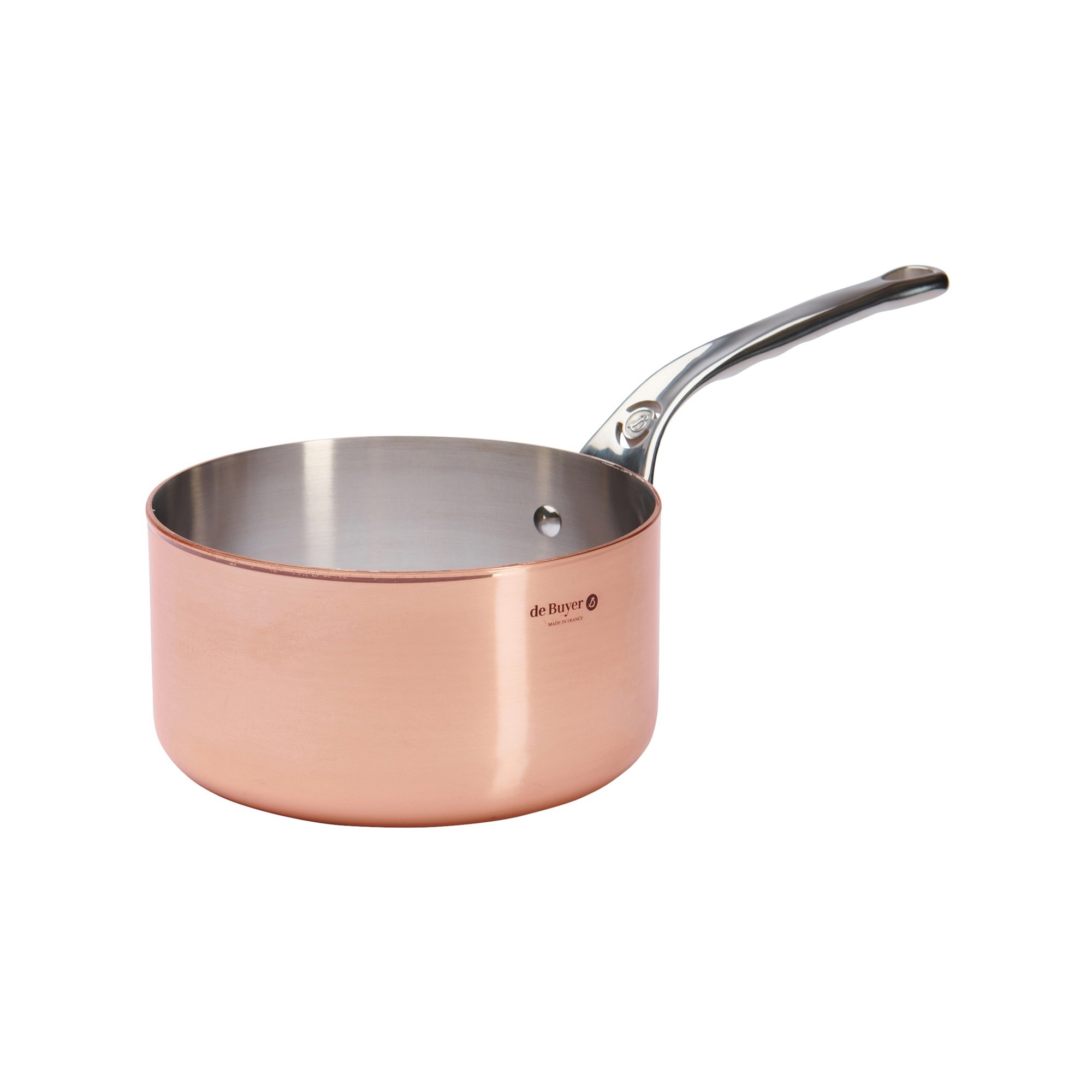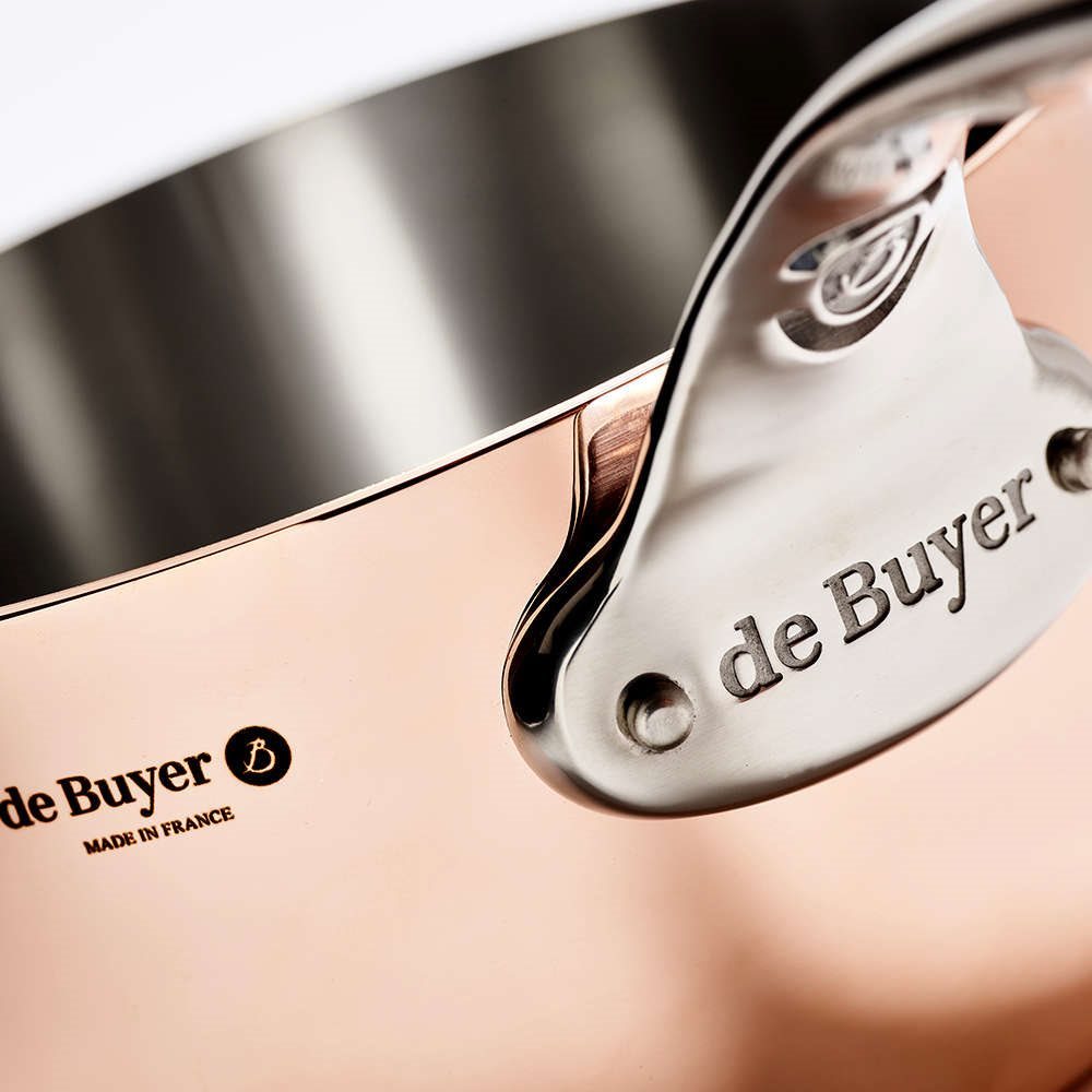 Тенджера за сосове, марка de Buyer, с диаметър 18 см, изработена от мед отвън и неръждаема стомана отвътре, капацитет 2,5 л, висок 10 см. Процентът на медта, използвана при производството на тенджерата, е 90%, а използваната вътре неръждаема стомана представлява 10%.