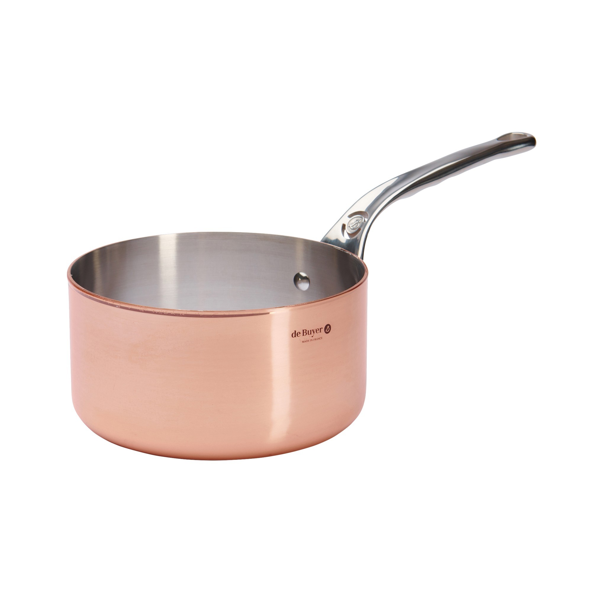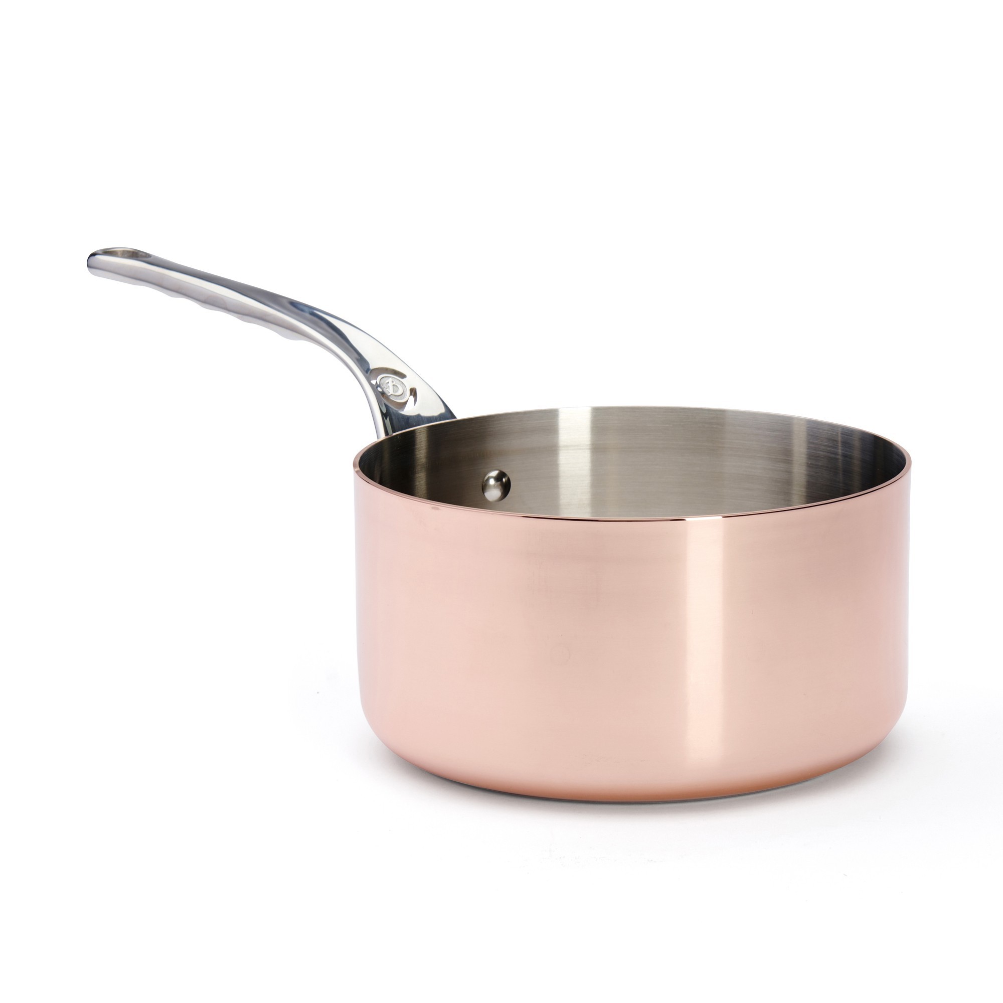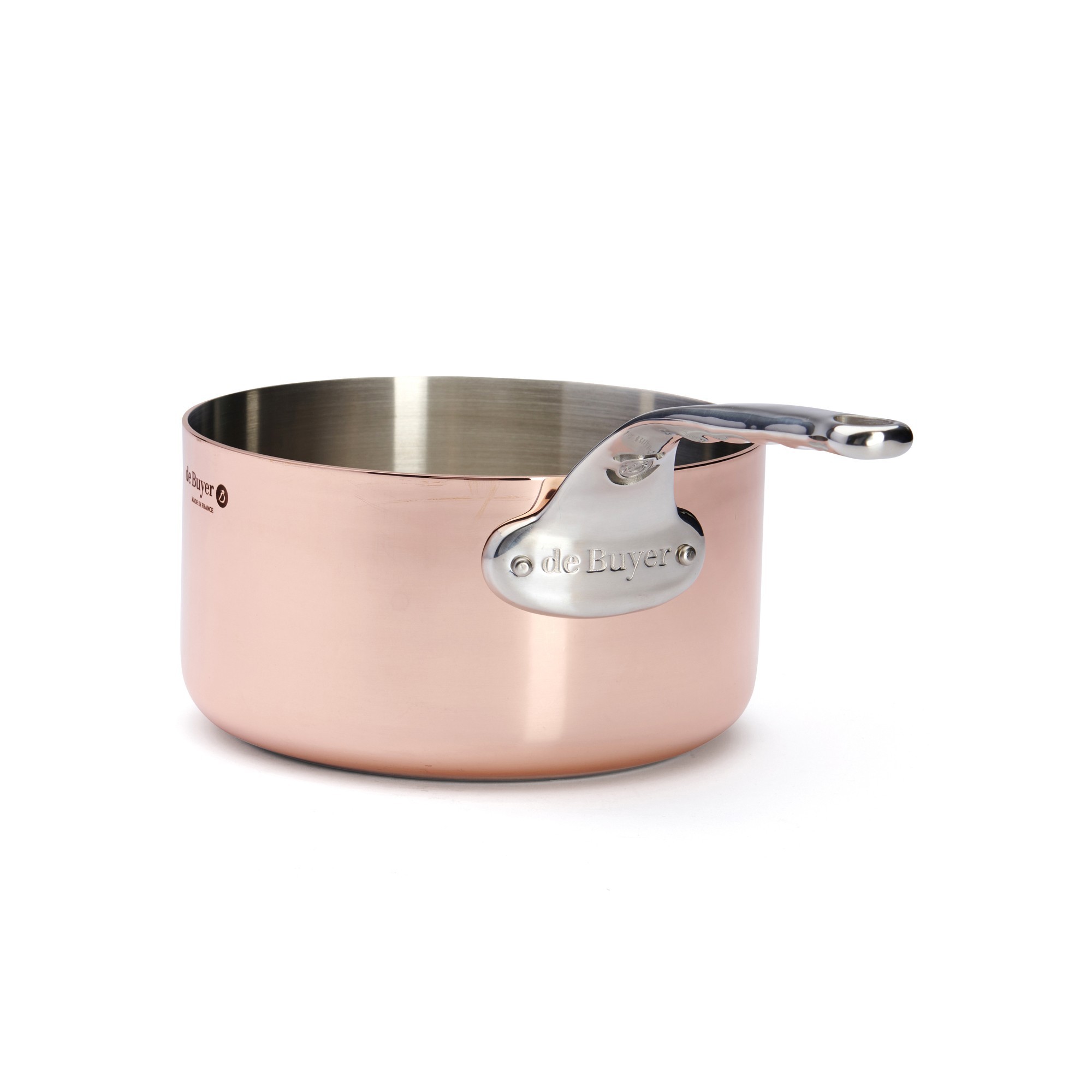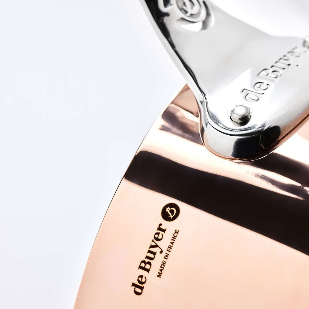 Тенджера за сосове, марка de Buyer, диаметър 20 см, направена от мед отвън и неръждаема стомана отвътре, капацитет 3,3 л, височина 10,7 см. Процентът на медта, използвана при производството на тенджерата, е 90%, а използваната вътре неръждаема стомана представлява 10%.