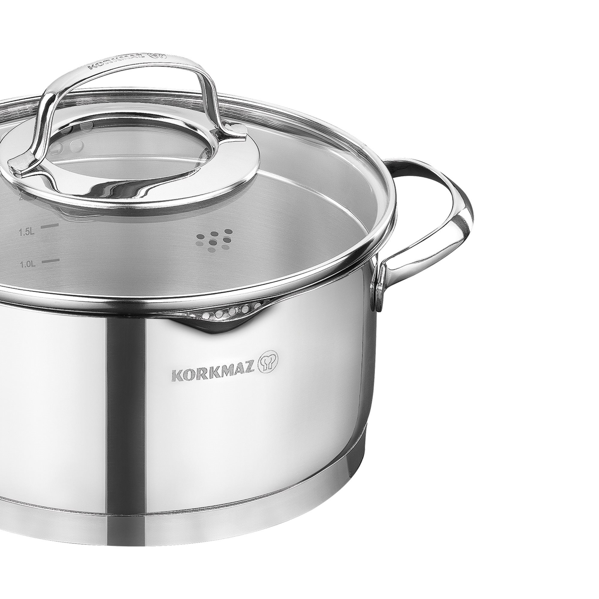 Дълбока тенджера, с термоустойчив стъклен капак, диаметър 20 см, вместимост 3 л, изработена от неръждаема стомана 18/10 Cr-Ni (хром-никел), марка Korkmaz.