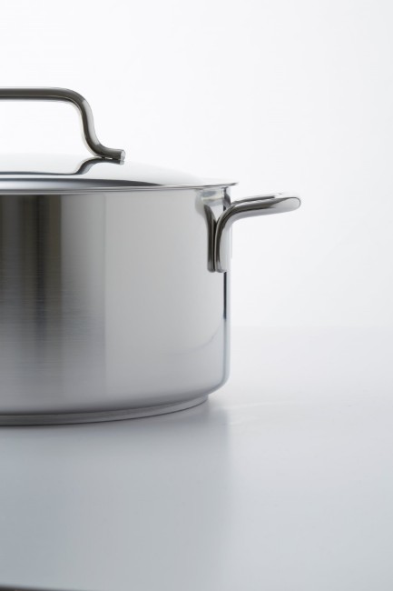 Тенджера с капак, марка Demeyere , диаметър 20 см, вместимост 3 л, изработена от неръждаема стомана 18/10 с матово покритие и заварени дръжки от неръждаема стомана.